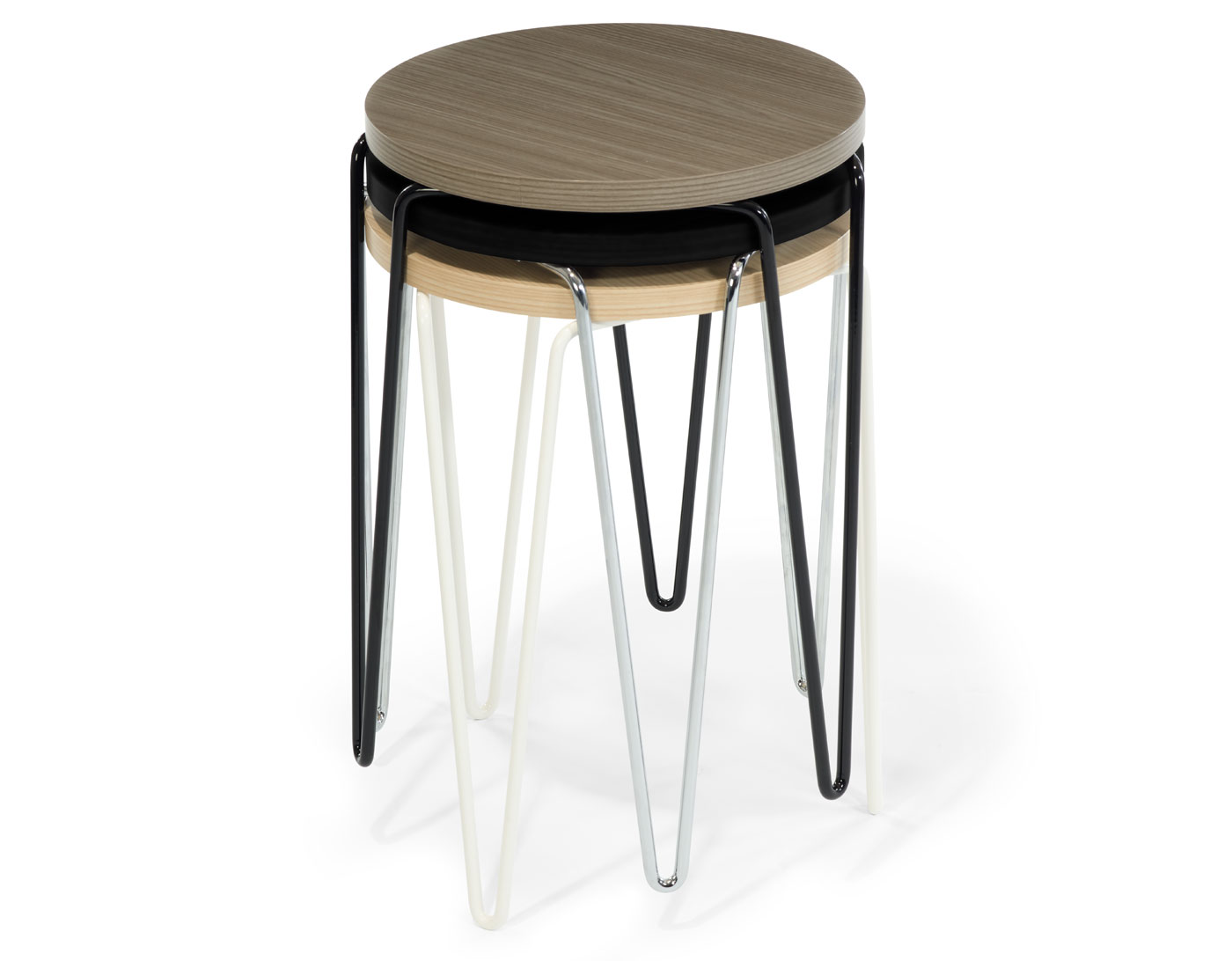 The Model 75 stool has been reintroduced as the Hairpin Stacking Table, which will be made with either a powder-coat or chromed steel base and MDF top sandwiched between laminate with laminate edge. The woodgrain laminates tops have matching woodgrain ABS edge. The table can stack five high and Includes three nylon bumpers underneath the top to prevent scratches when tables are stacked. As Florence Knoll always intended, the Stacking Table does not just hold its own as a timeless piece of design-it proves its true value in its ability to round out the composition of any inhabited space.
