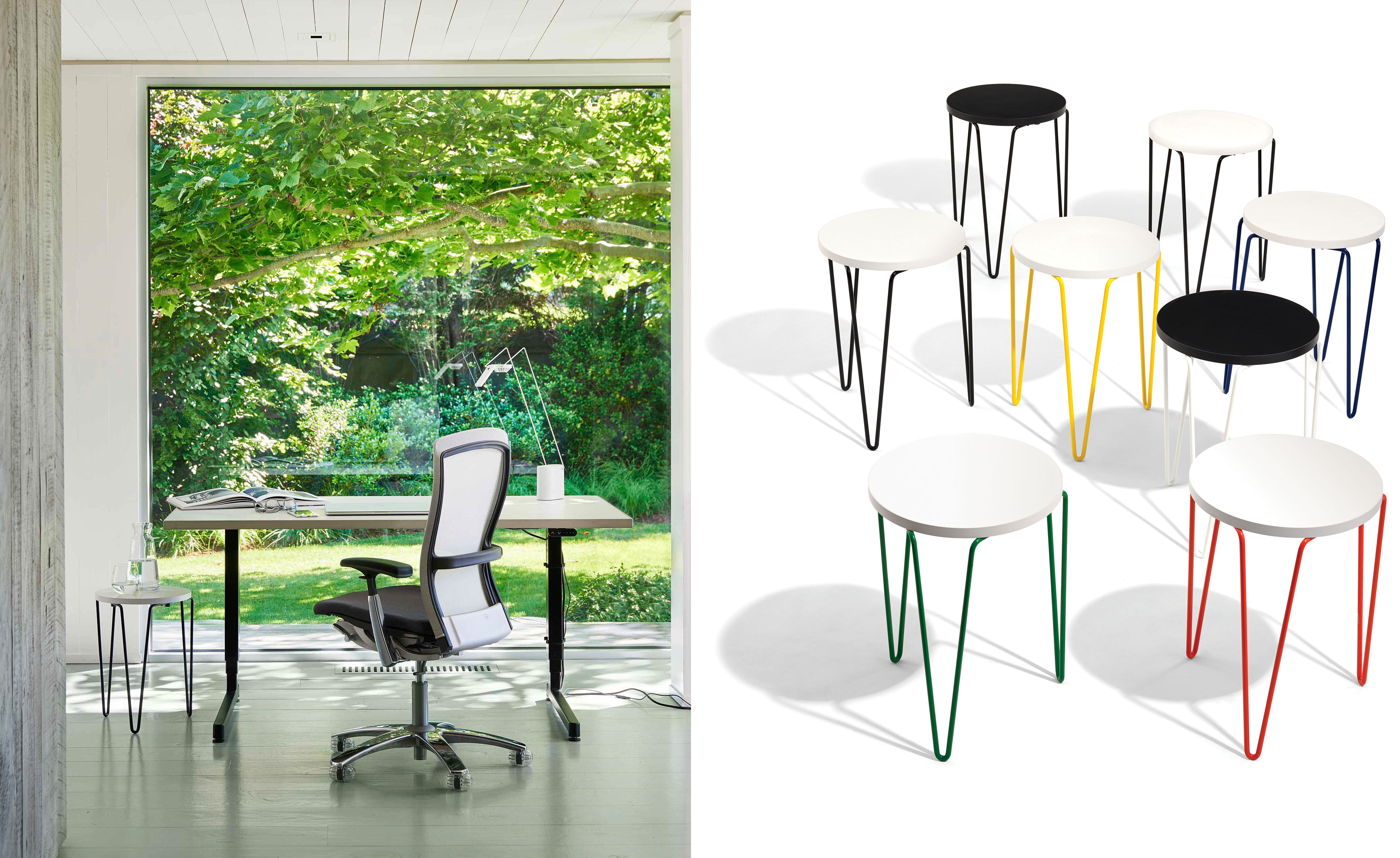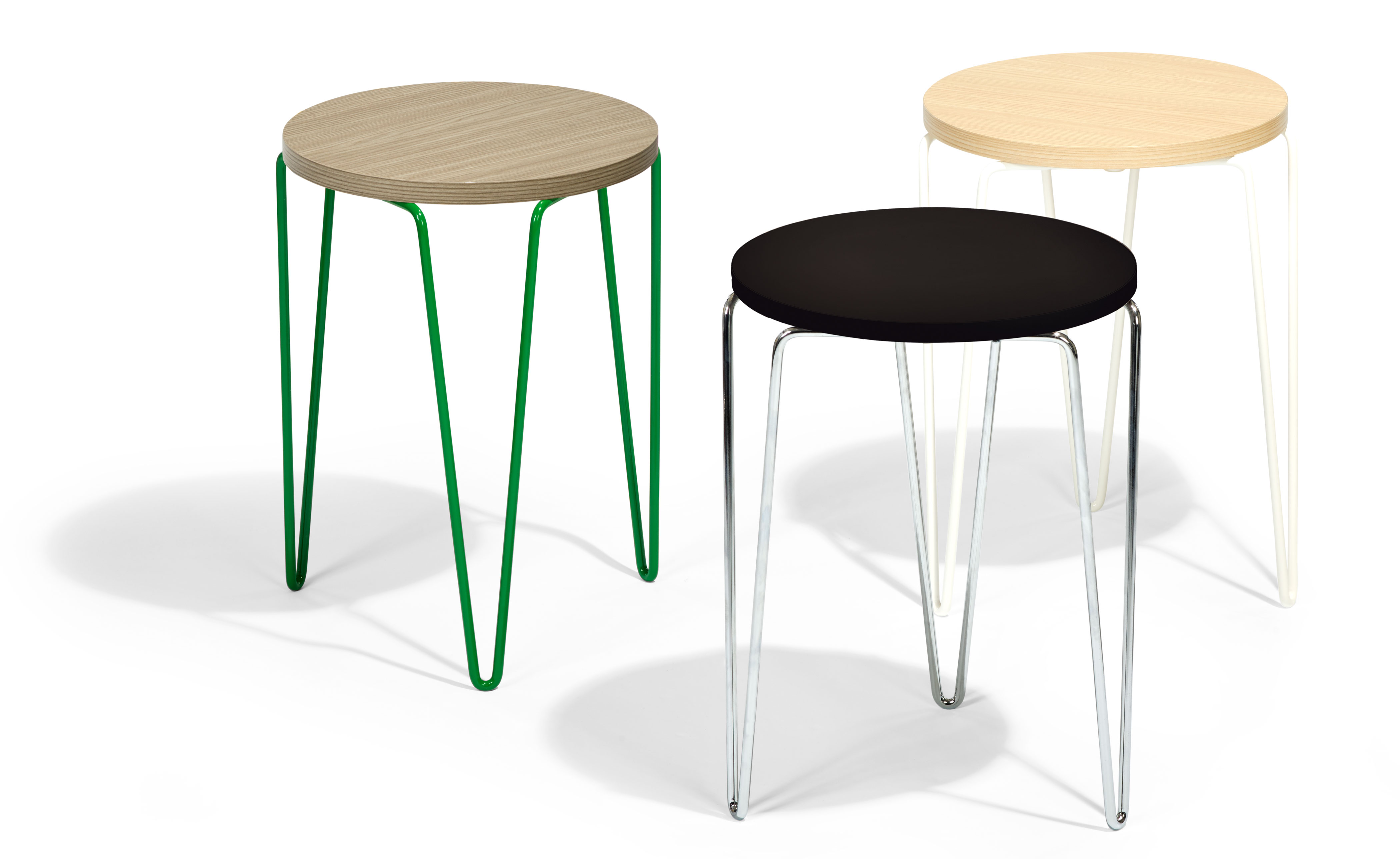First introduced in 1948, Florence Knoll's Model 75 stacking stool was an instantly popular addition to what was then still a small catalog of furnishings from Knoll Associates. With its ingeniously simple three-pronged wire base granting it its "hairpin" moniker, the Model 75 stool is now reintroduced as the Hairpin Stacking Table.