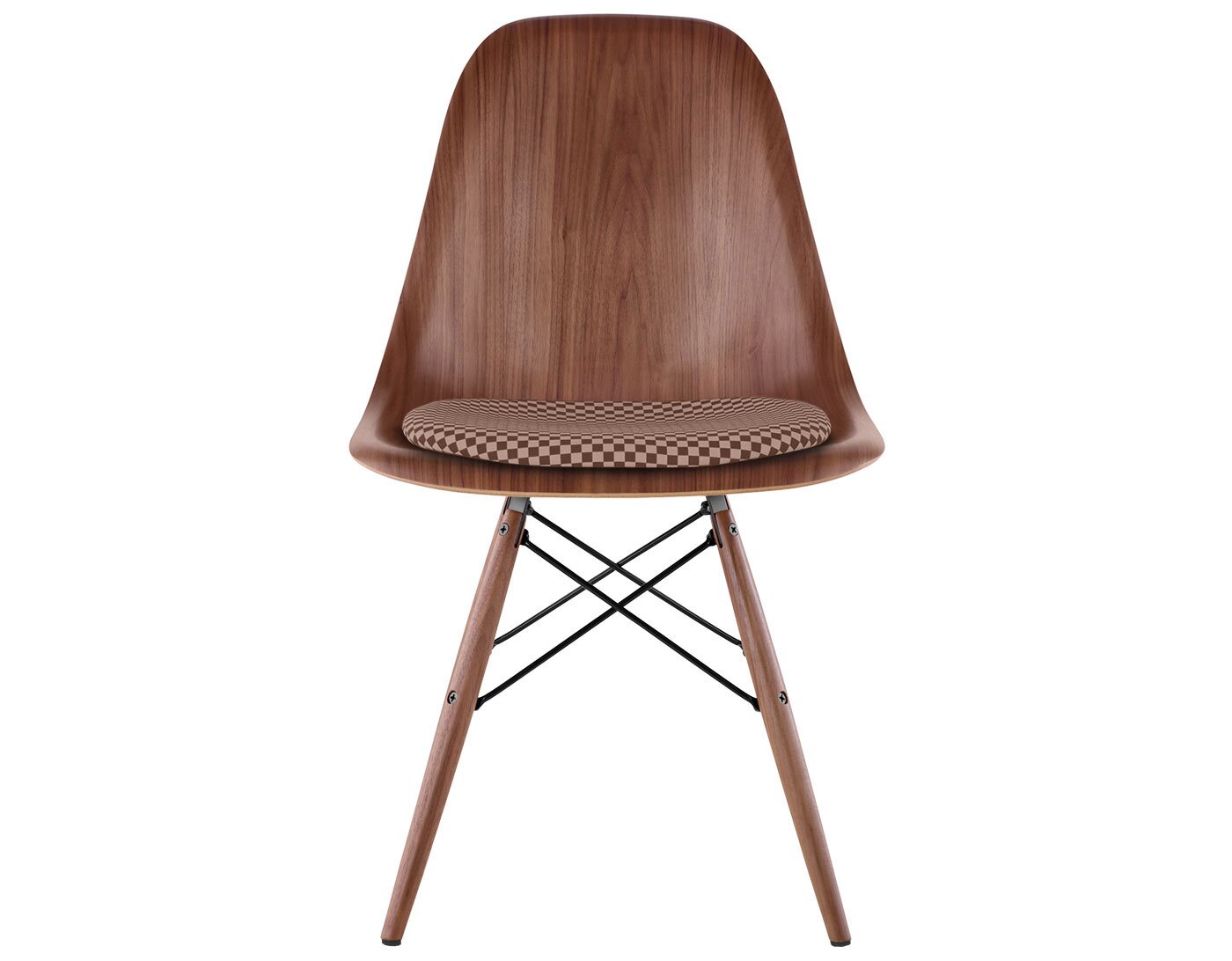 The side chair is a molded one piece construction with waterfall edges and measures .260" in thickness. The Veneered shell is available in four wood veneer finishes; White Ash, Walnut, Ebony and Santos Palisander. The dowel base is offered in either maple (white glides), white ash (white glides), ebony (black glides) or walnut (black glides). The seat pad comes affixed to the Eames Molded shell and available in a variety of fabric or leather options.
