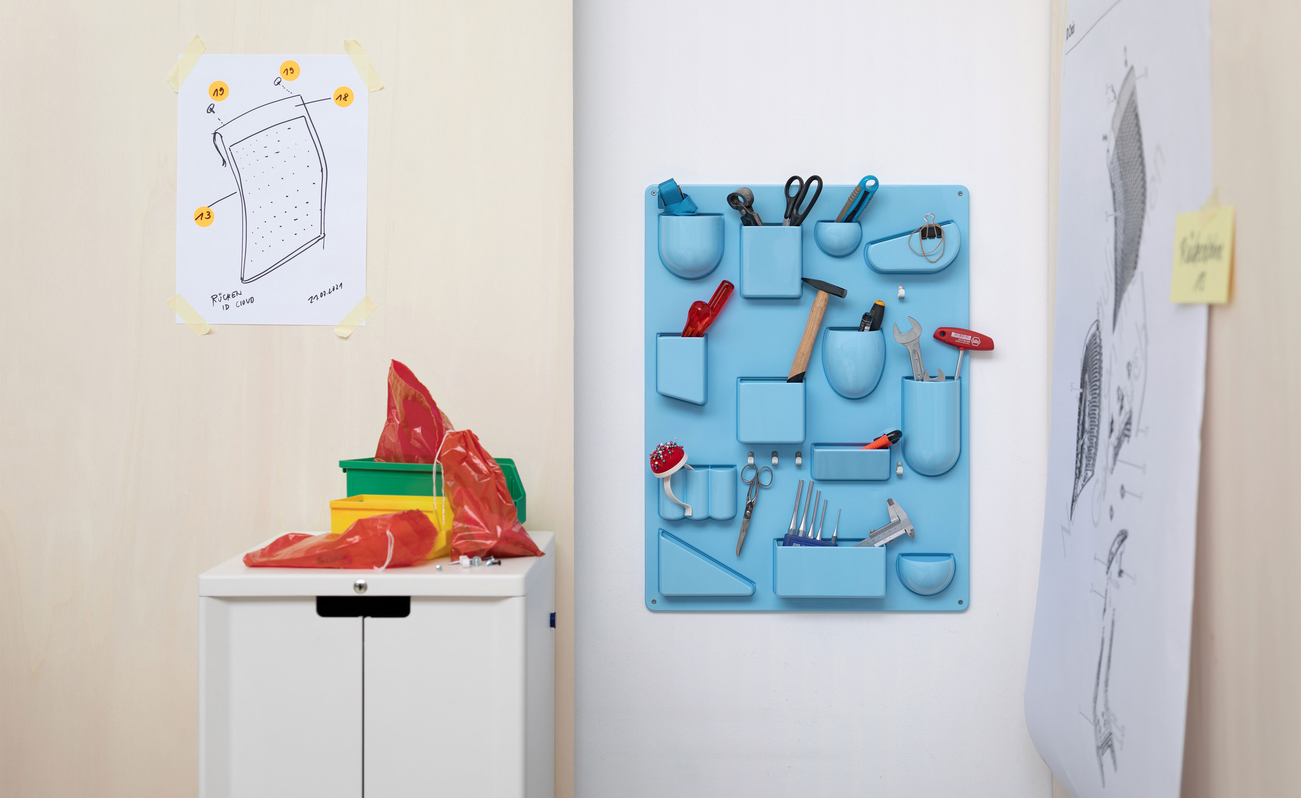 Utensilo is one of the best-known plastic designs of the late 1960s. Today, this colorful wall tidy is a veritable design icon and a true-to-the-original version of the product has been reissued by the Vitra Design Museum. At the end of the 1960s plastic was on its way to becoming one of the dominant design materials. In Italy, designers such as Joe Colombo and Vico Magistretti designed bright and cheerful furniture, luminaires and consumer goods for innovative manufacturers such as Artemide and Kartell. With the Bofinger Chair and the Panton Chair, the first seats made entirely of plastic appeared. At the same time in Munich Ingo Maurer, who had already attracted attention with his "Bulb" luminaire, launched a plastic wall tidy, Uten.silo, which created quite a stir in the design community.