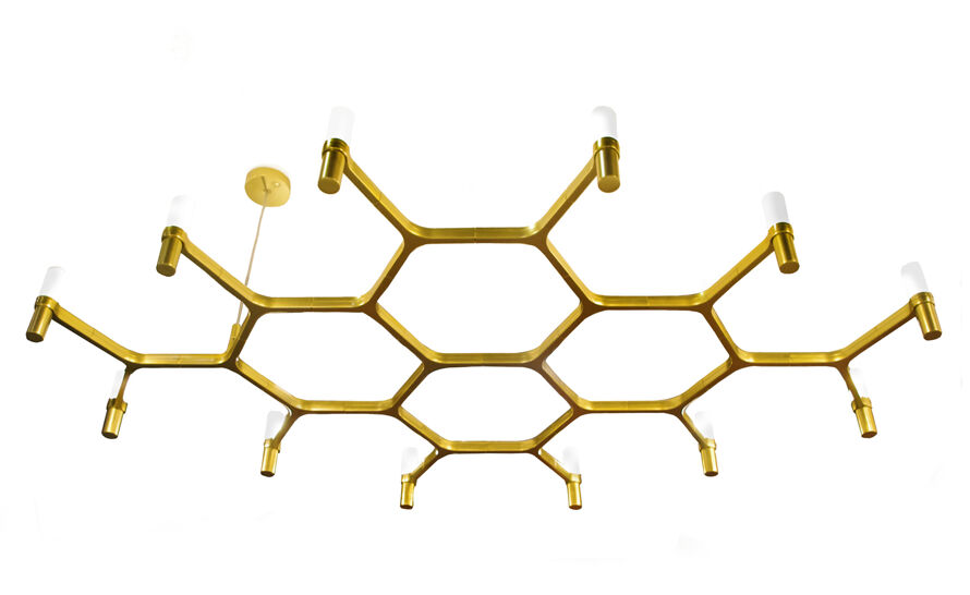 Utilizing an organic yet modular structure, the crown series of pendant lamps are available in an assortment of distinct configurations. The crown plana pendant lamp borrows from the composition of a snowflake in order to create a plane of light above any interior space. The frame is rigid die-cast aluminum available in white, black, gold painted, polished aluminum, and gold or black plated. The diffusers are sandblasted glass.