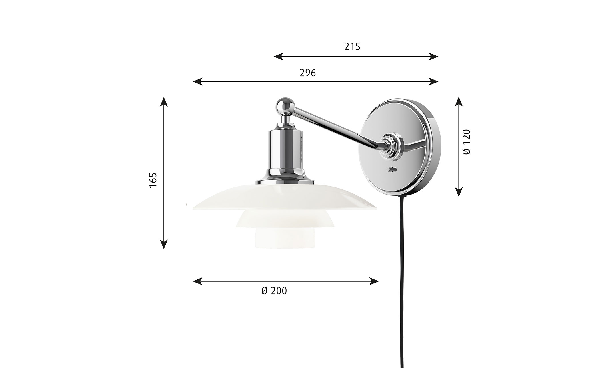 PH 2/1 wall lamp provides soft illumination. It is based on the principle of a reflecting multi-shade system, producing glare free illumination. The fixture is offered with white, handblown opal glass shades and a chrome plated spun brass base. Mounts directly to a finished surface over a 4" octagonal junction-box. This version includes an on/off switch on the wall plate and no external cord.