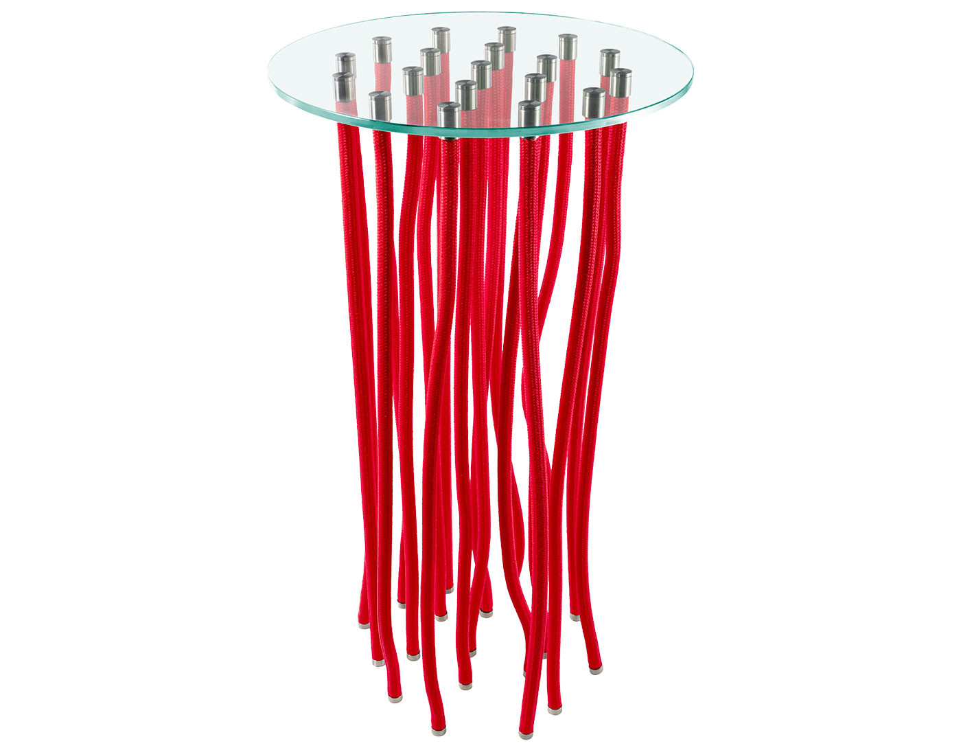Org has a round top and white, red or black polypropylene legs with stainless steel end caps. Available in a side table and console table heights.