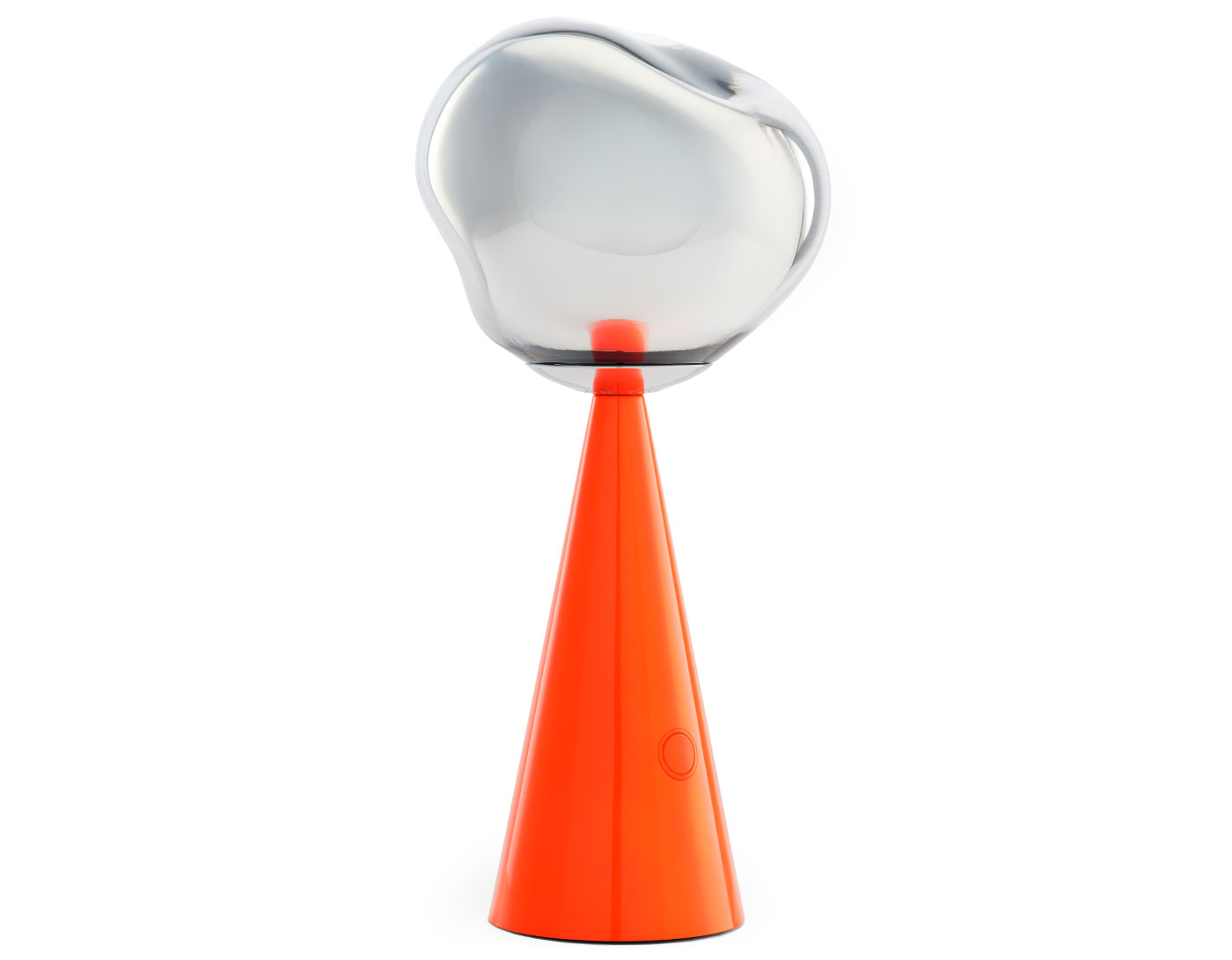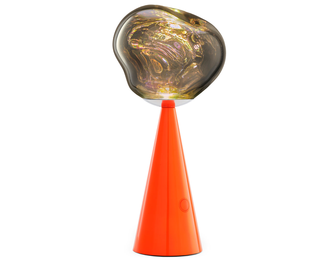 Melt Portable LED expands the collection, offering the same mesmerizing hot-blown glass effect within a portable design. Melt is created through a process of blow moulding and vacuum metallization to achieve melted orbs with abundant and unusual luminosity. The Melt LED Table Lamp is available with a fat cone base & in a wide range of finishes.