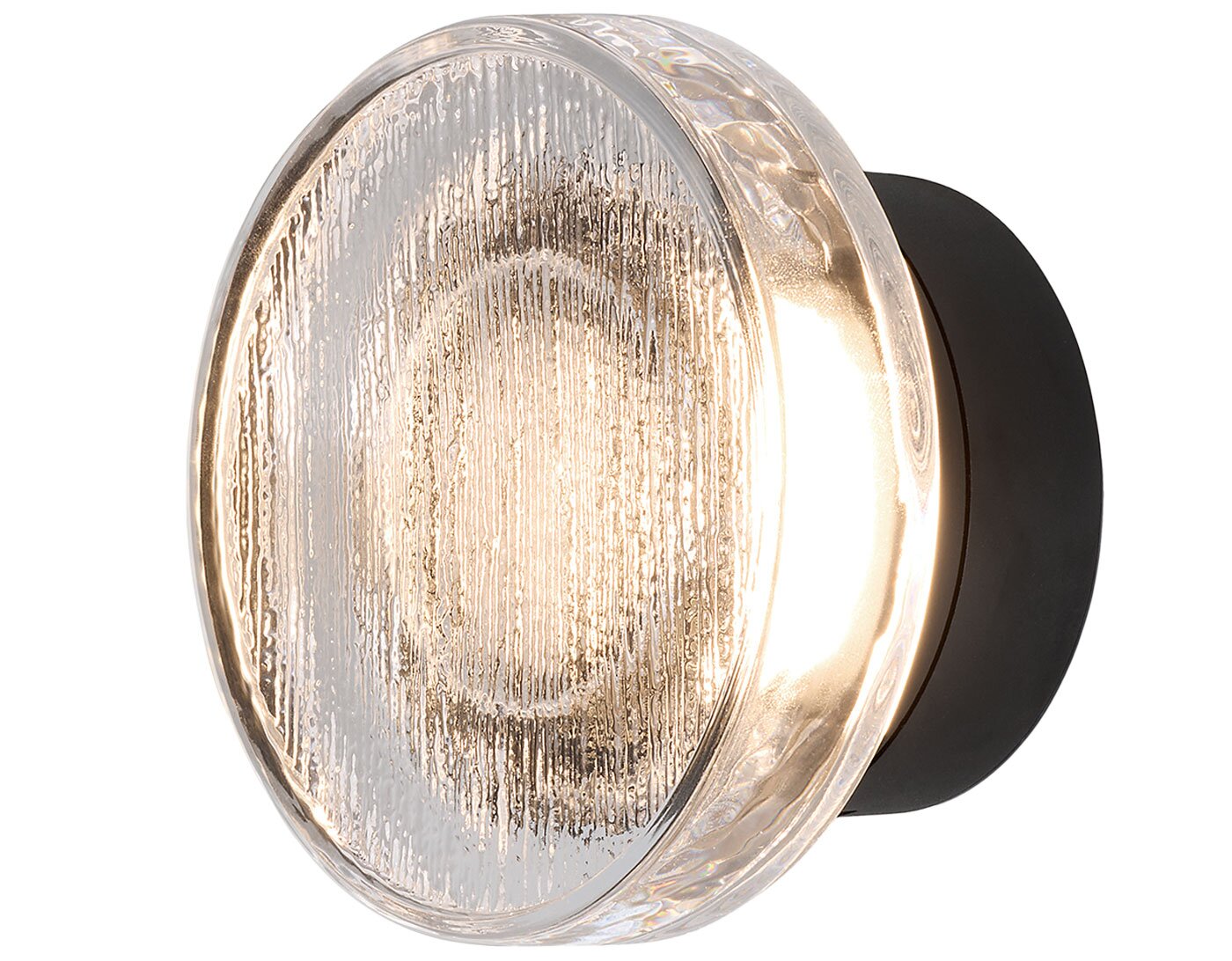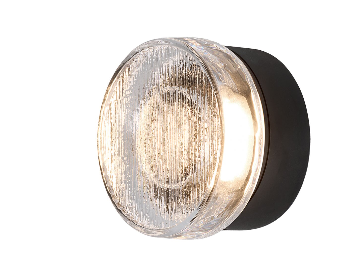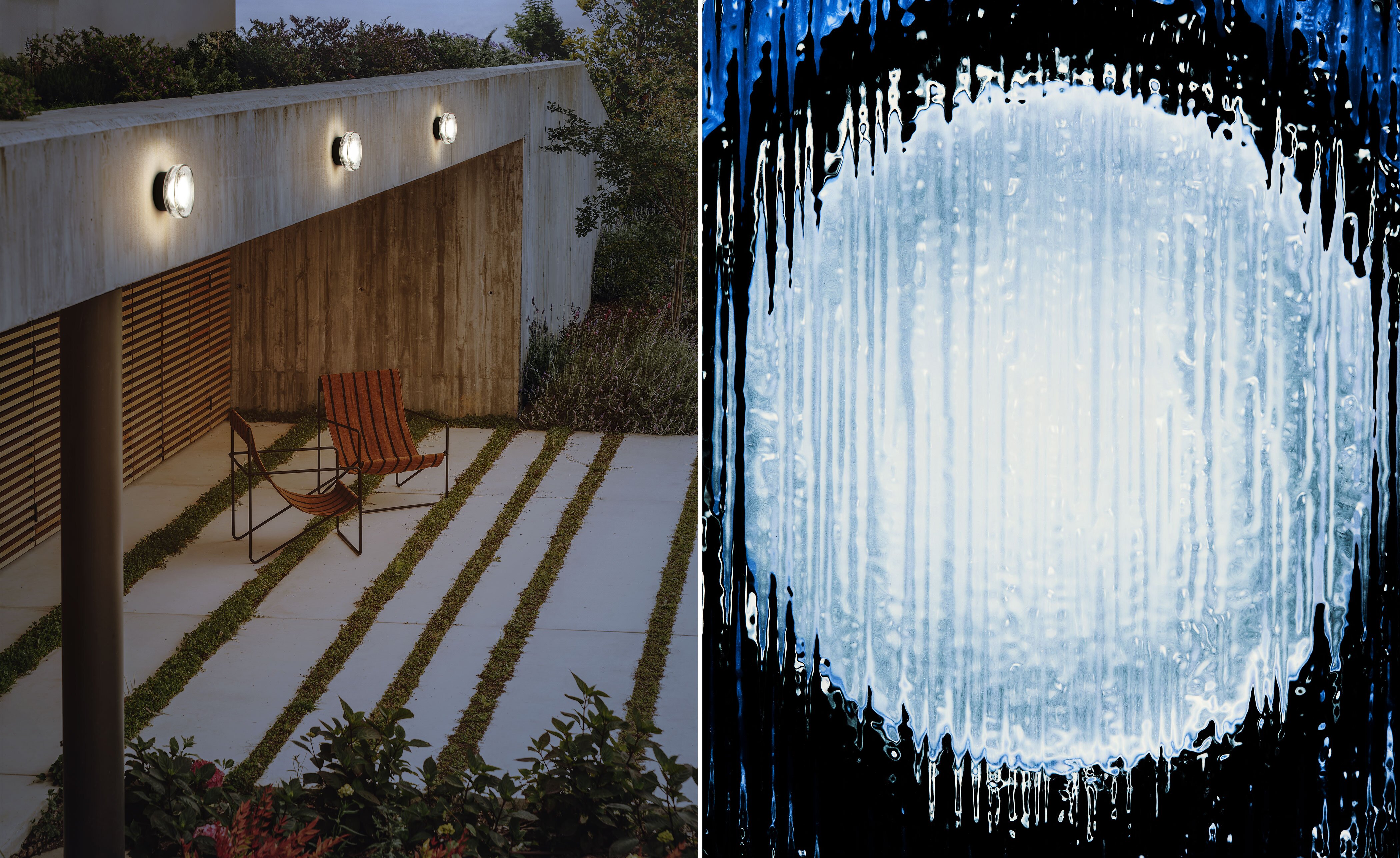 Compact indoor and outdoor wall lamp with a pressed glass diffuser. Its undulating shade covers the light, blurring it. It doesn't settle for just providing light, it also manages to create an ambiance. Roc tempts the senses. It looks like a bright block of ice, and its irregular, almost organic texture beckons to be touched.
