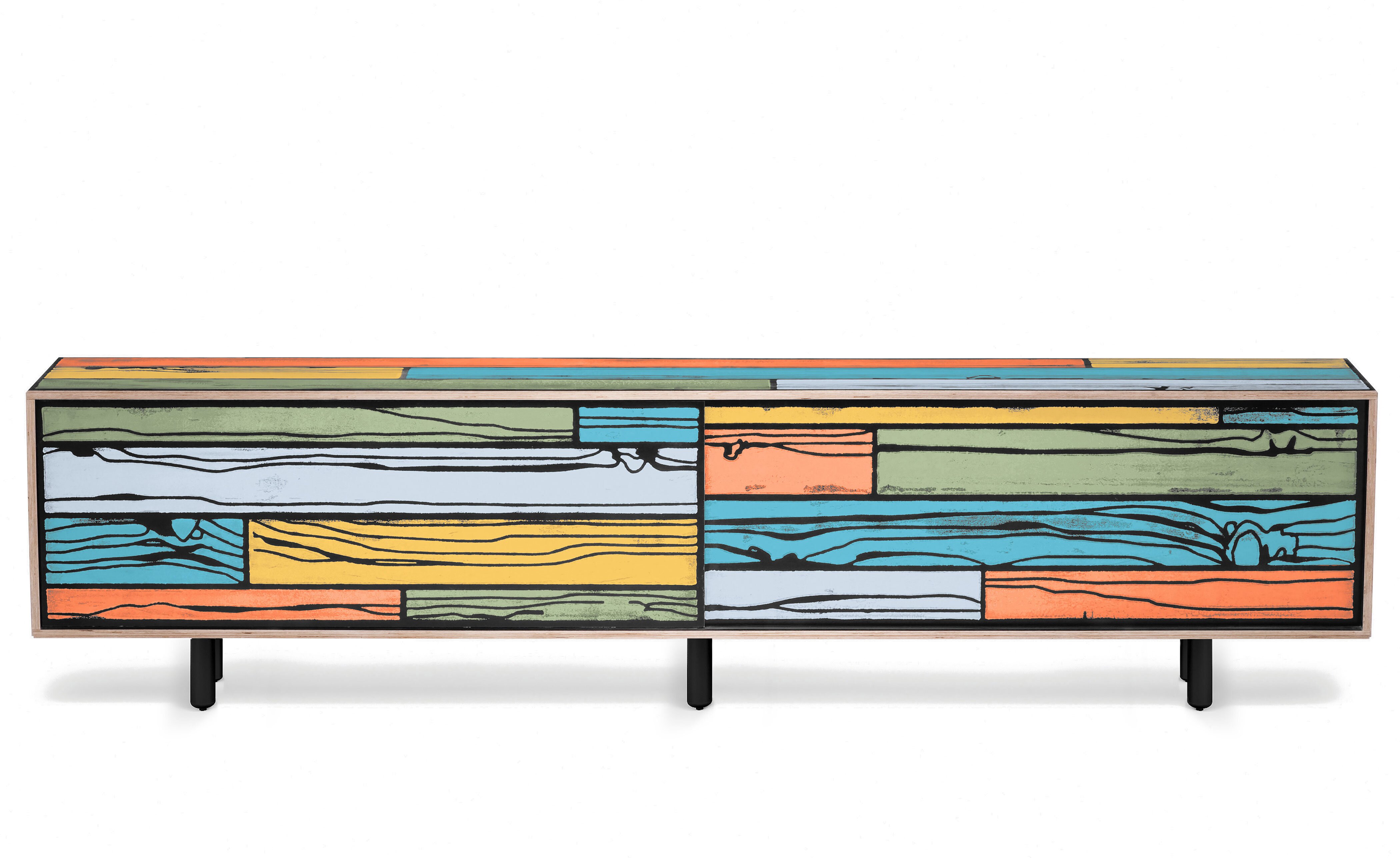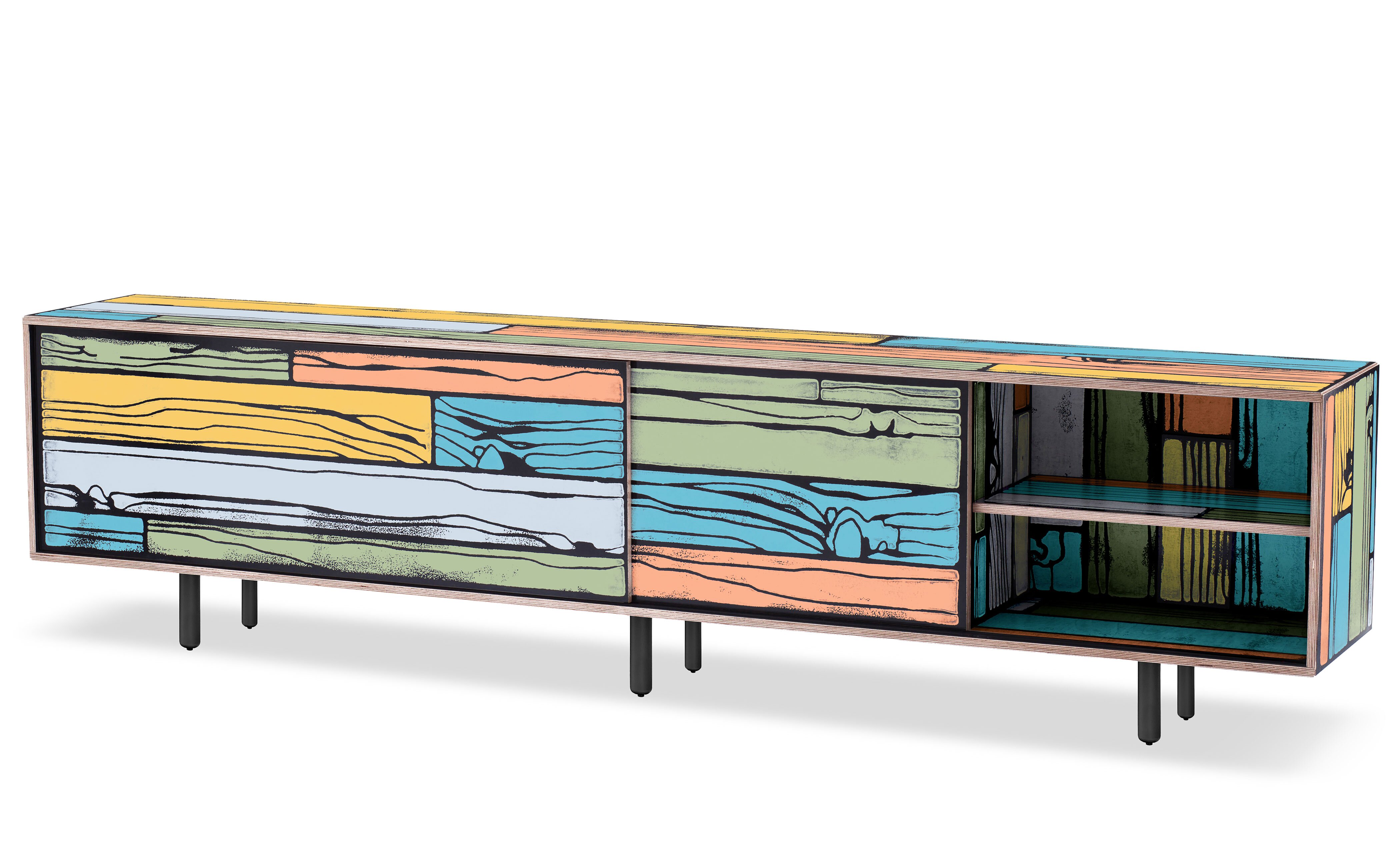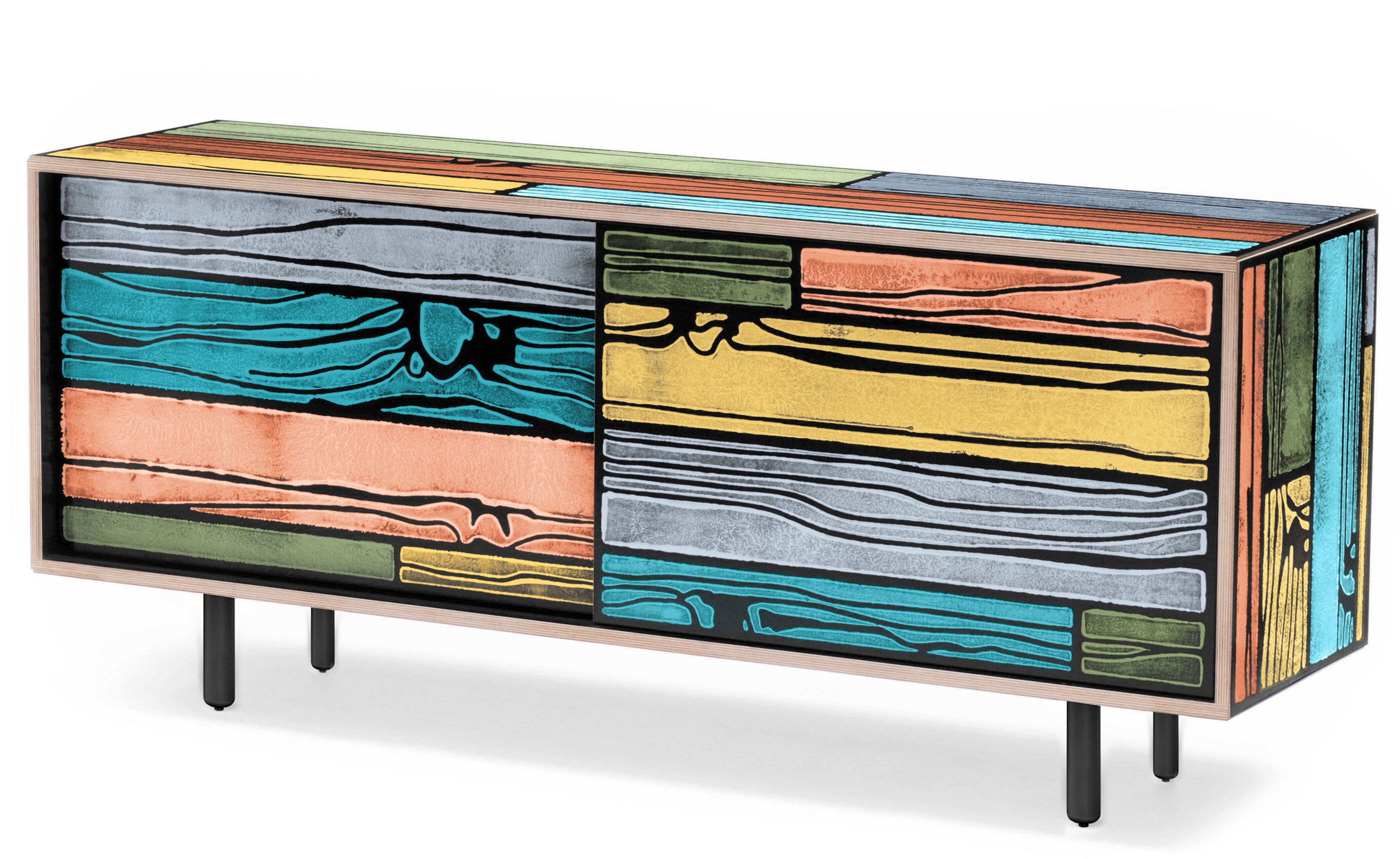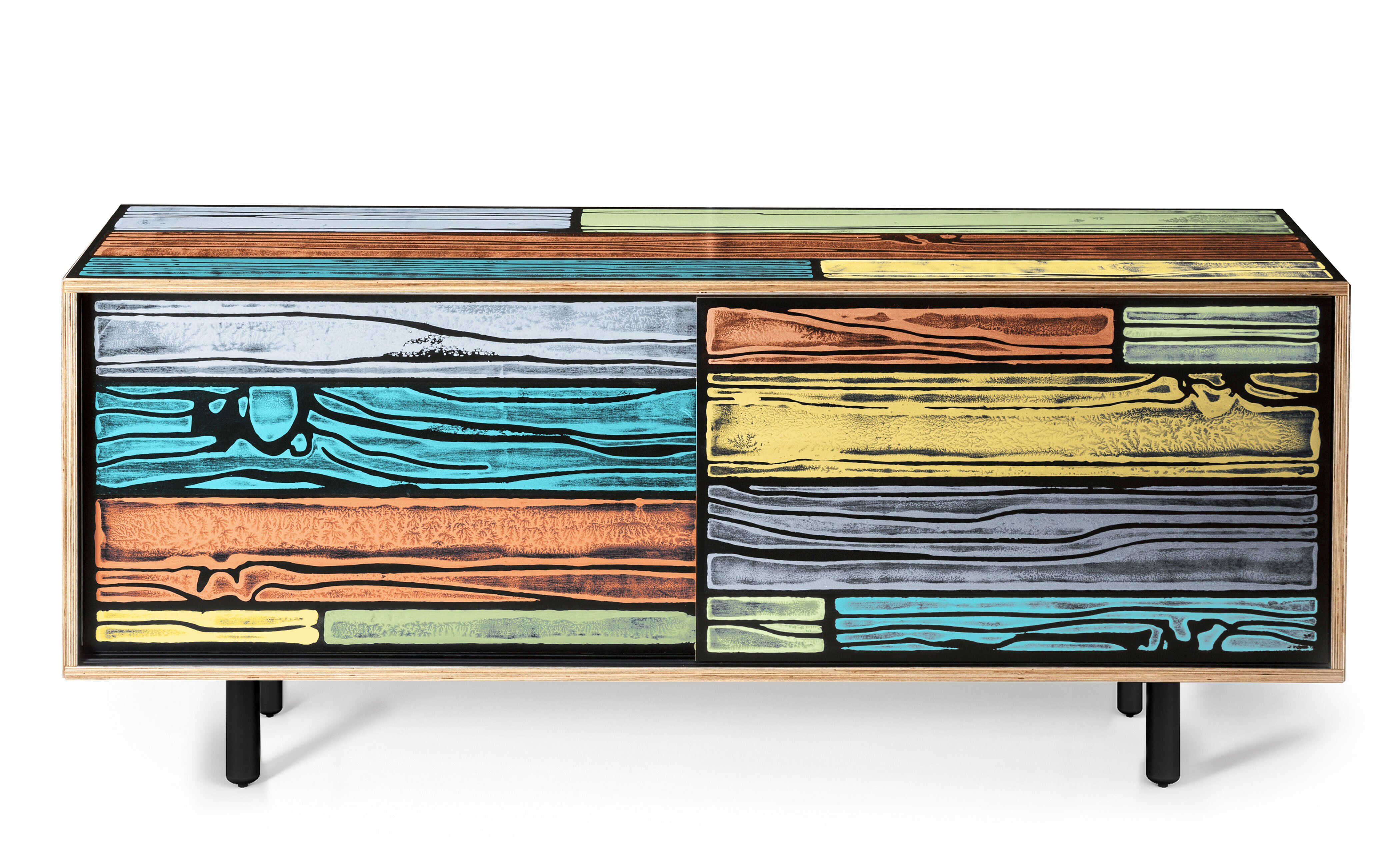 Richard Woods' colorful, wood-grain block prints have become an icon of contemporary design thanks to this enduring collaboration with Sebastian Wrong. Add a touch of character to any space with a WrongWoods Console, features sliding doors and an interior shelf. Available in two widths.