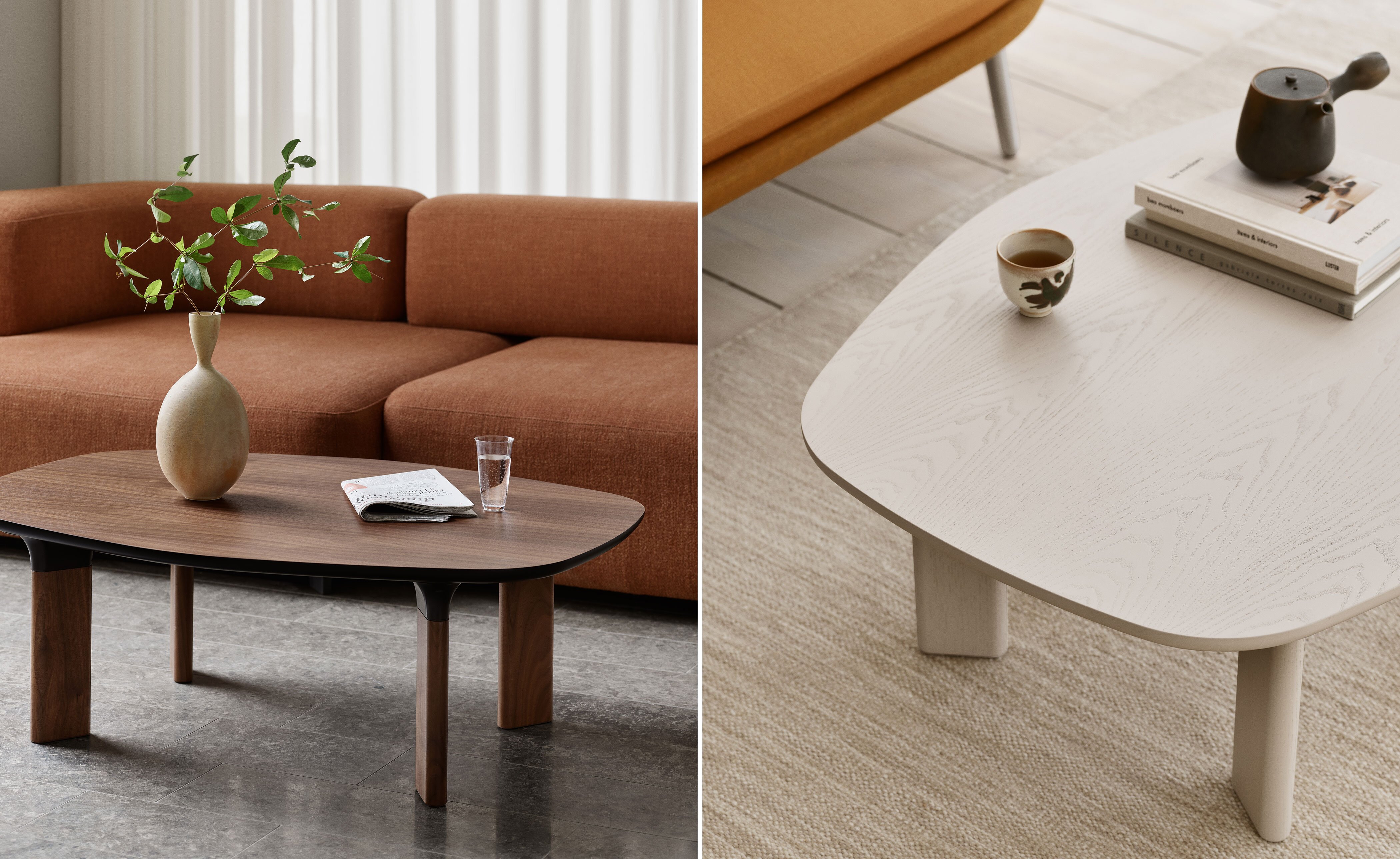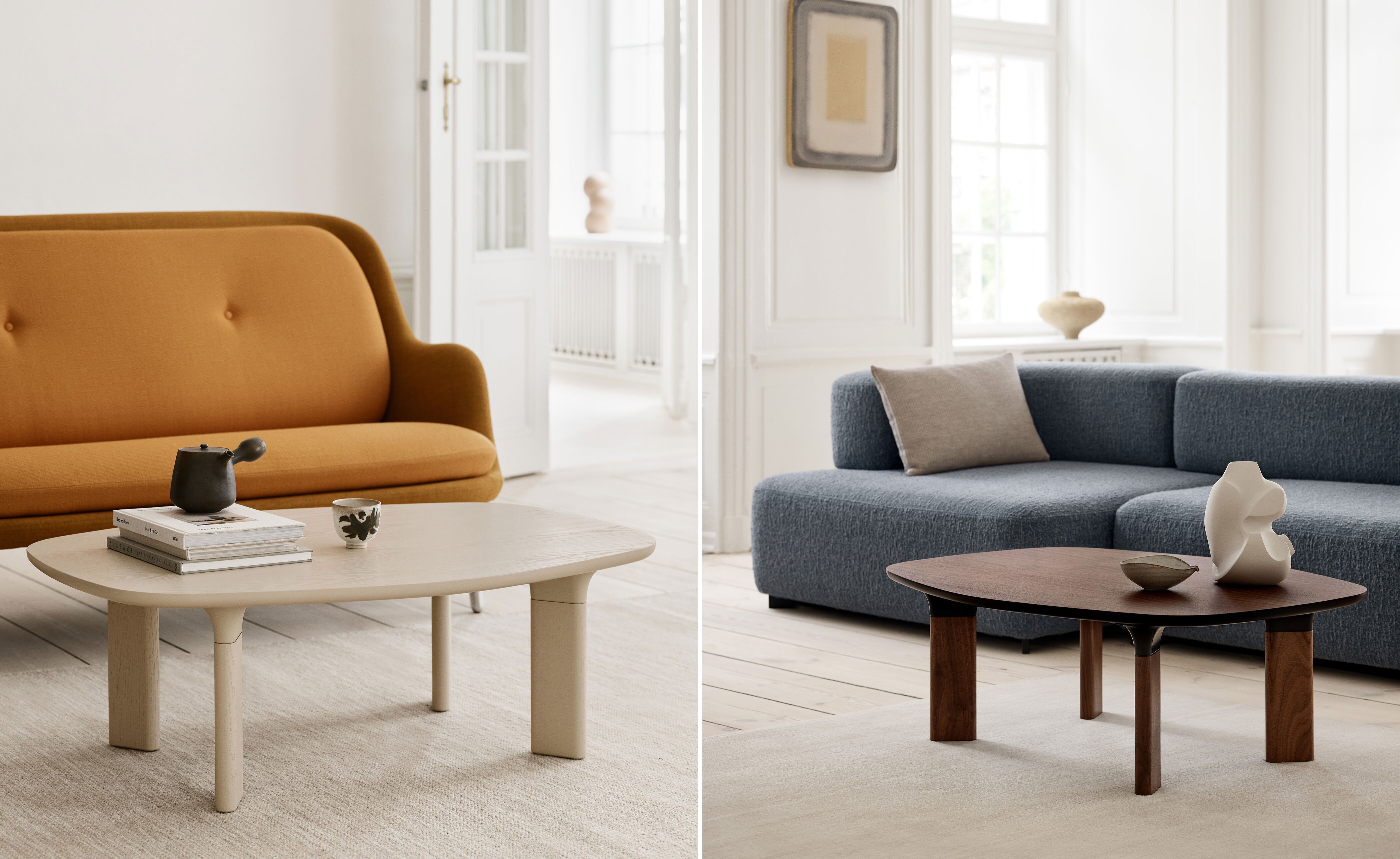 The Analog Coffee Table base consists of four legs made of solid walnut or colored oak. The legs are attached to the veneer table top with a 'trumpet' in powder-coated aluminum.