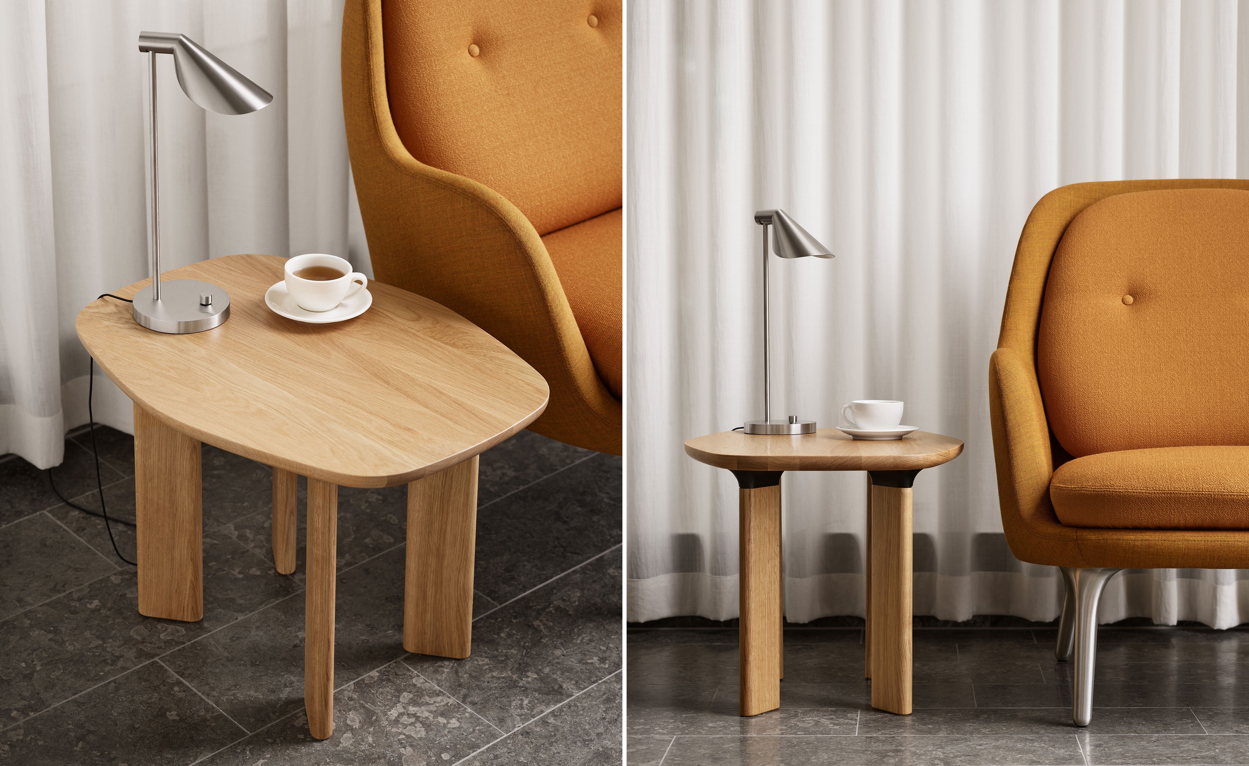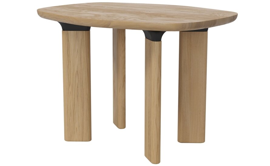 The Analog Side Table base consists of four legs made of solid oak. The legs are attached to the solid oak table top with a 'trumpet' in powder-coated aluminum.