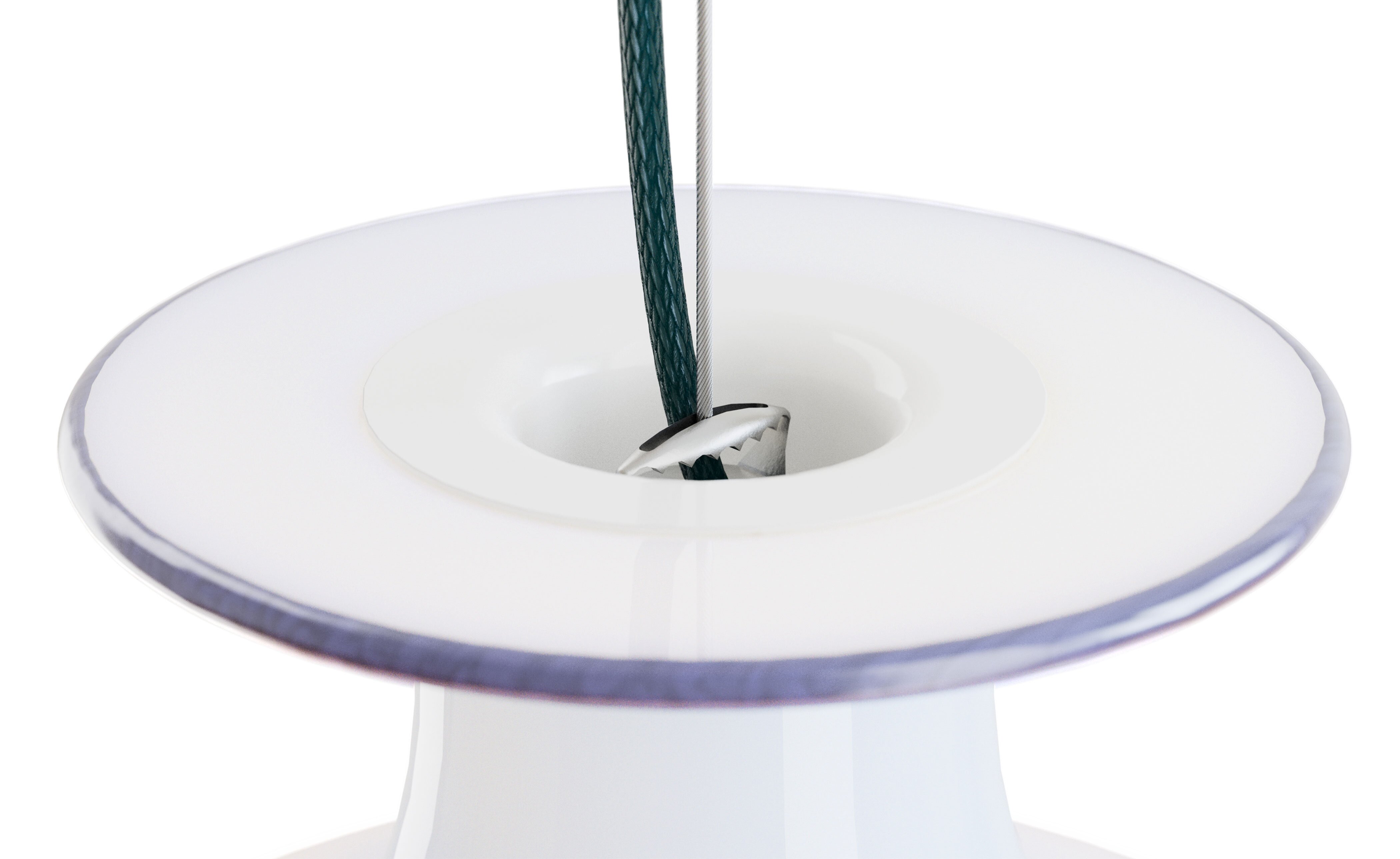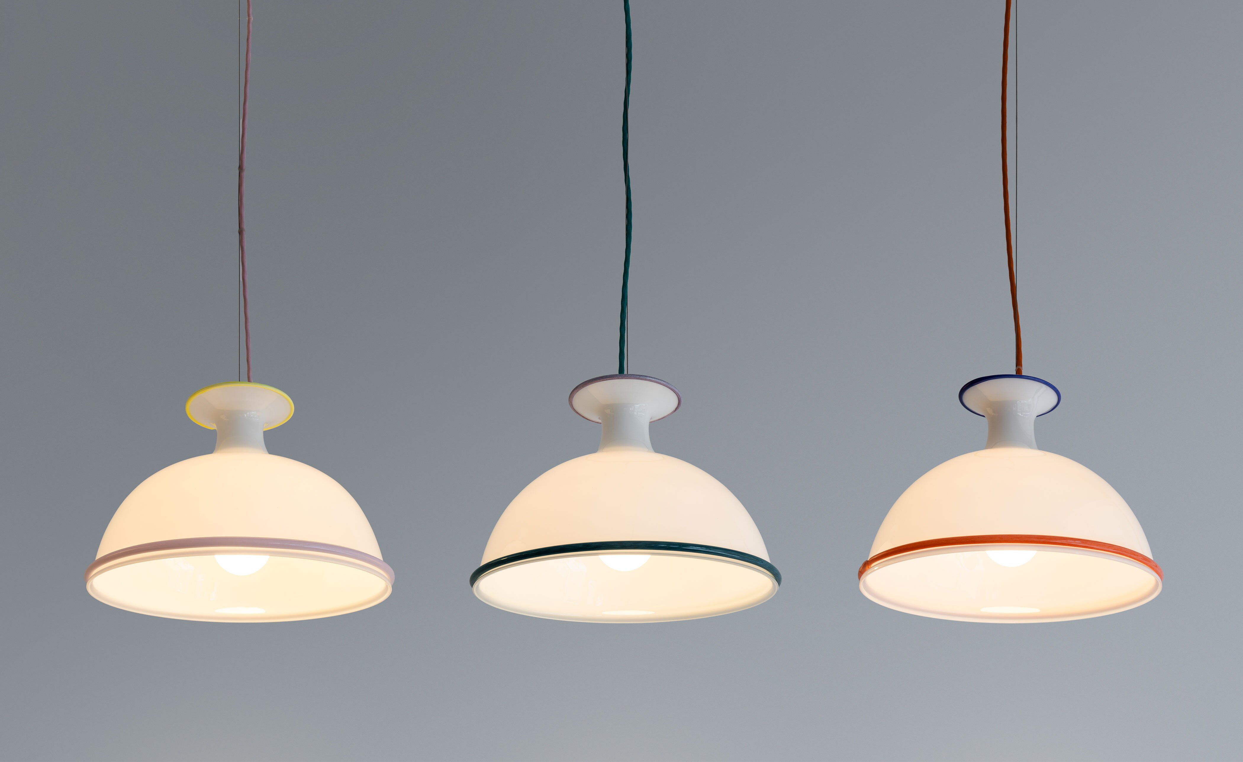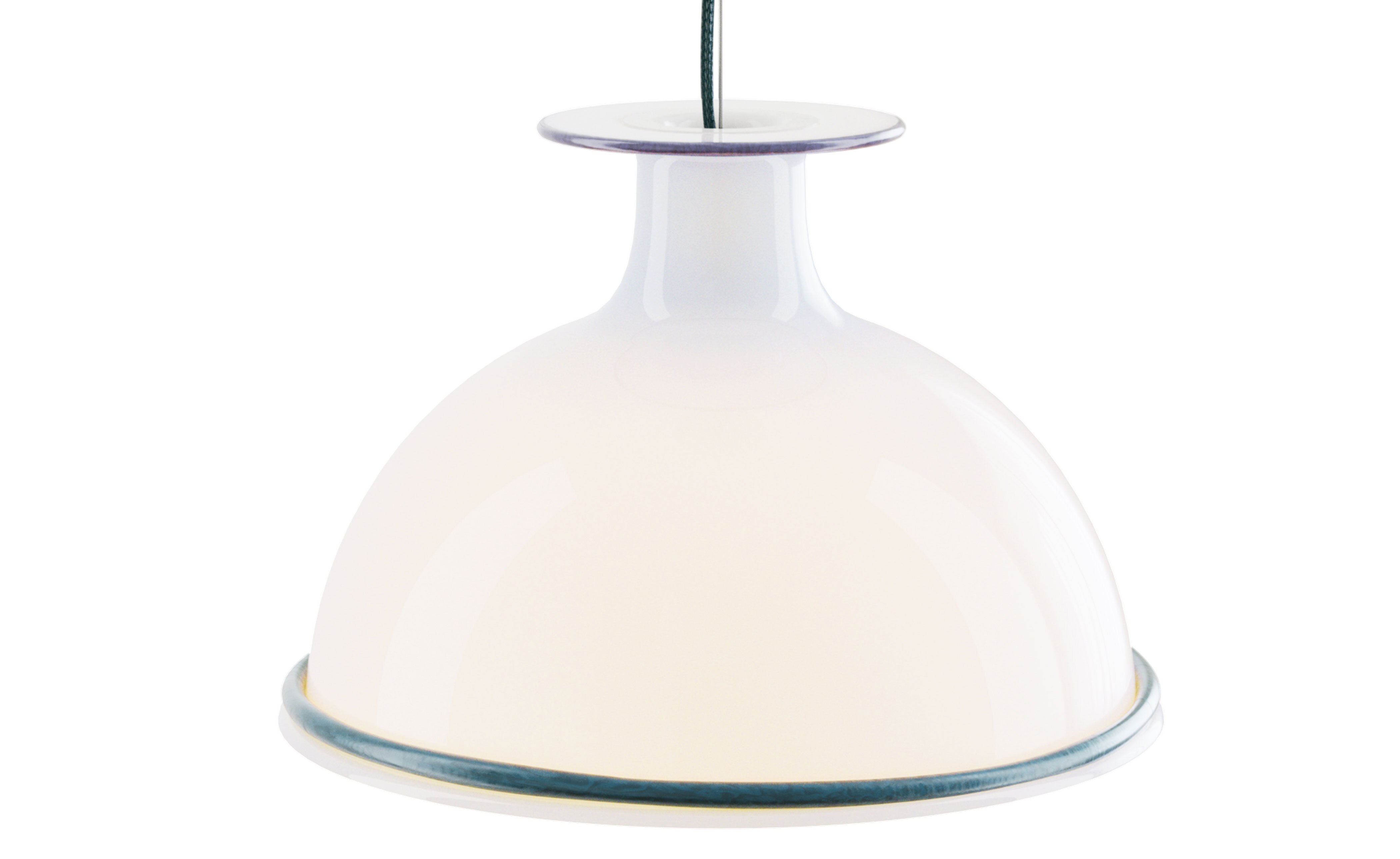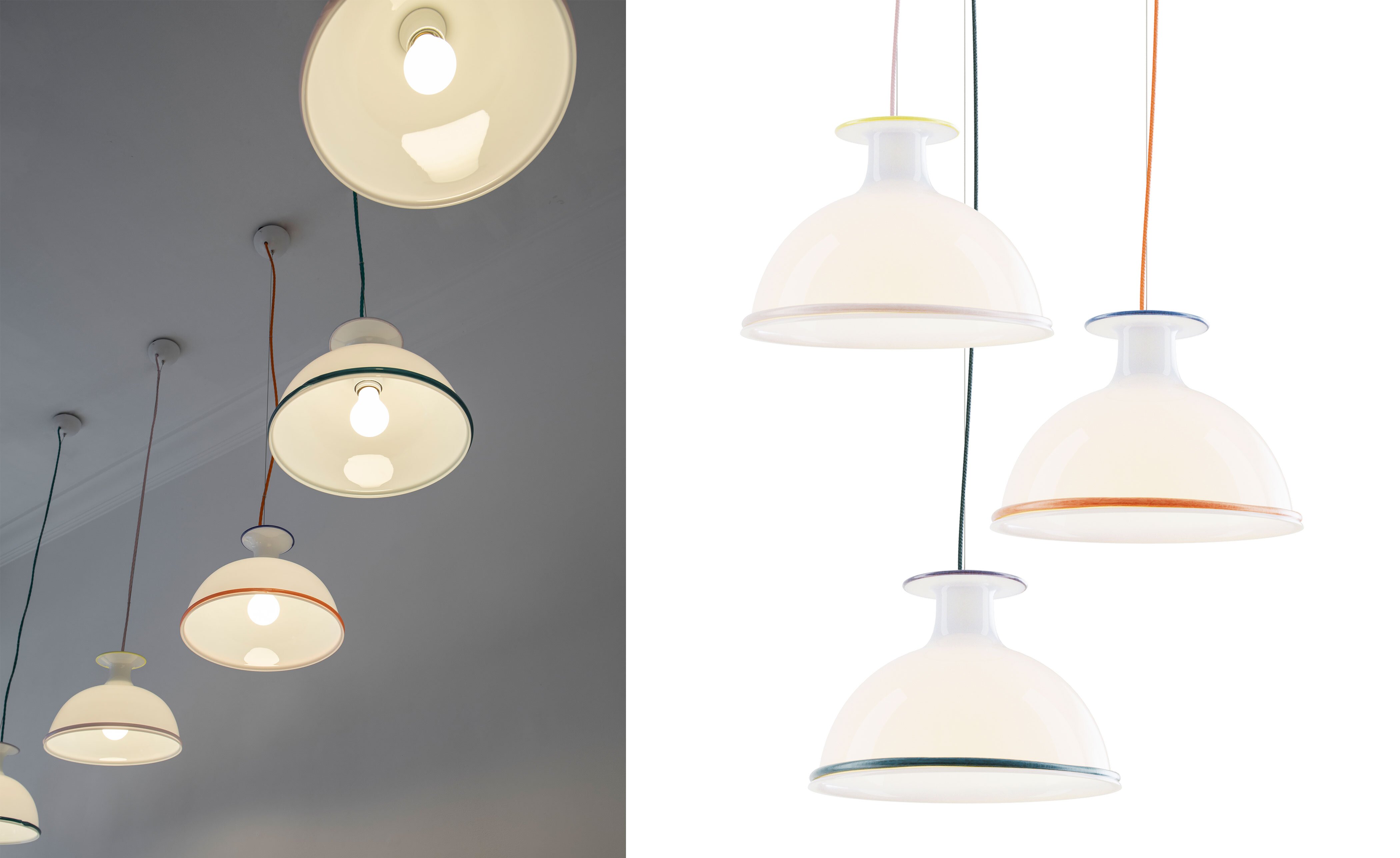 Mouth blown opal glass, powder-coated steel, fabric cord, steel wire