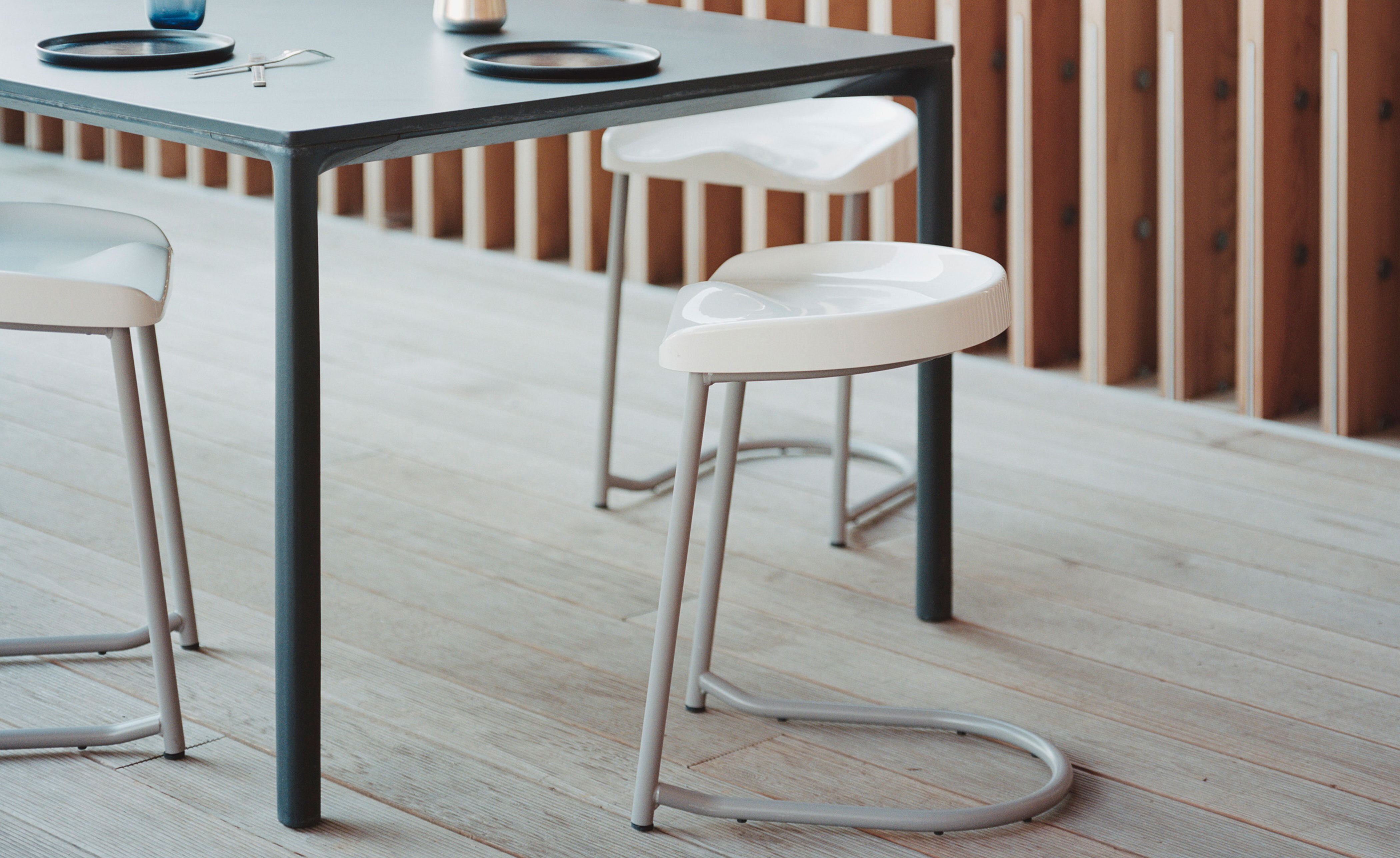 A powder-coated tubular steel leg adds a robust, and competitively-priced, stackable stool to the Heidi range. The redesigned base is paired with a new seat made from vacuum formed thermoplastic and Baydur, an injection-molded resin - the gloss UV protected finish is tough and suitable for outdoor use.