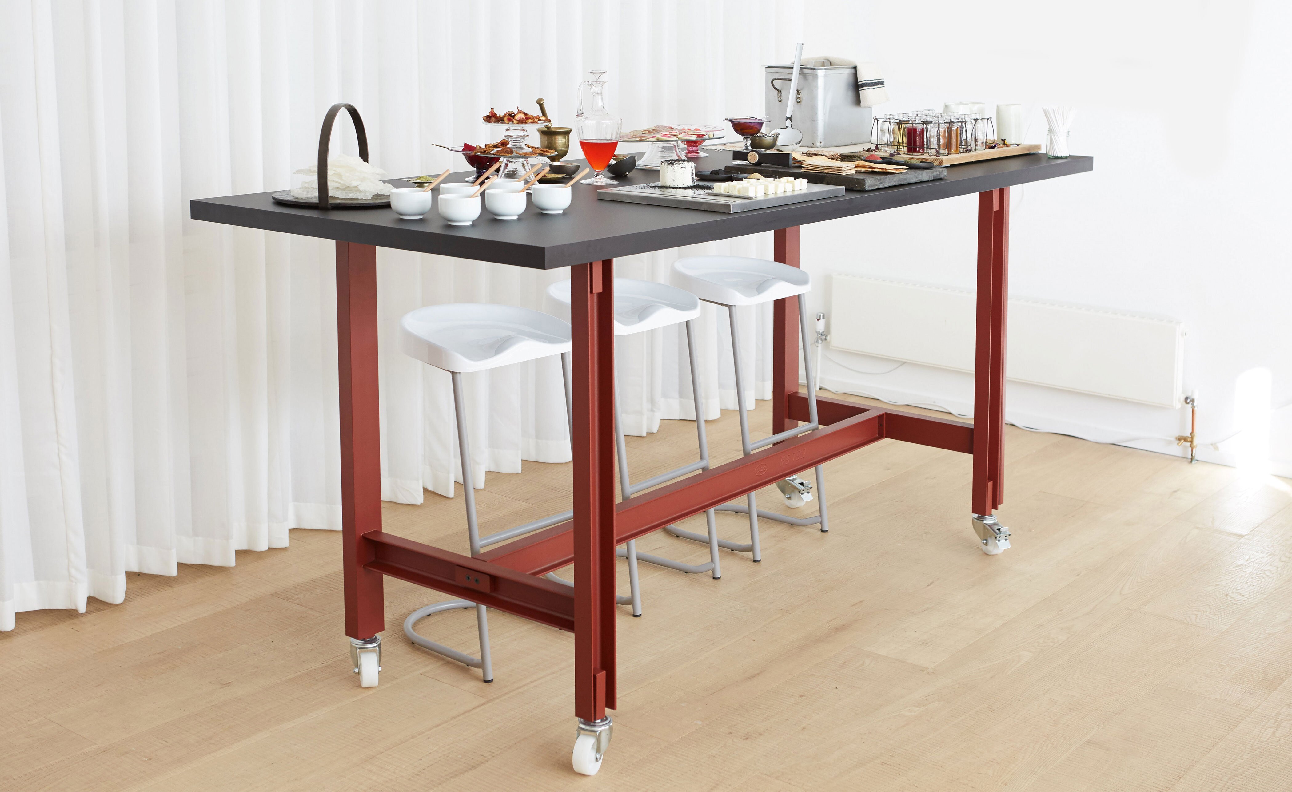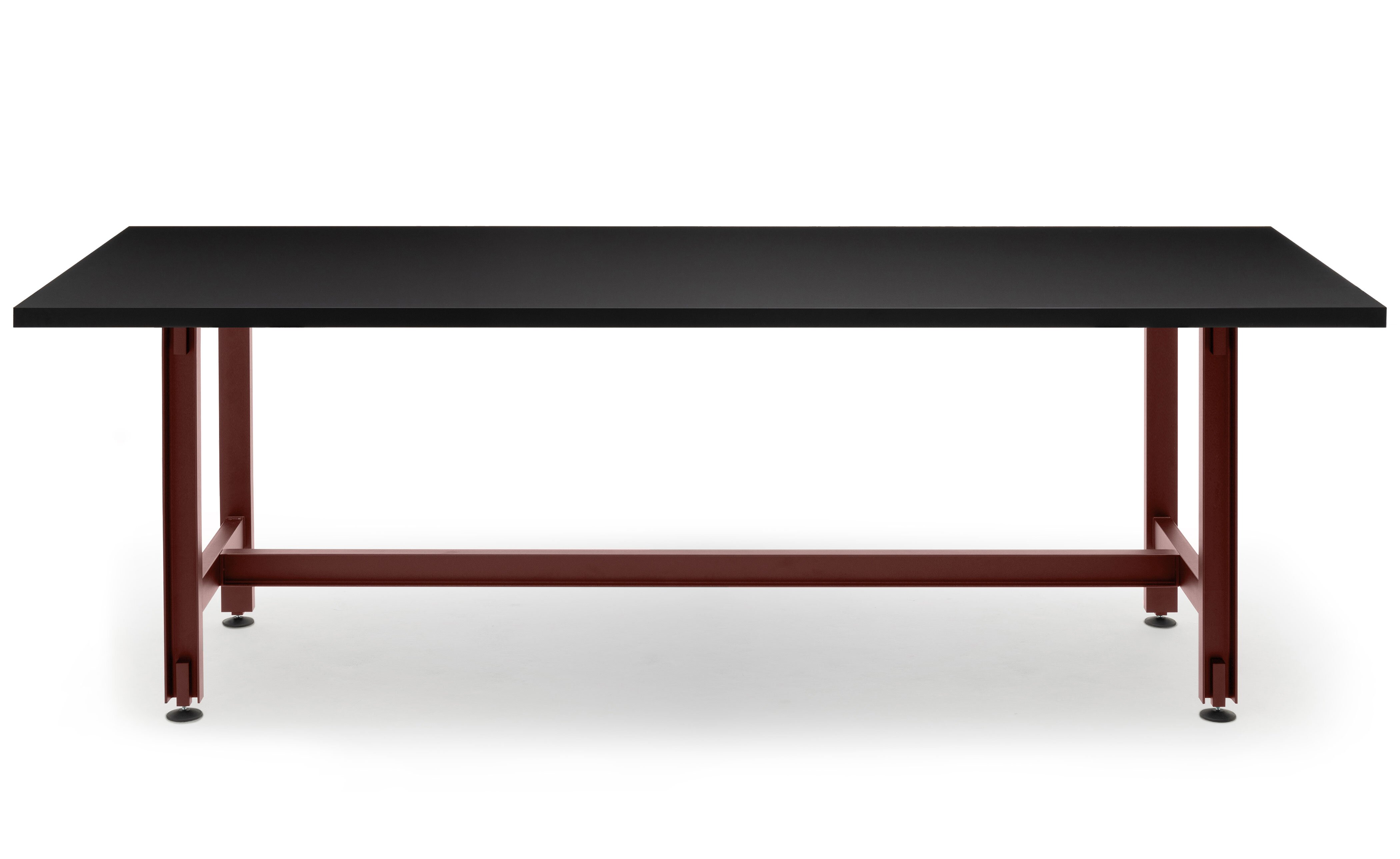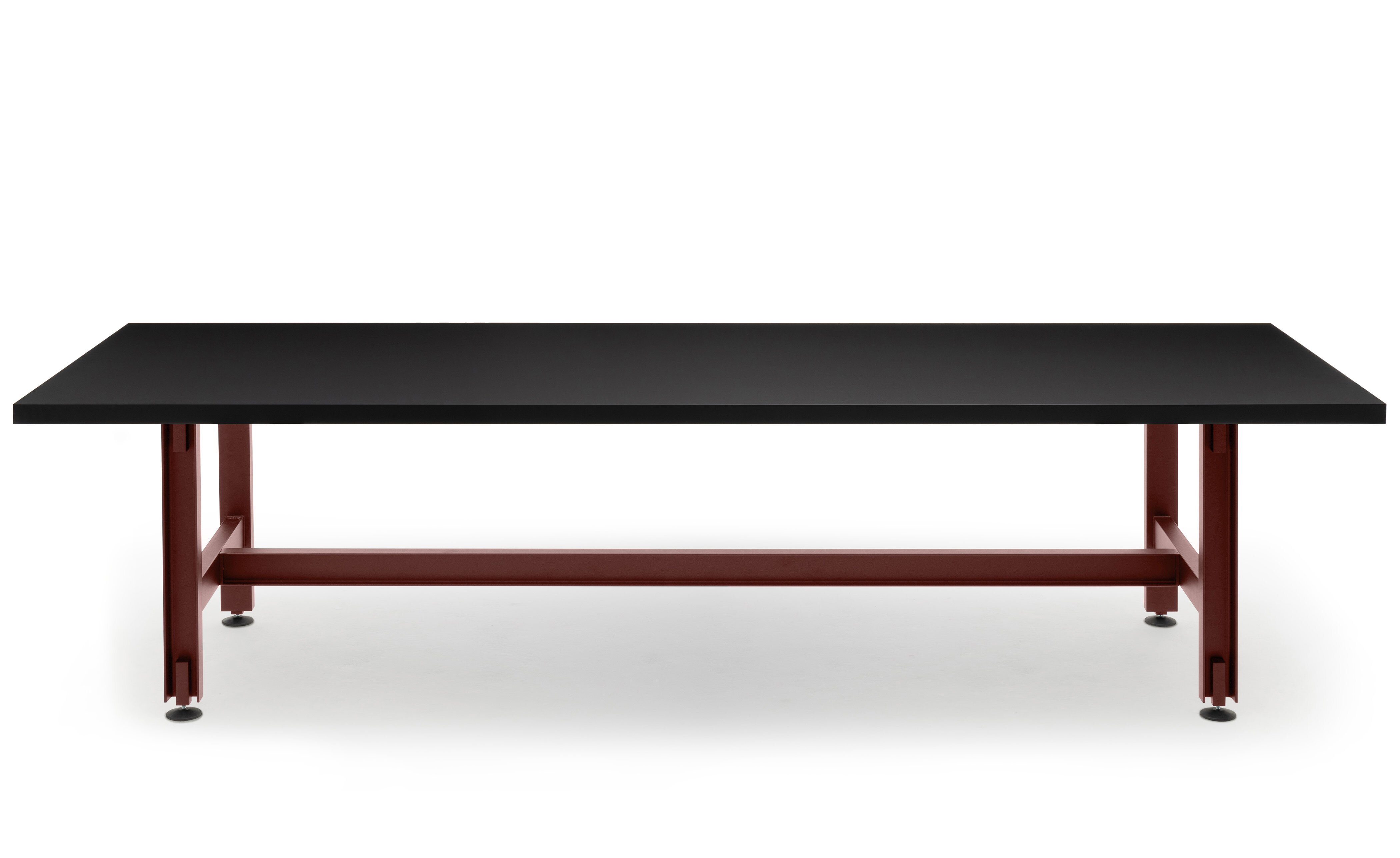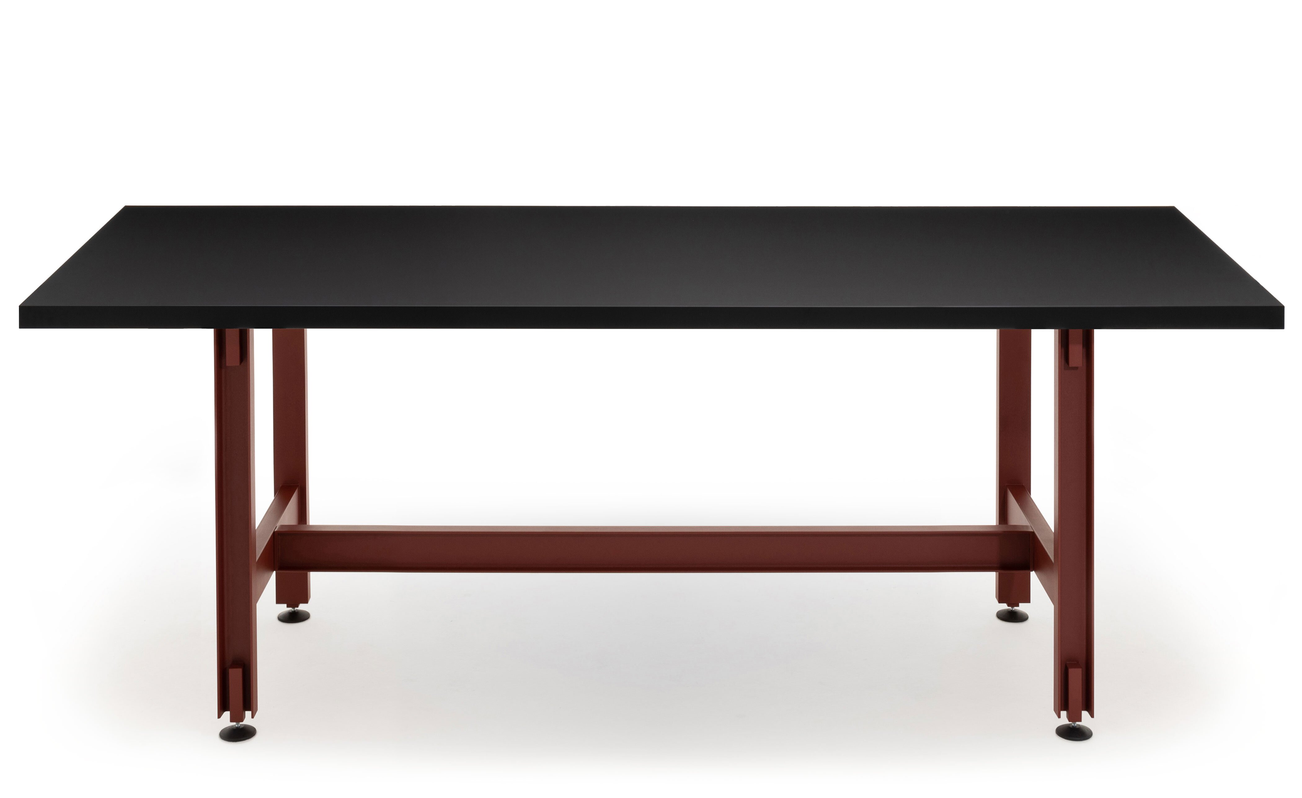 Merging premium design with an industrial aesthetic and an undeniably strong presence, the table is equally at home in an artisan's workshop, a gallery, a family home or a live-work space. The rolled steel i-beams that form the structure of the table are coated in a fine-textured powder coat in either jet black or red oxide and sit on adjustable round feet that help protect the ground beneath. Optional lockable swivel-castors allow the table to be easily moved, helping it adapt to many different uses. Solid-lipped table tops are available in oak or walnut veneer, a high-pressure laminate in black Fenix, a heat-and-scratch resistant, high-end surface material.