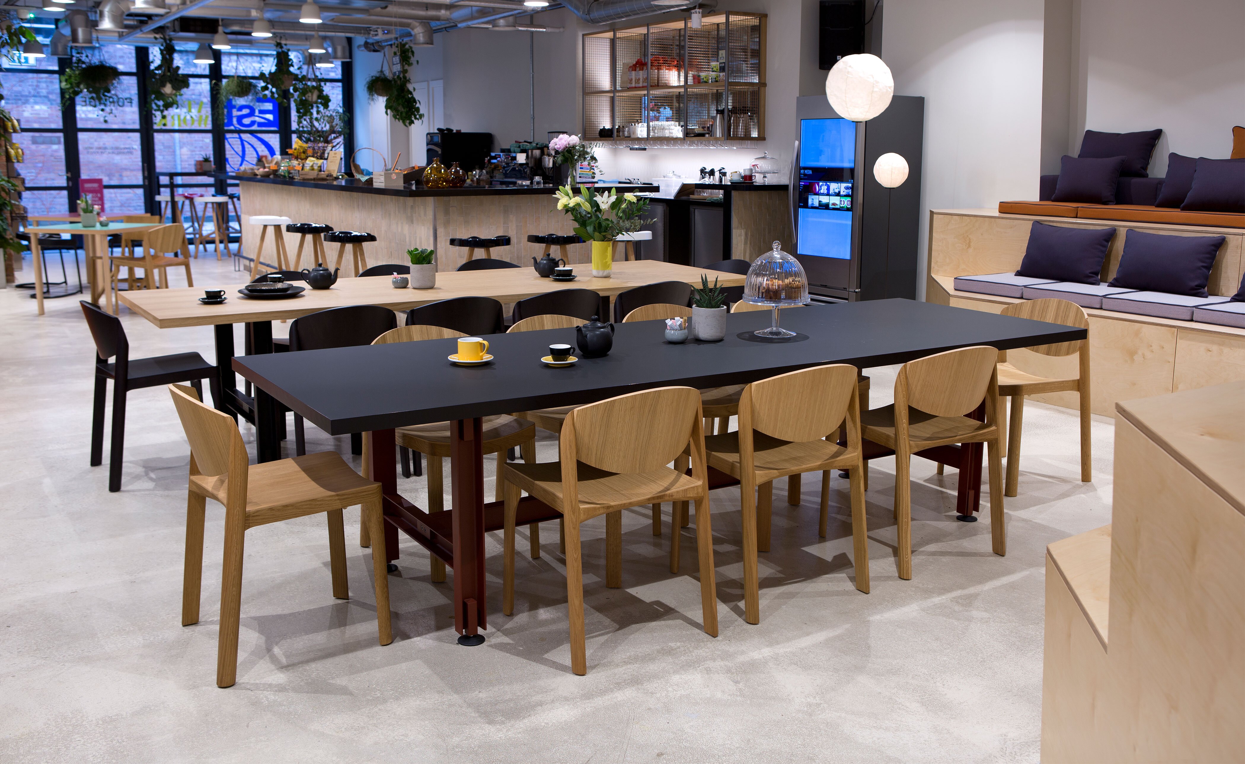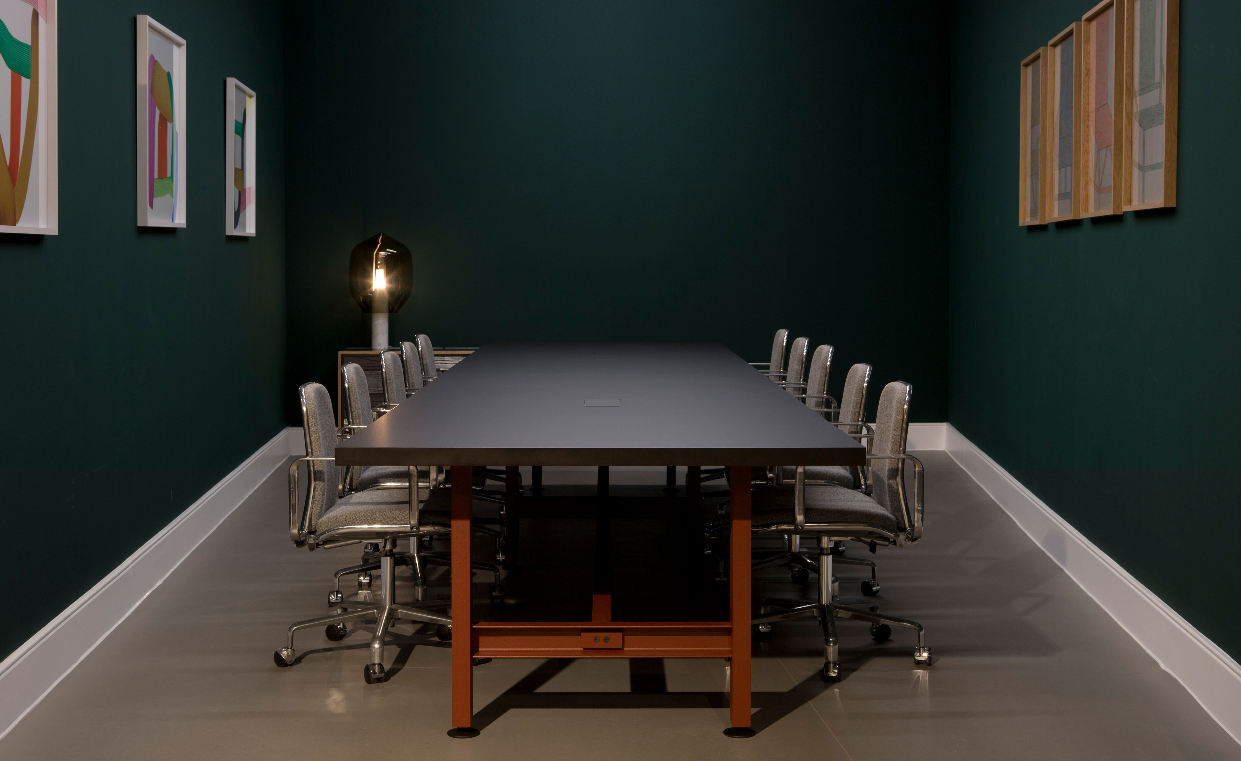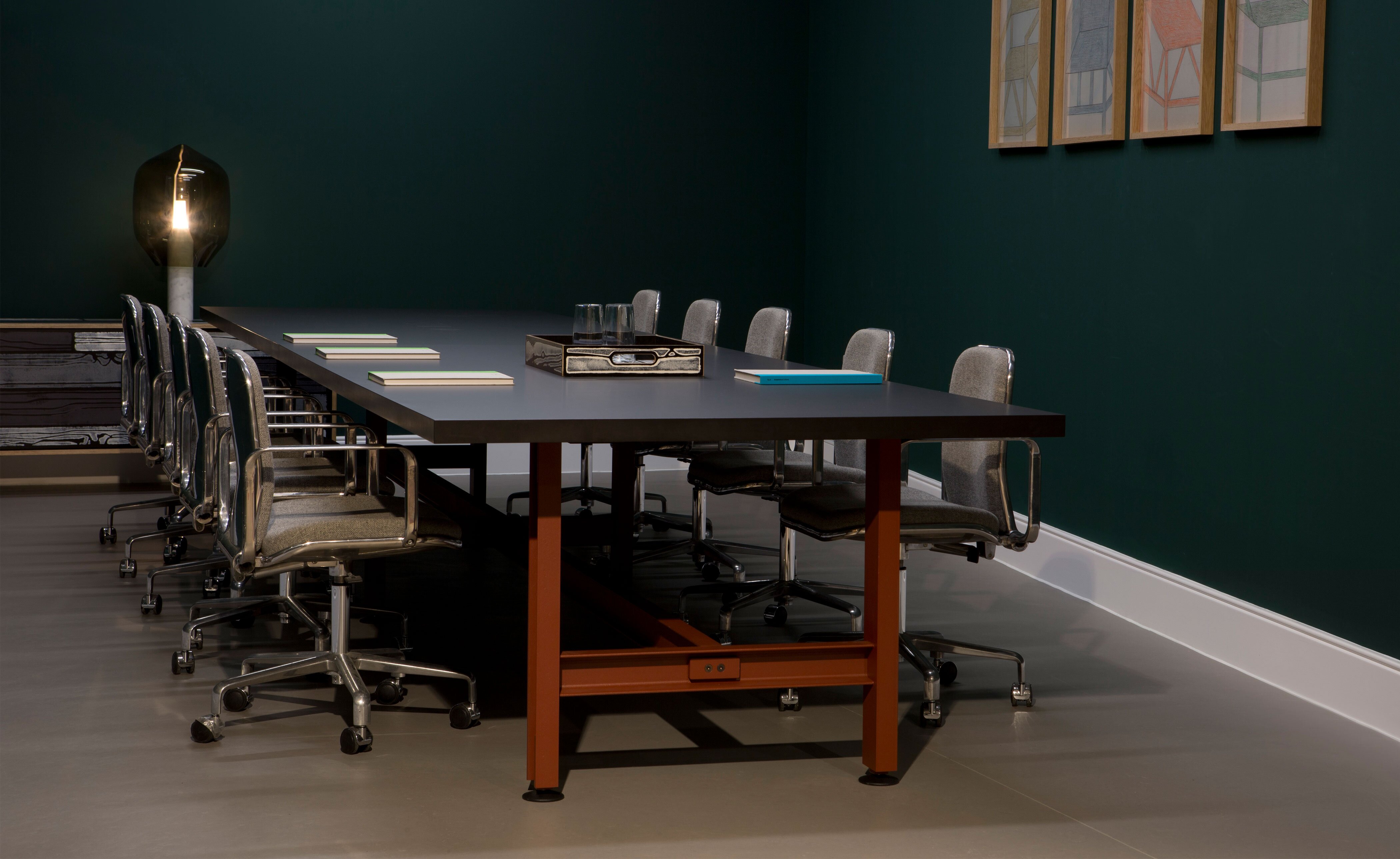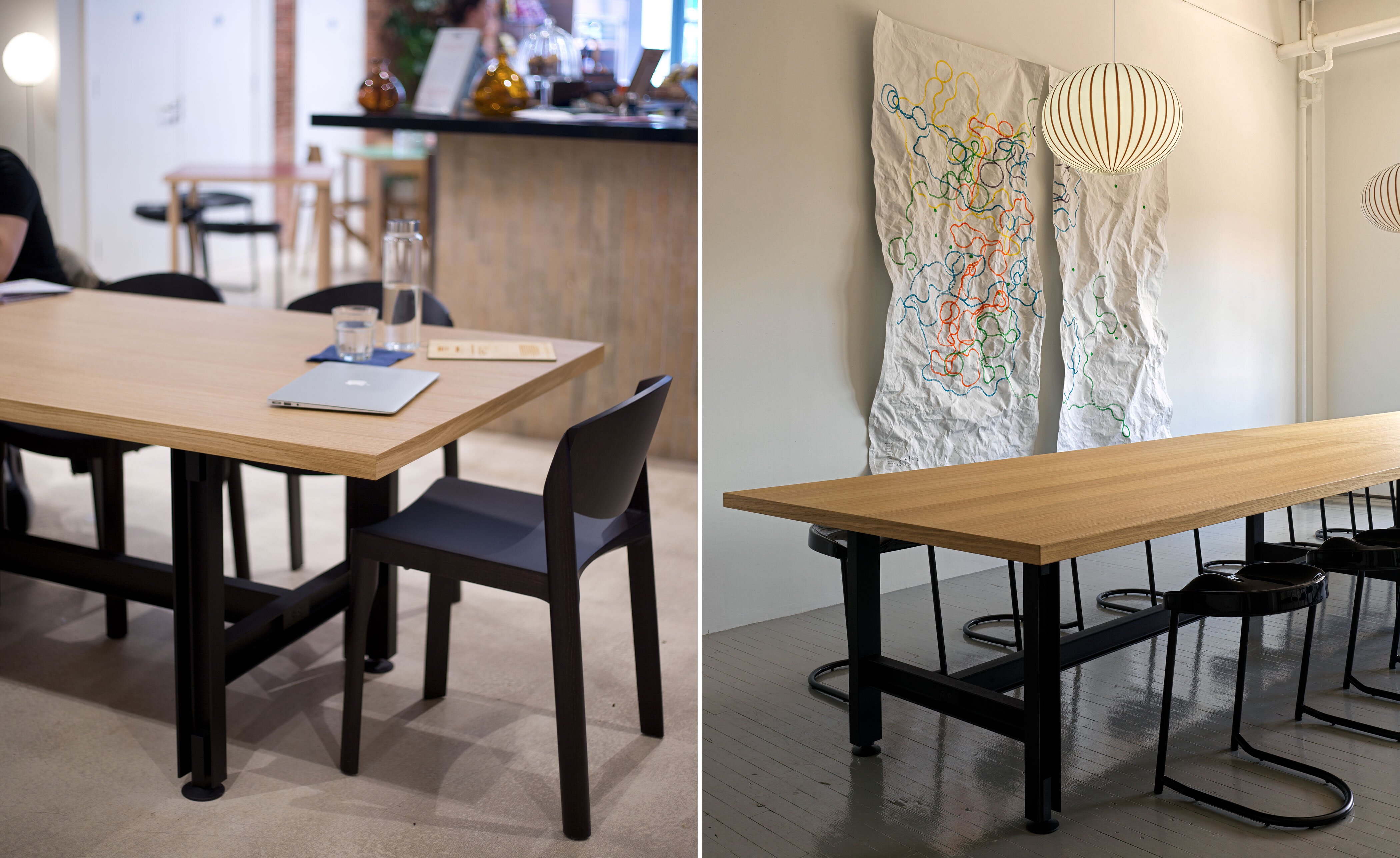 Merging premium design with an industrial aesthetic and an undeniably strong presence, the table is equally at home in an artisan's workshop, a gallery, a family home or a live-work space. The rolled steel i-beams that form the structure of the table are coated in a fine-textured powder coat in either jet black or red oxide and sit on adjustable round feet that help protect the ground beneath. Optional lockable swivel-castors allow the table to be easily moved, helping it adapt to many different uses. Solid-lipped table tops are available in oak or walnut veneer, a high-pressure laminate in black Fenix, a heat-and-scratch resistant, high-end surface material.