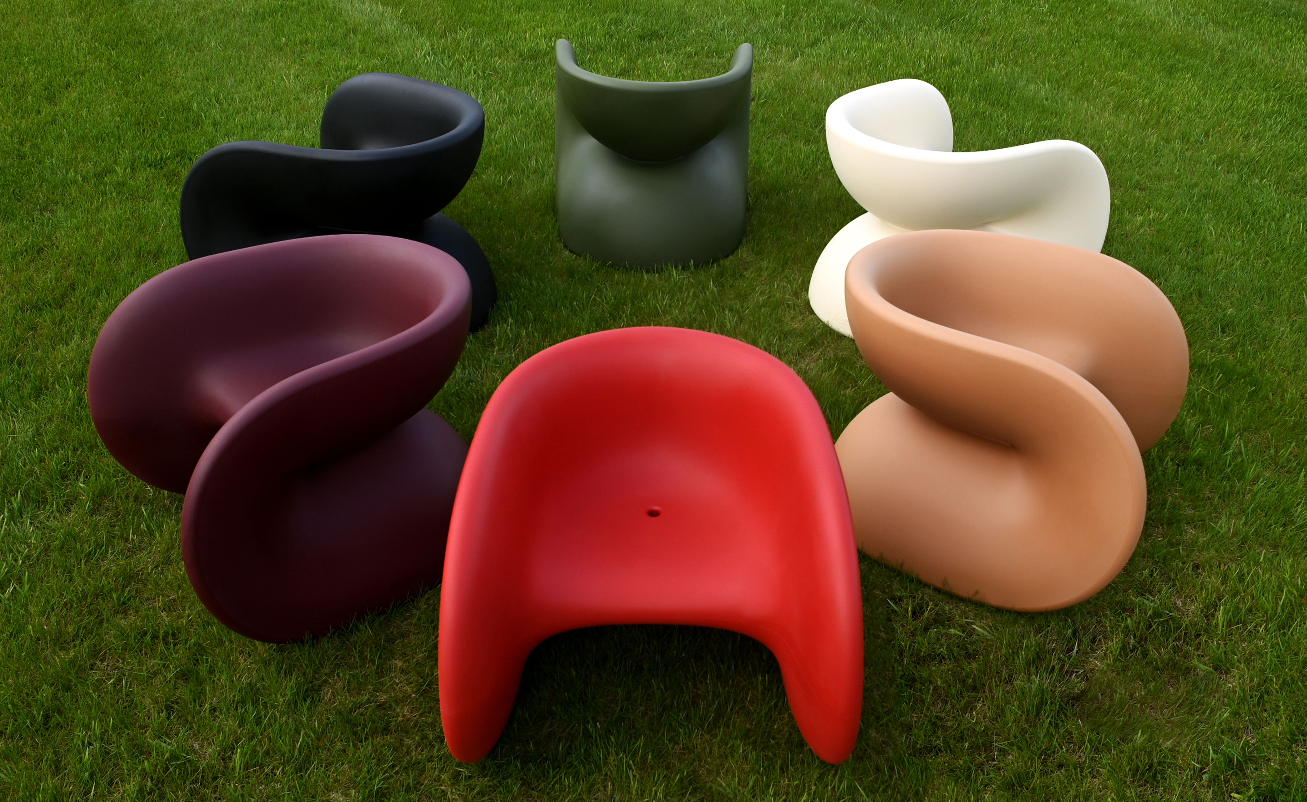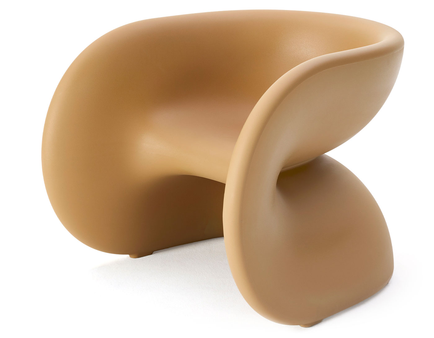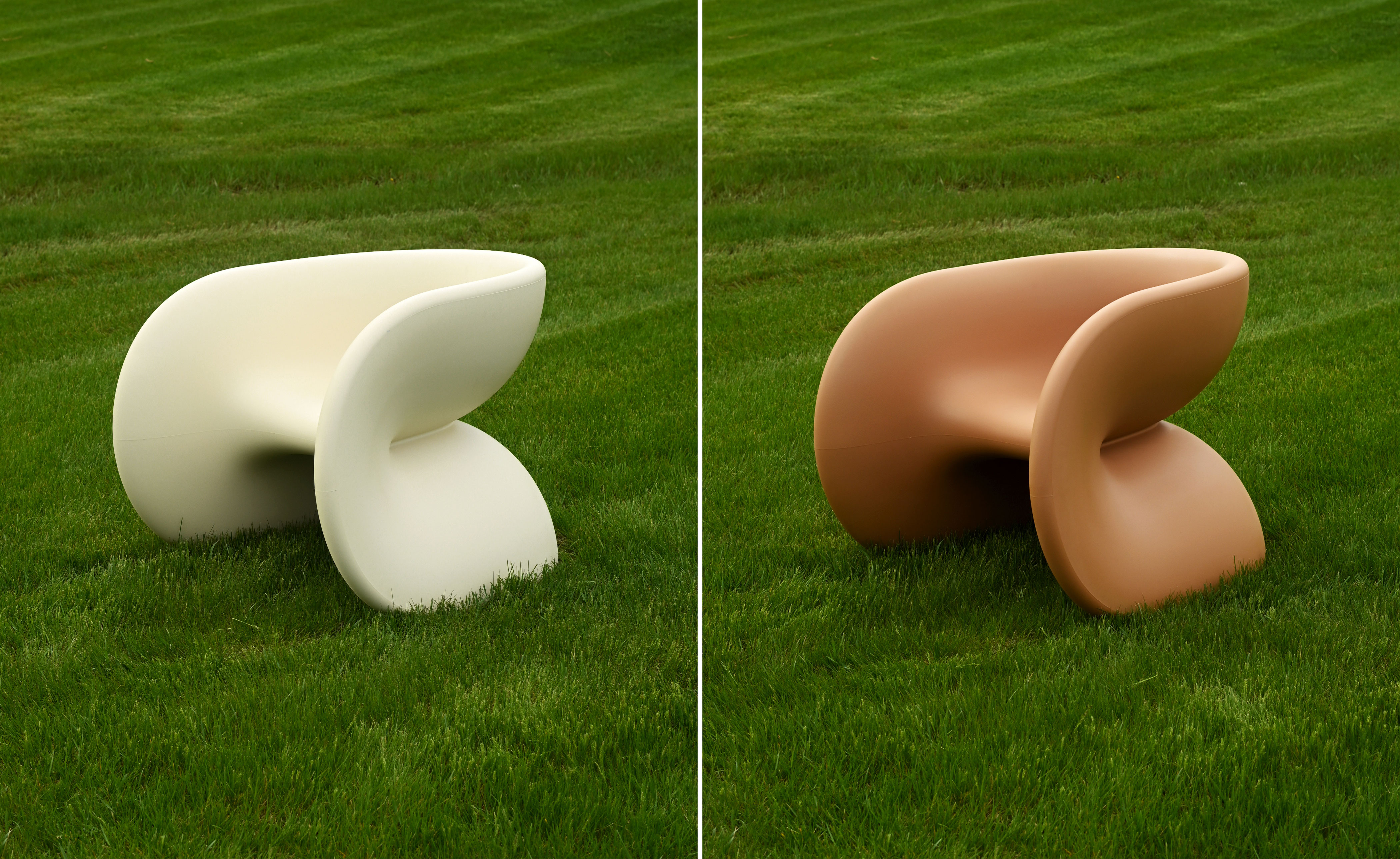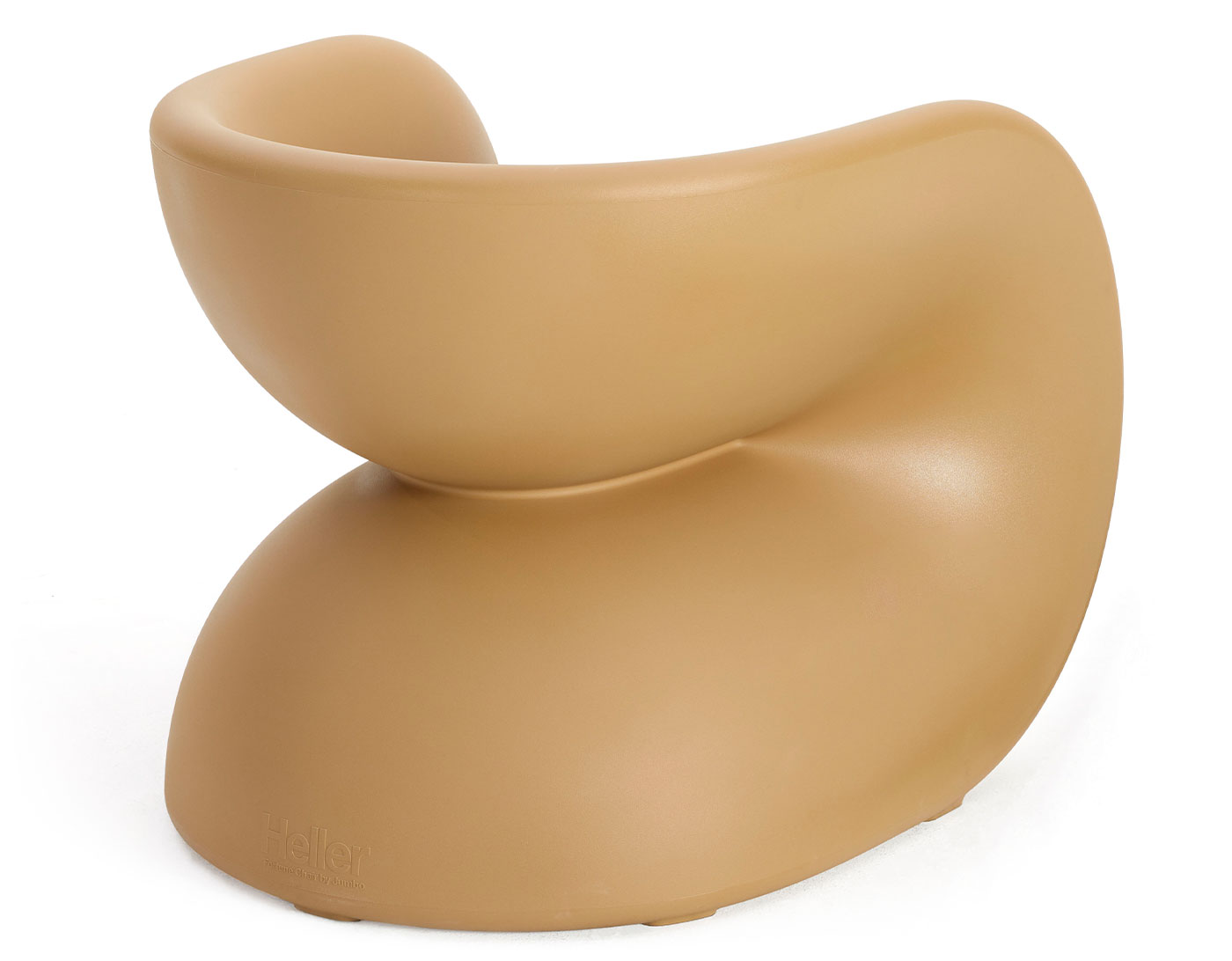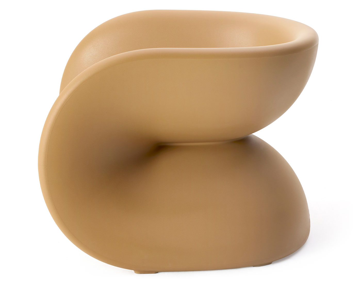 Brilliantly designed, the shape of the chair merely suggests the origin of the design, allowing one to delight in the discovery that the chair's form is inspired by the beloved fortune cookie. Fortune Chair is crafted to meet contract-quality standards. The low-maintenance colorfast material and added drainage hole in the seat make this an ideal outdoor lounge chair. A hidden grip under the seat makes the chair easy to move. The nostalgic color palette and abstract shape is a mouthwatering solution in both residential and hospitality spaces.