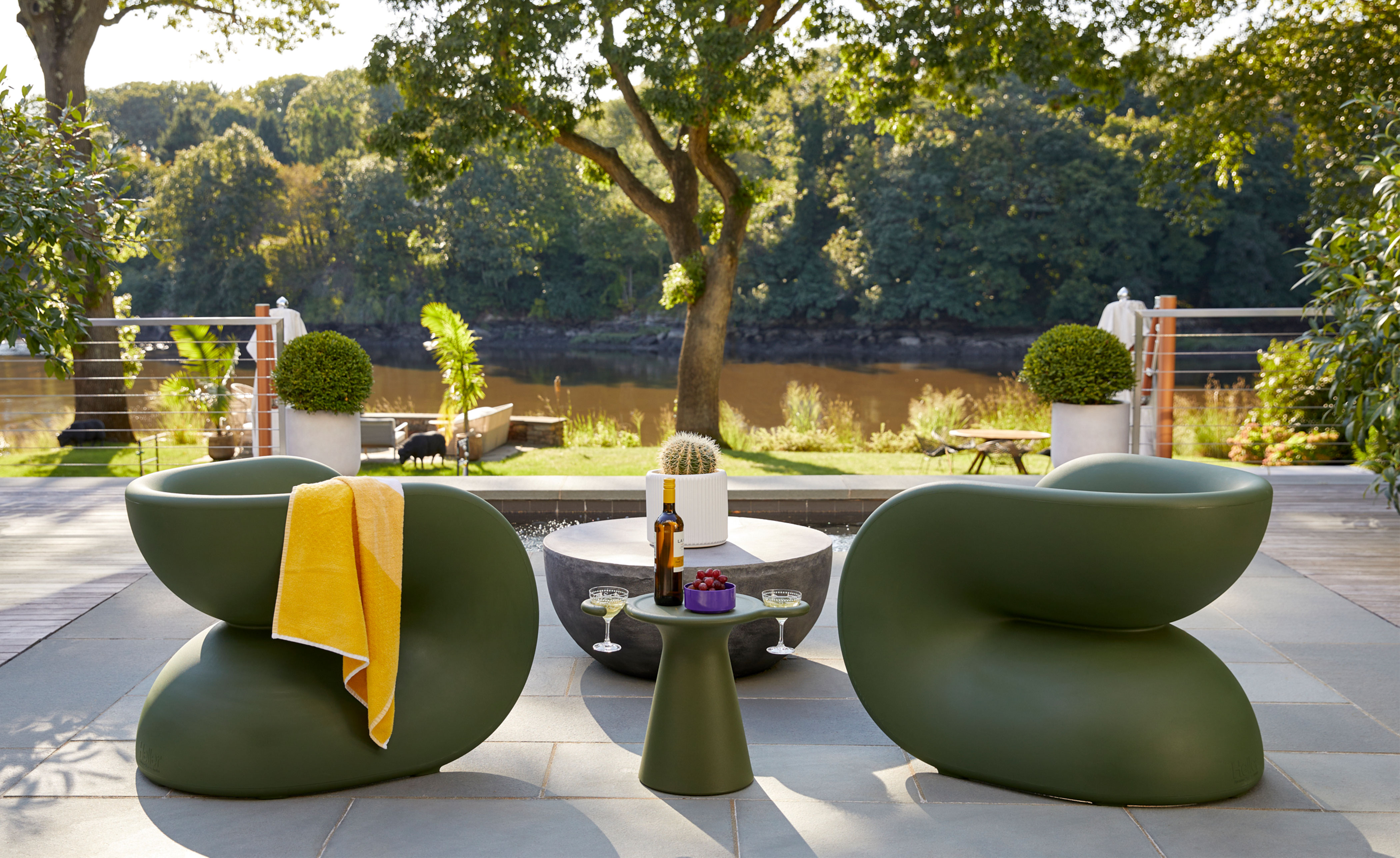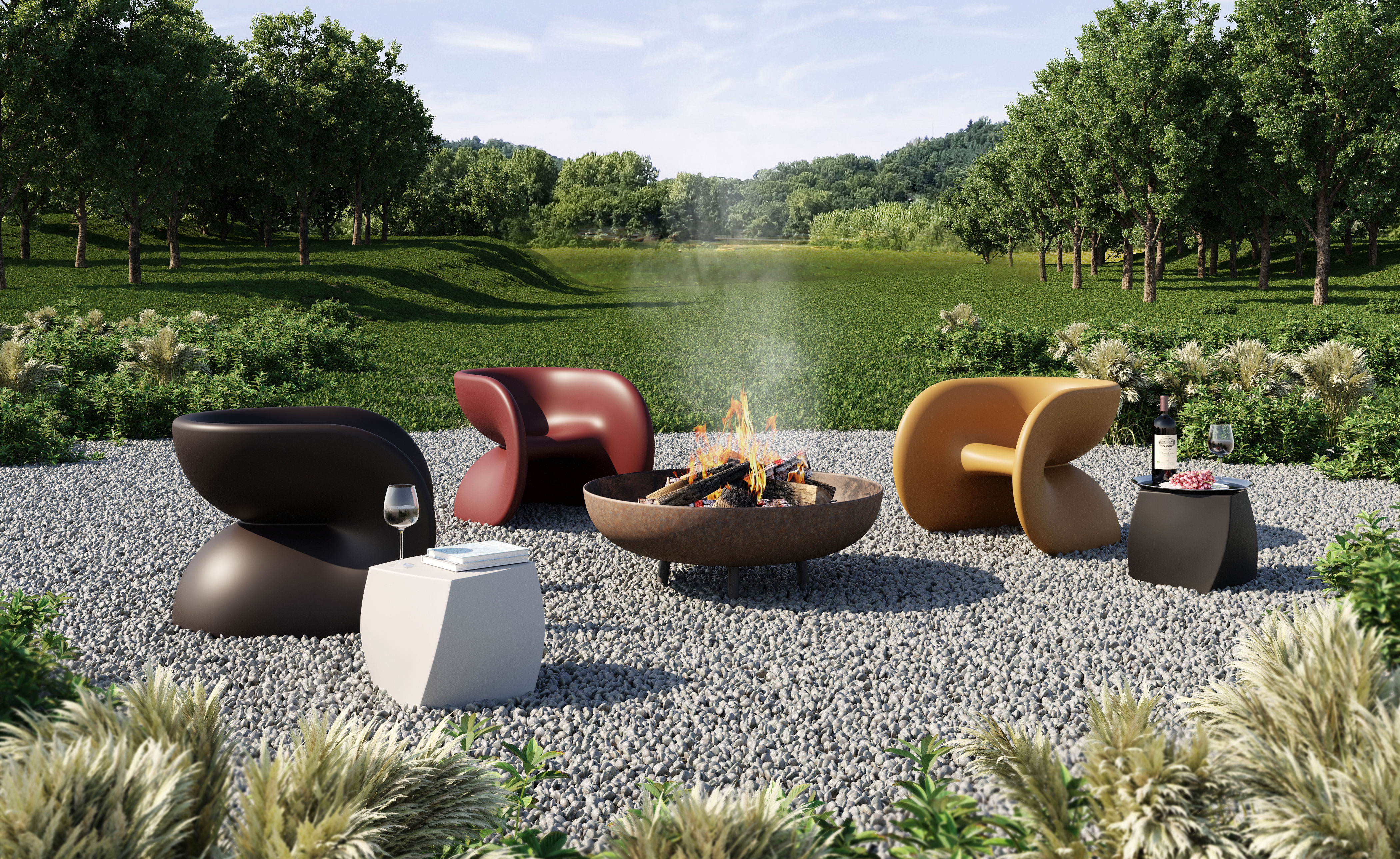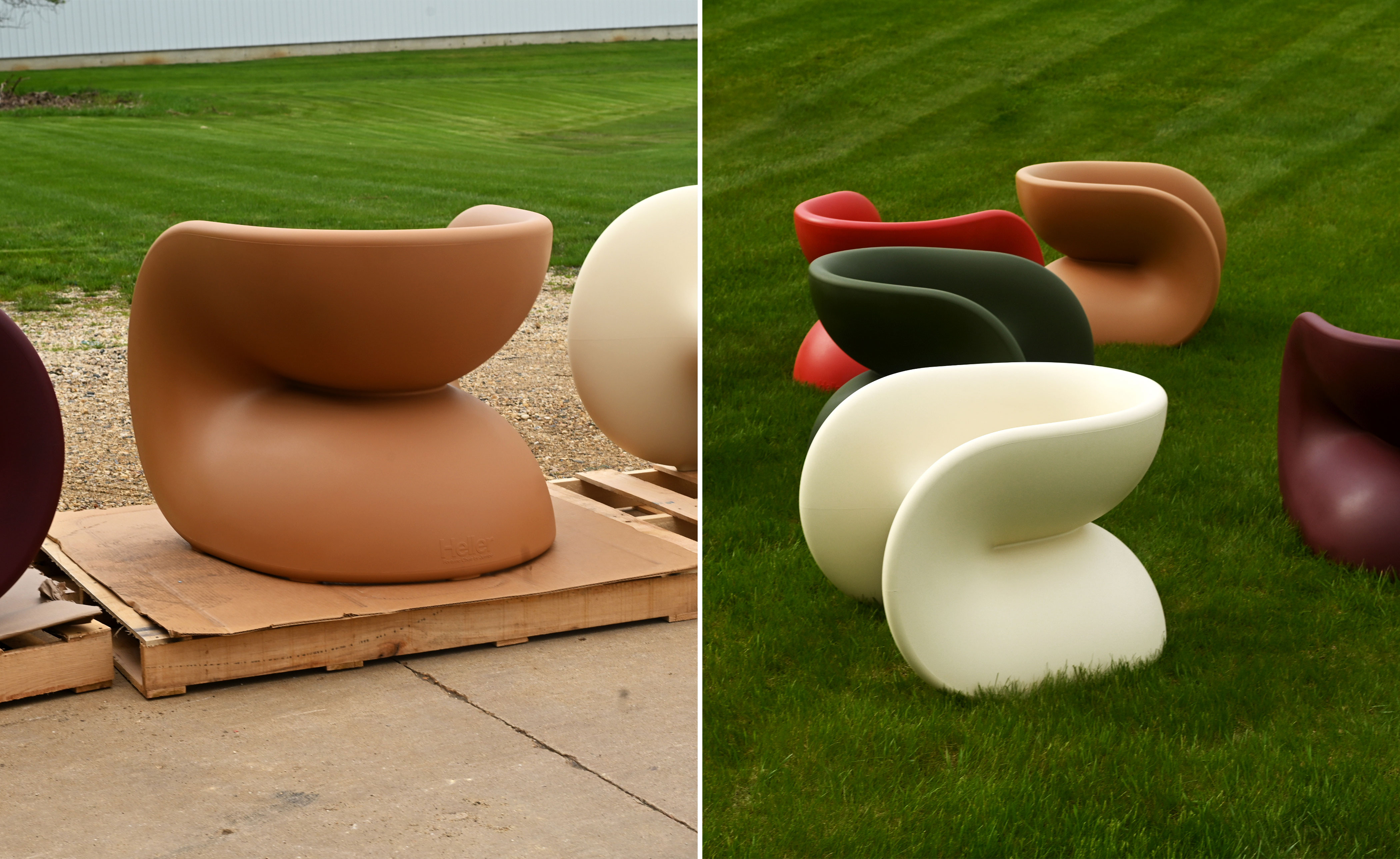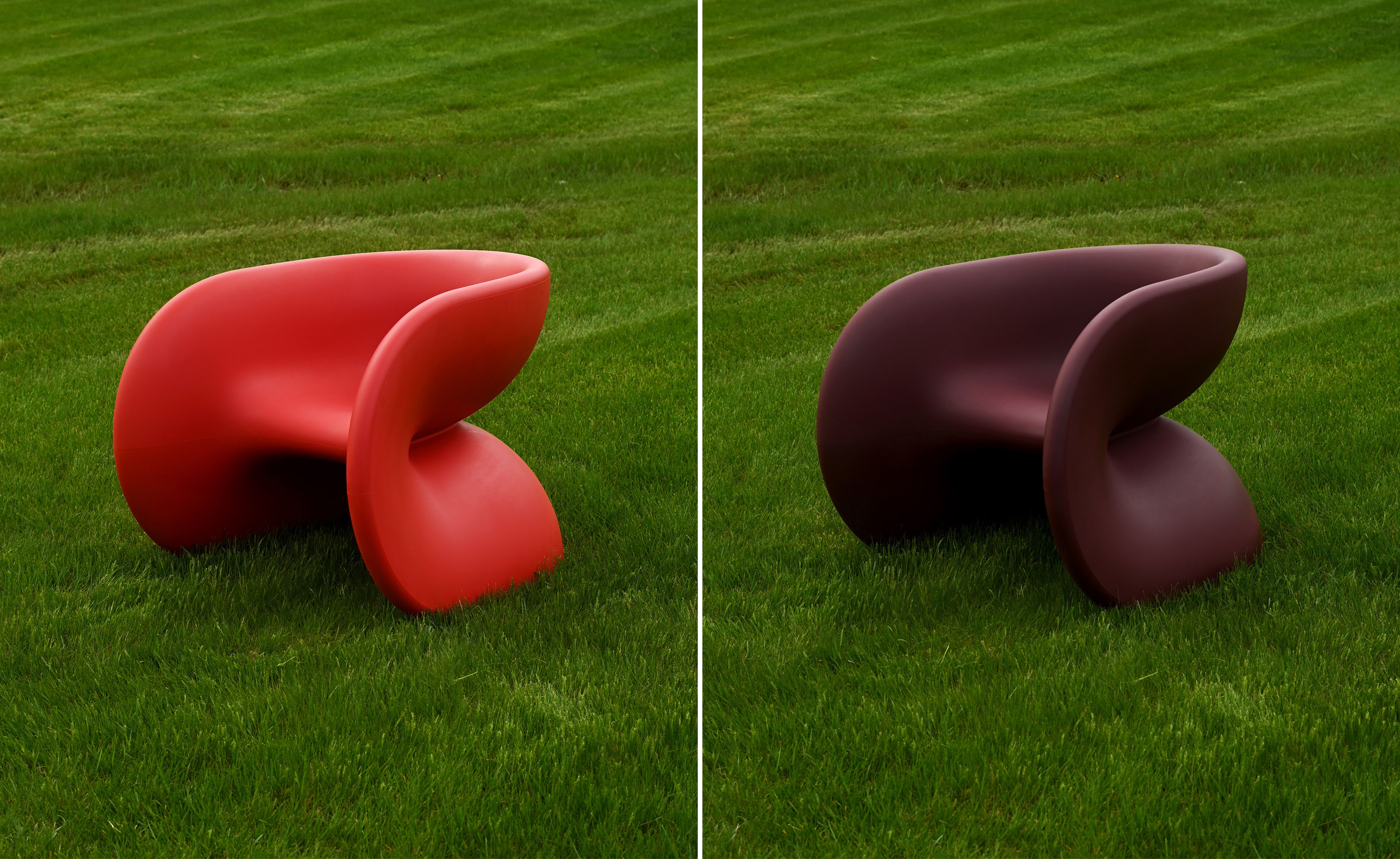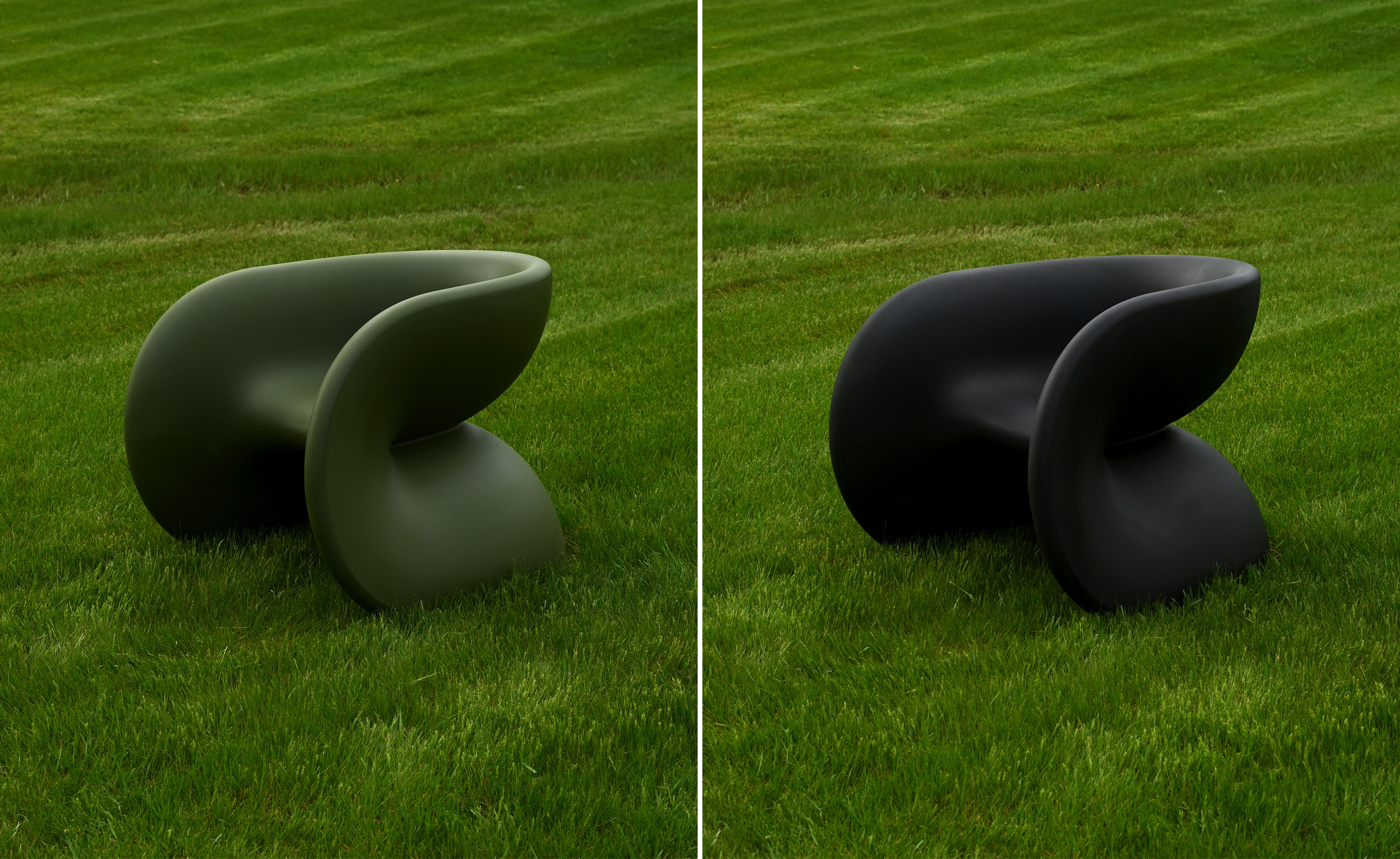 Brilliantly designed, the shape of the chair merely suggests the origin of the design, allowing one to delight in the discovery that the chair's form is inspired by the beloved fortune cookie. Fortune Chair is crafted to meet contract-quality standards. The low-maintenance colorfast material and added drainage hole in the seat make this an ideal outdoor lounge chair. A hidden grip under the seat makes the chair easy to move. The nostalgic color palette and abstract shape is a mouthwatering solution in both residential and hospitality spaces.