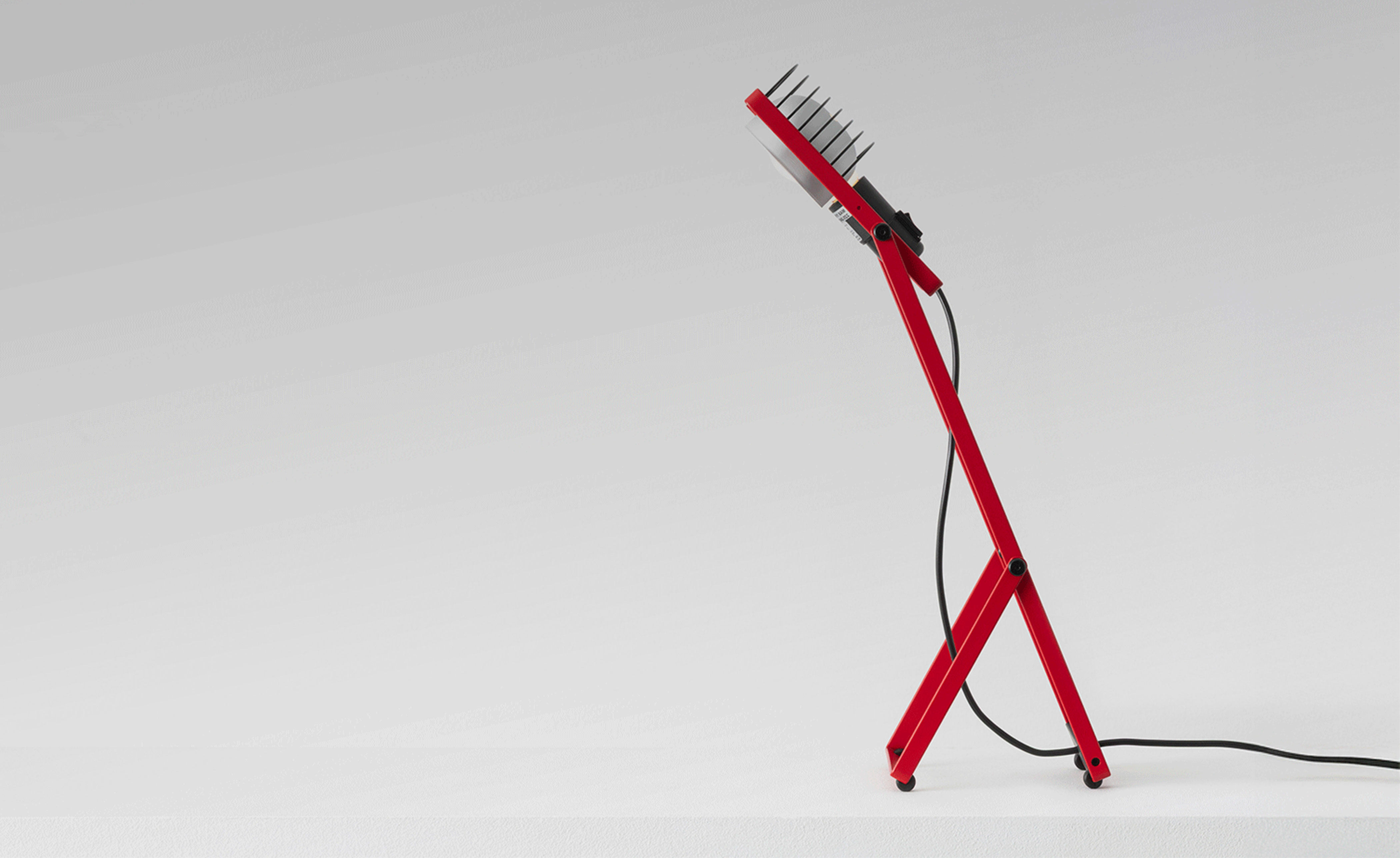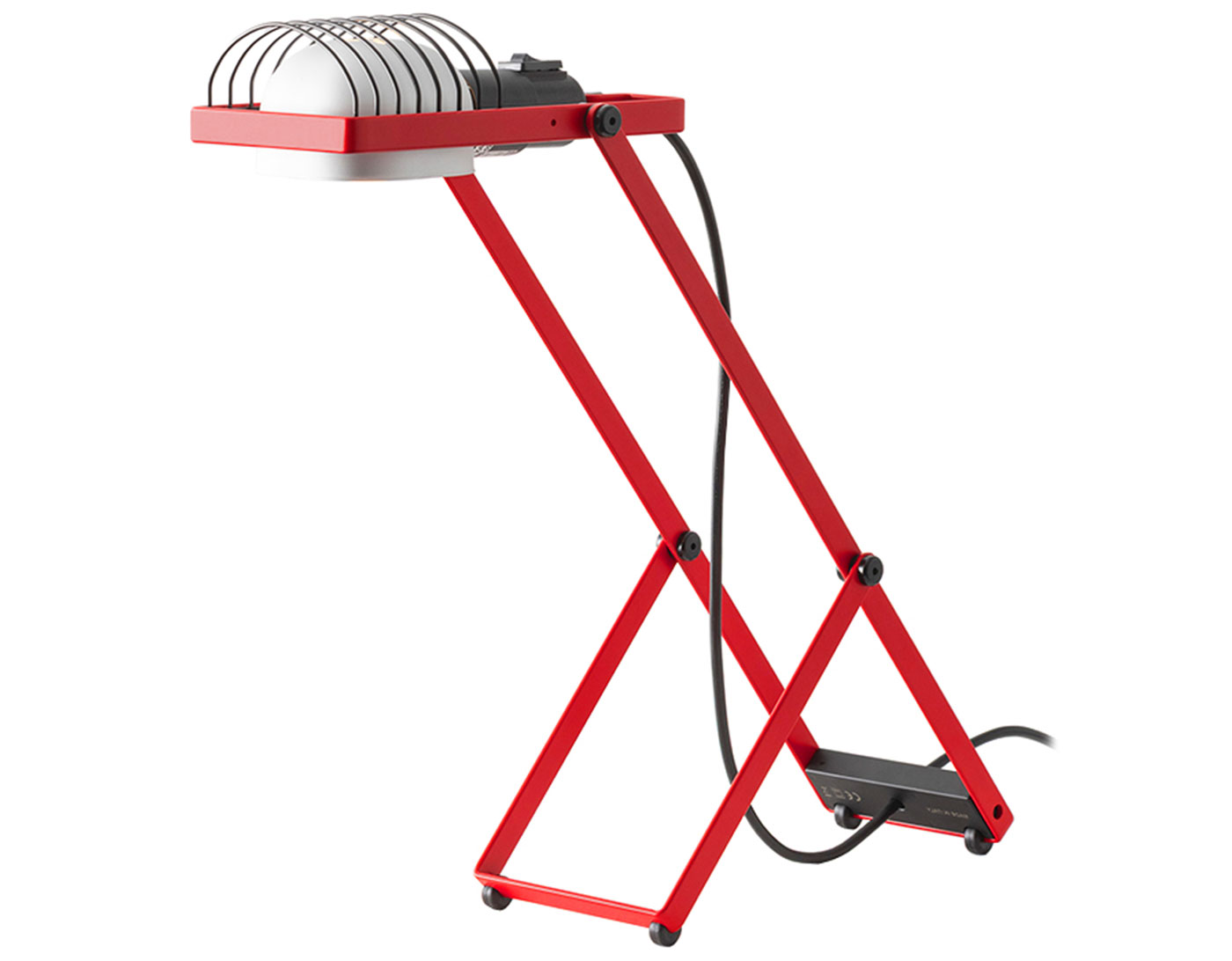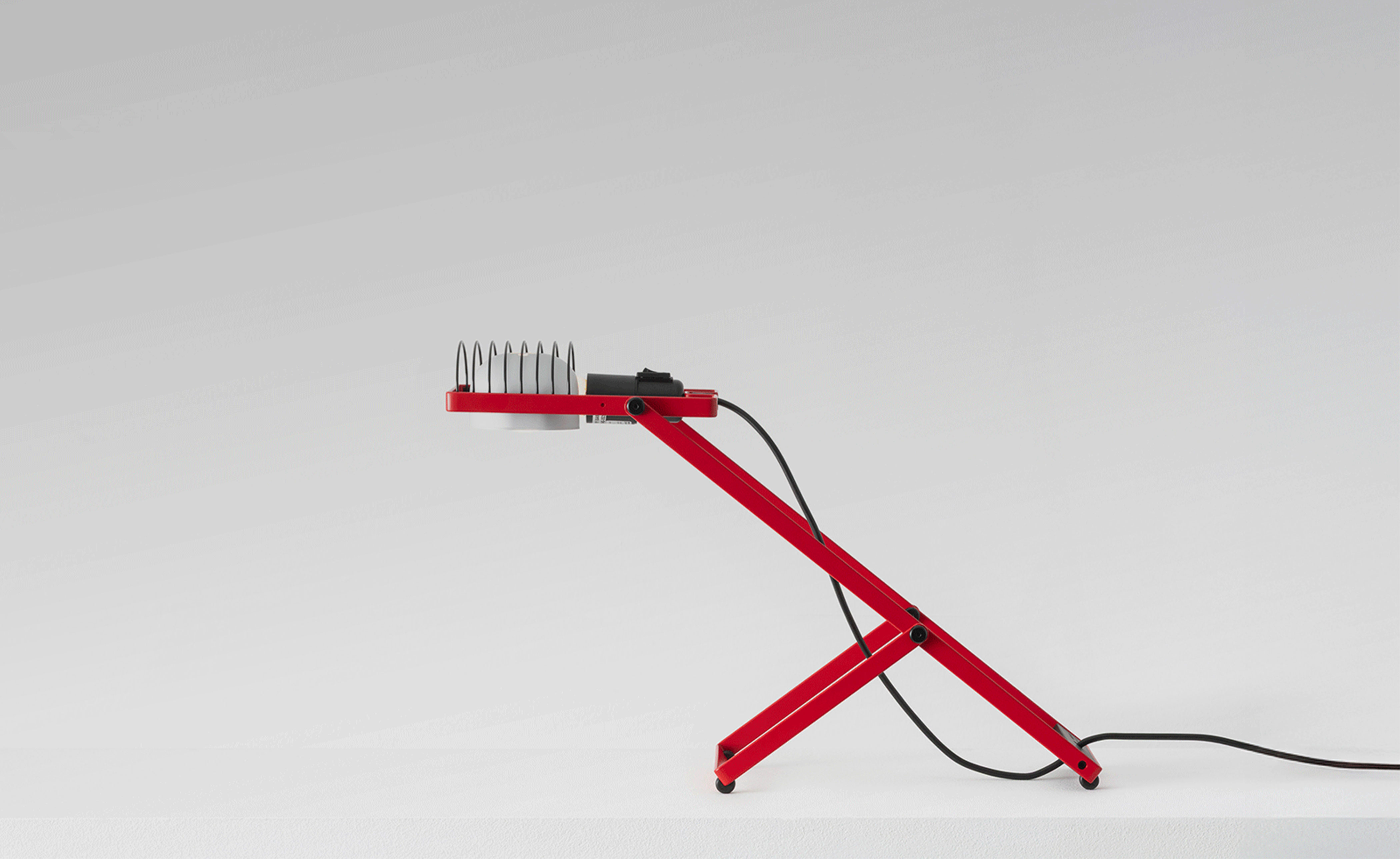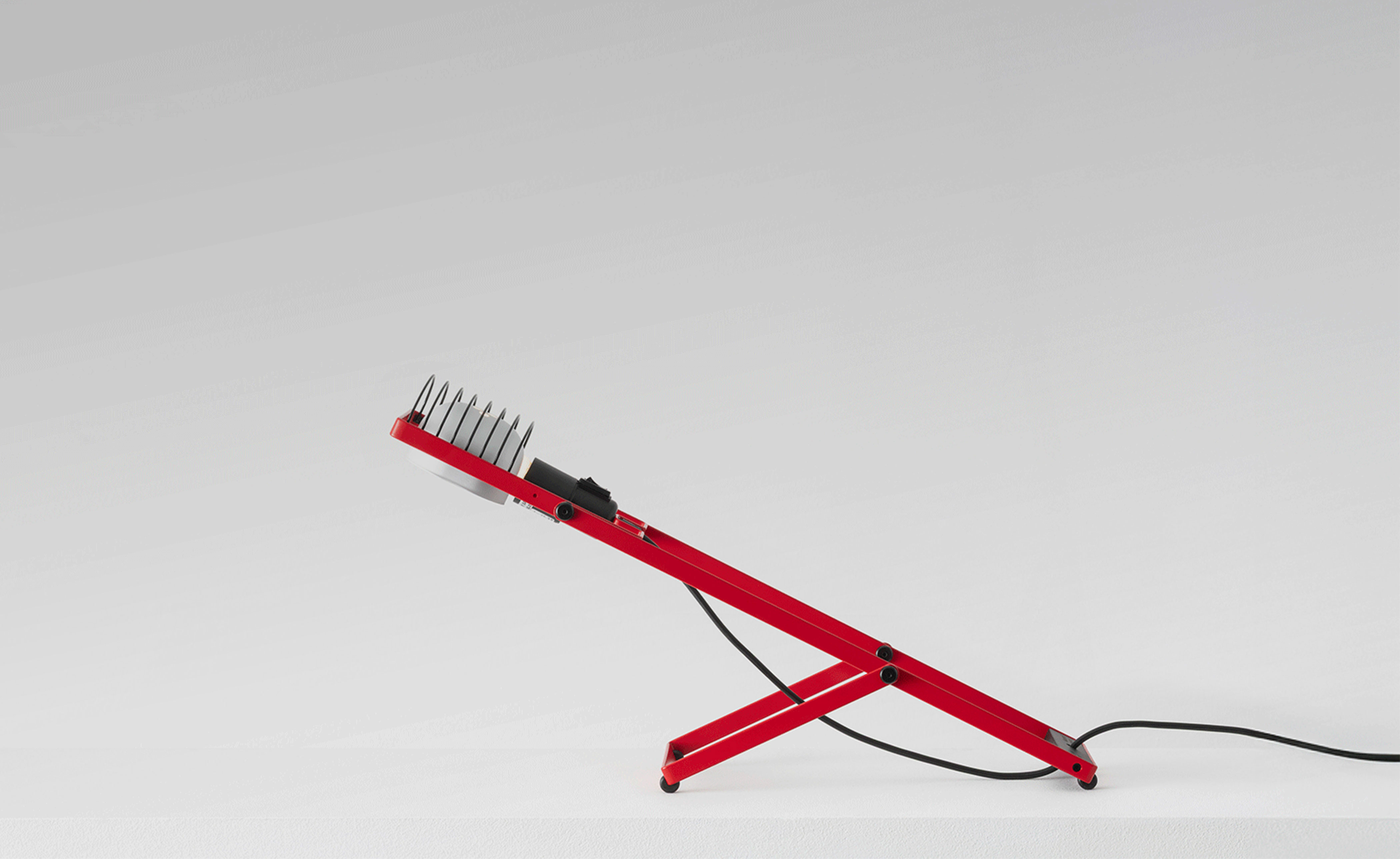 Flexible essentiality. The table version stands at the core of the reissue, representing the heart of the original modular system. Featuring a minimalist bent-metal form, the lamp is adjustable in height and angle thanks to its iconic Y-shaped support. The head, with E26 socket, reflector, and grid, combines adaptability and durability in a compact, functional design.