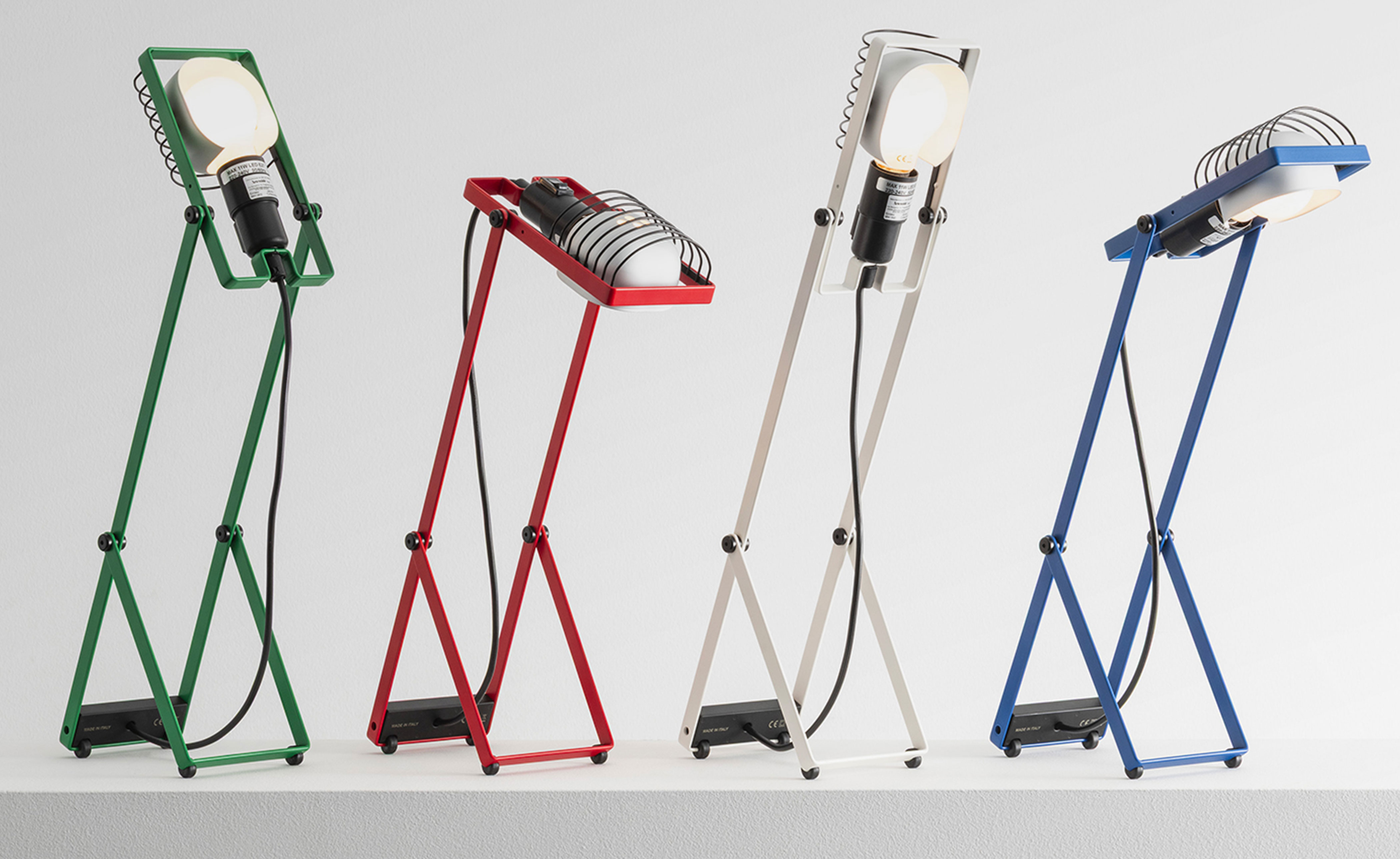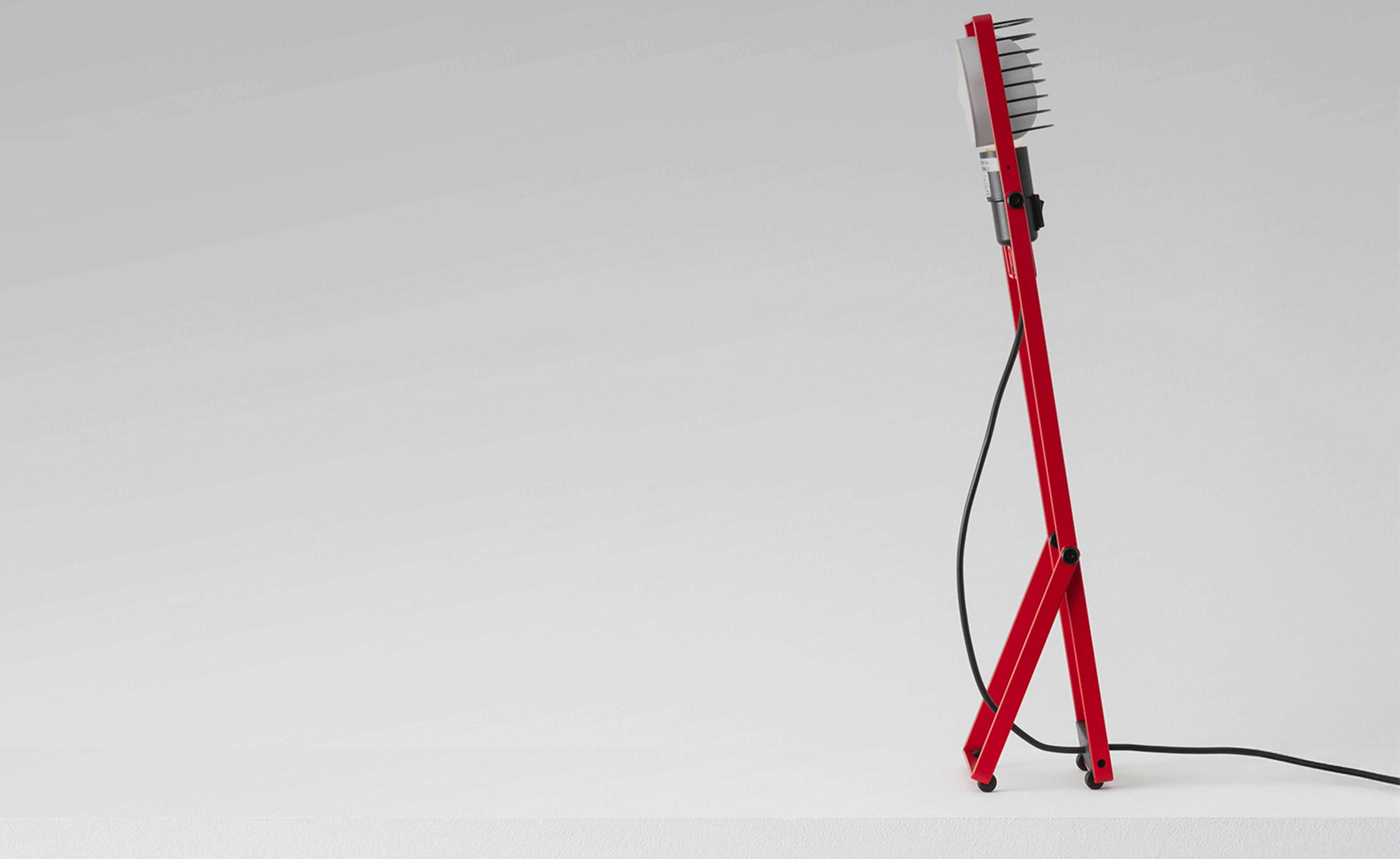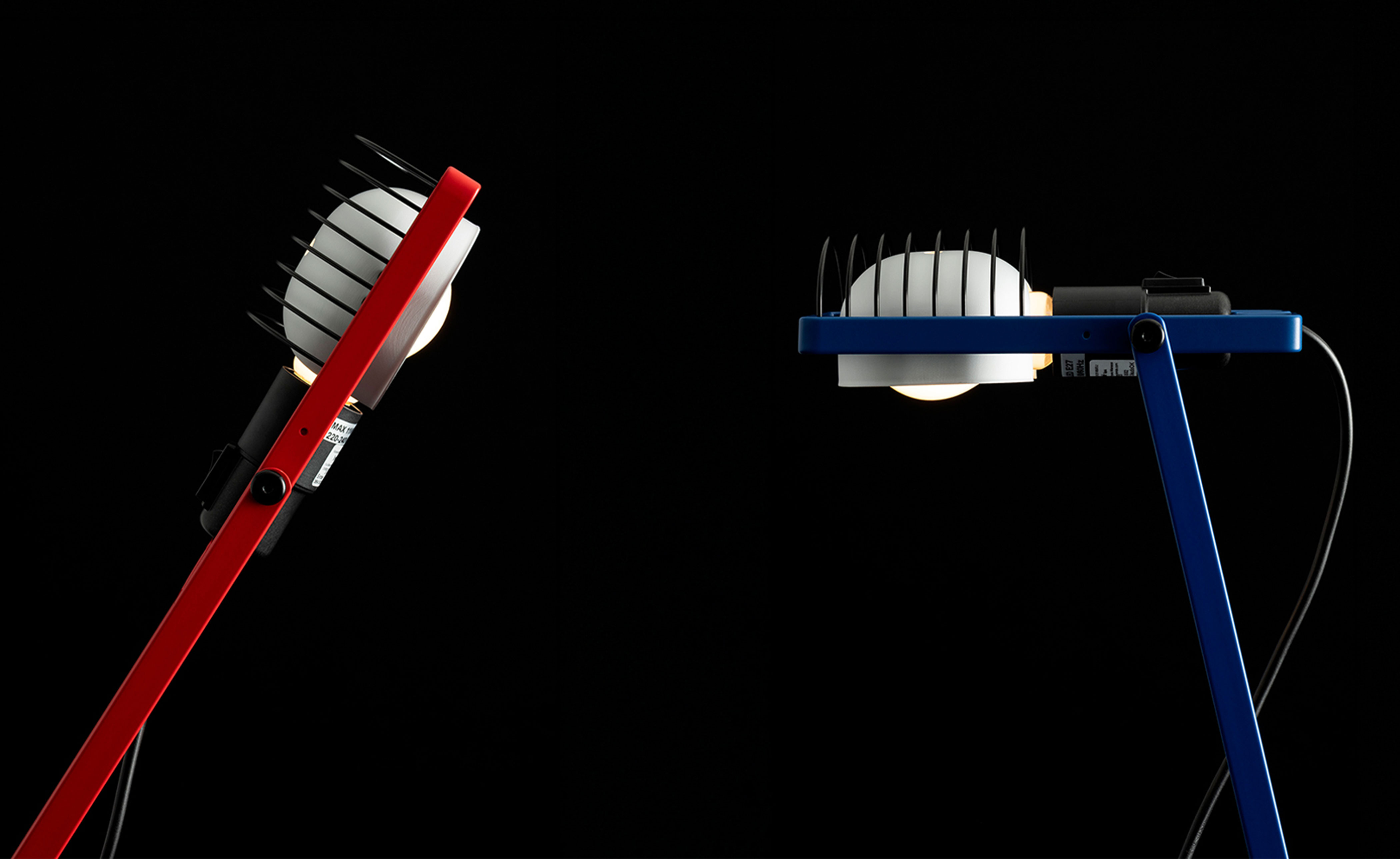 Flexible essentiality. The table version stands at the core of the reissue, representing the heart of the original modular system. Featuring a minimalist bent-metal form, the lamp is adjustable in height and angle thanks to its iconic Y-shaped support. The head, with E26 socket, reflector, and grid, combines adaptability and durability in a compact, functional design.