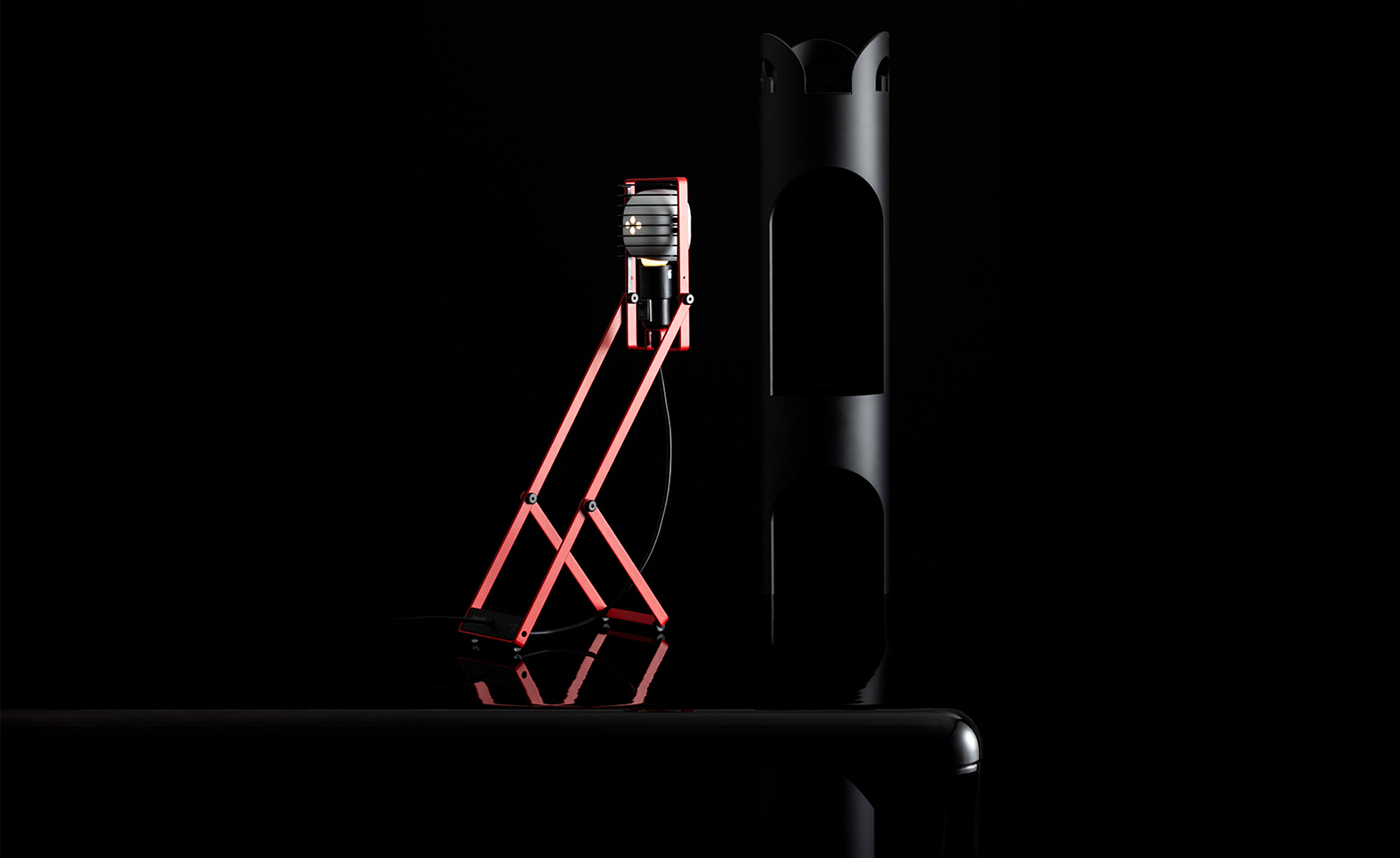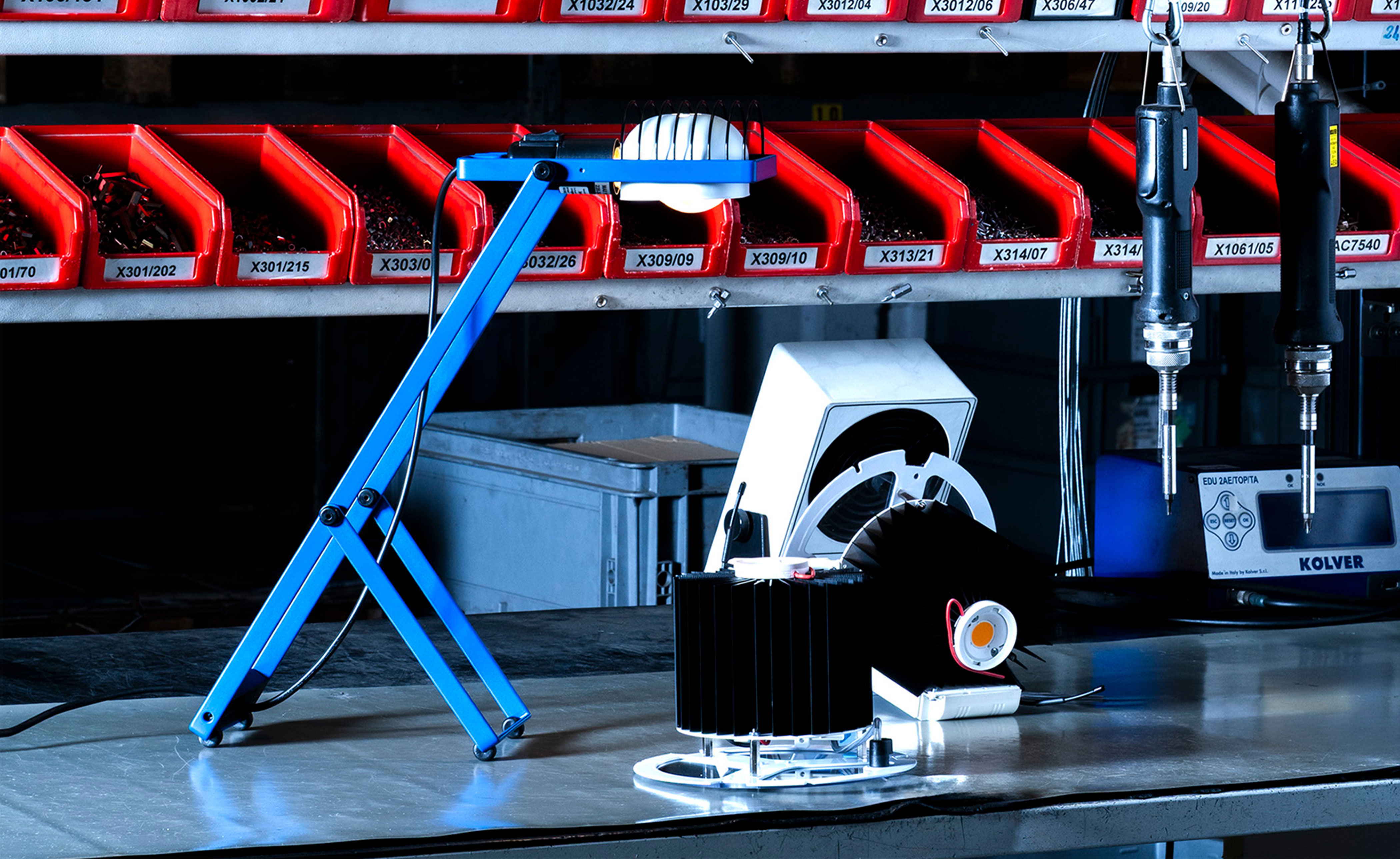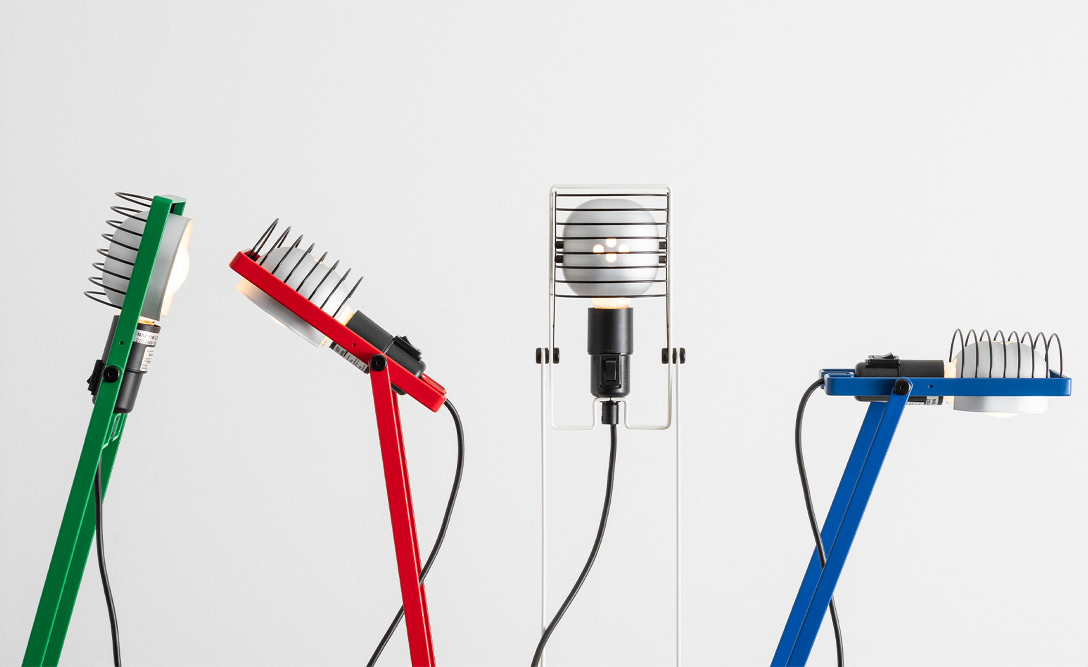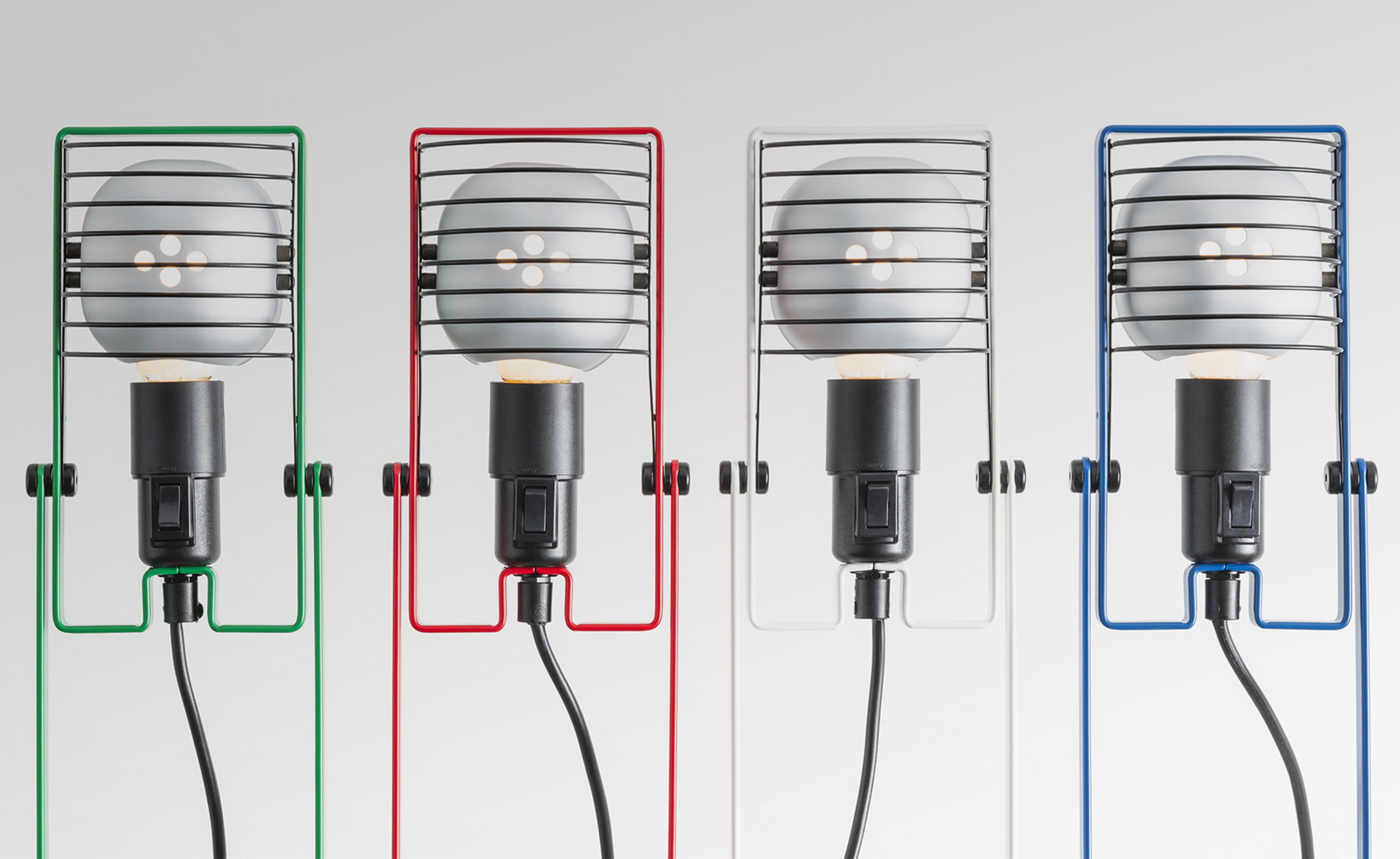 Flexible essentiality. The table version stands at the core of the reissue, representing the heart of the original modular system. Featuring a minimalist bent-metal form, the lamp is adjustable in height and angle thanks to its iconic Y-shaped support. The head, with E26 socket, reflector, and grid, combines adaptability and durability in a compact, functional design.