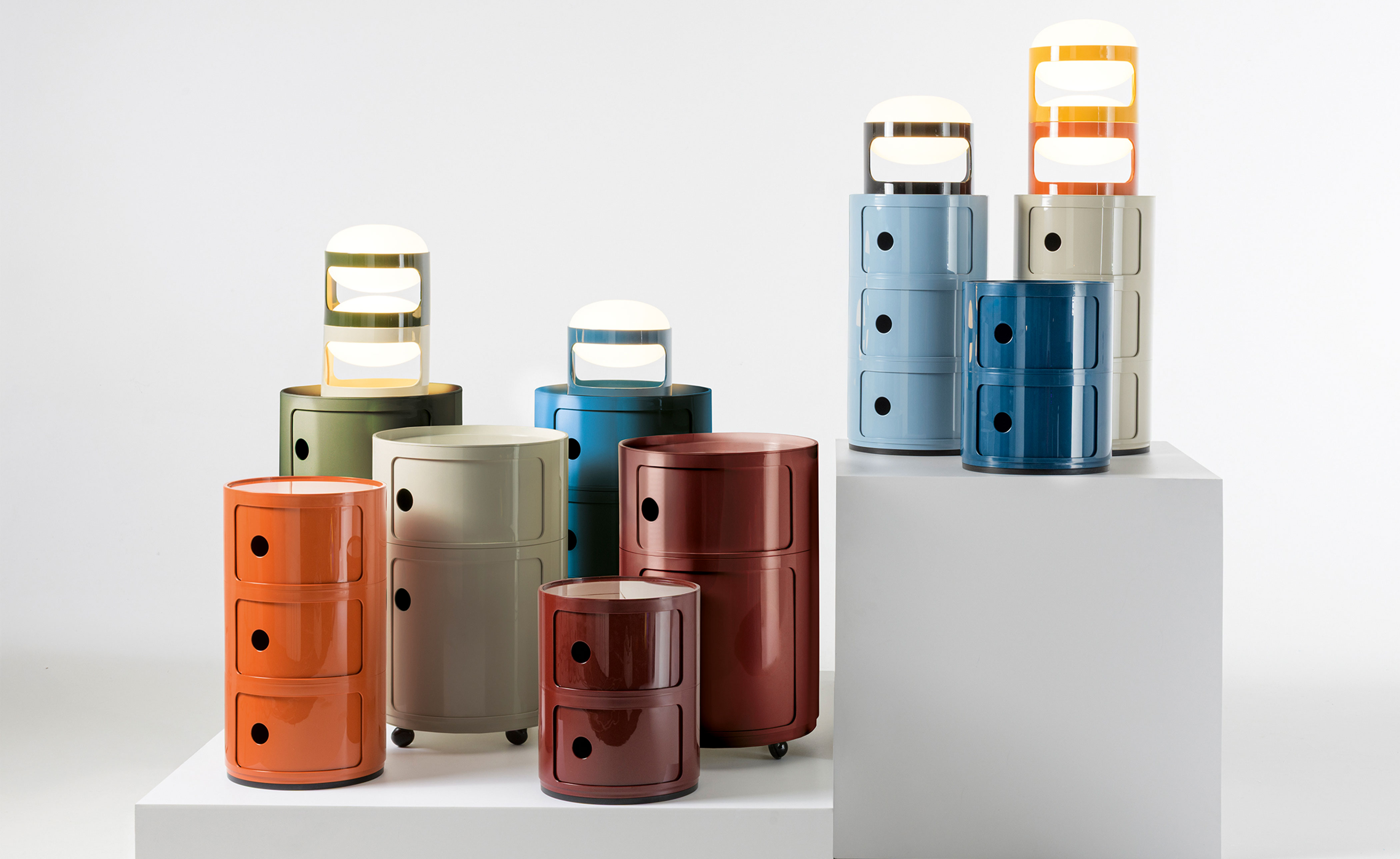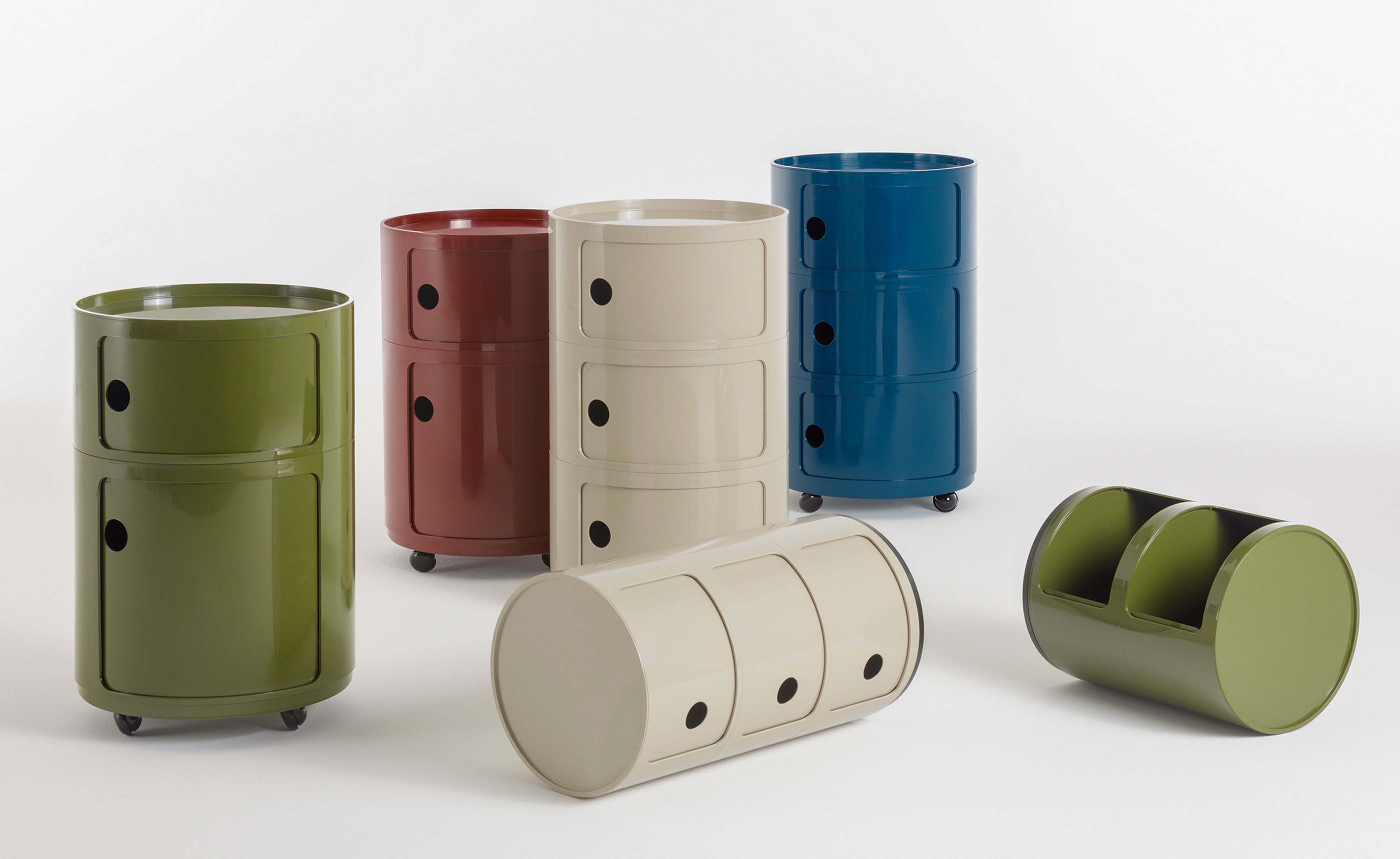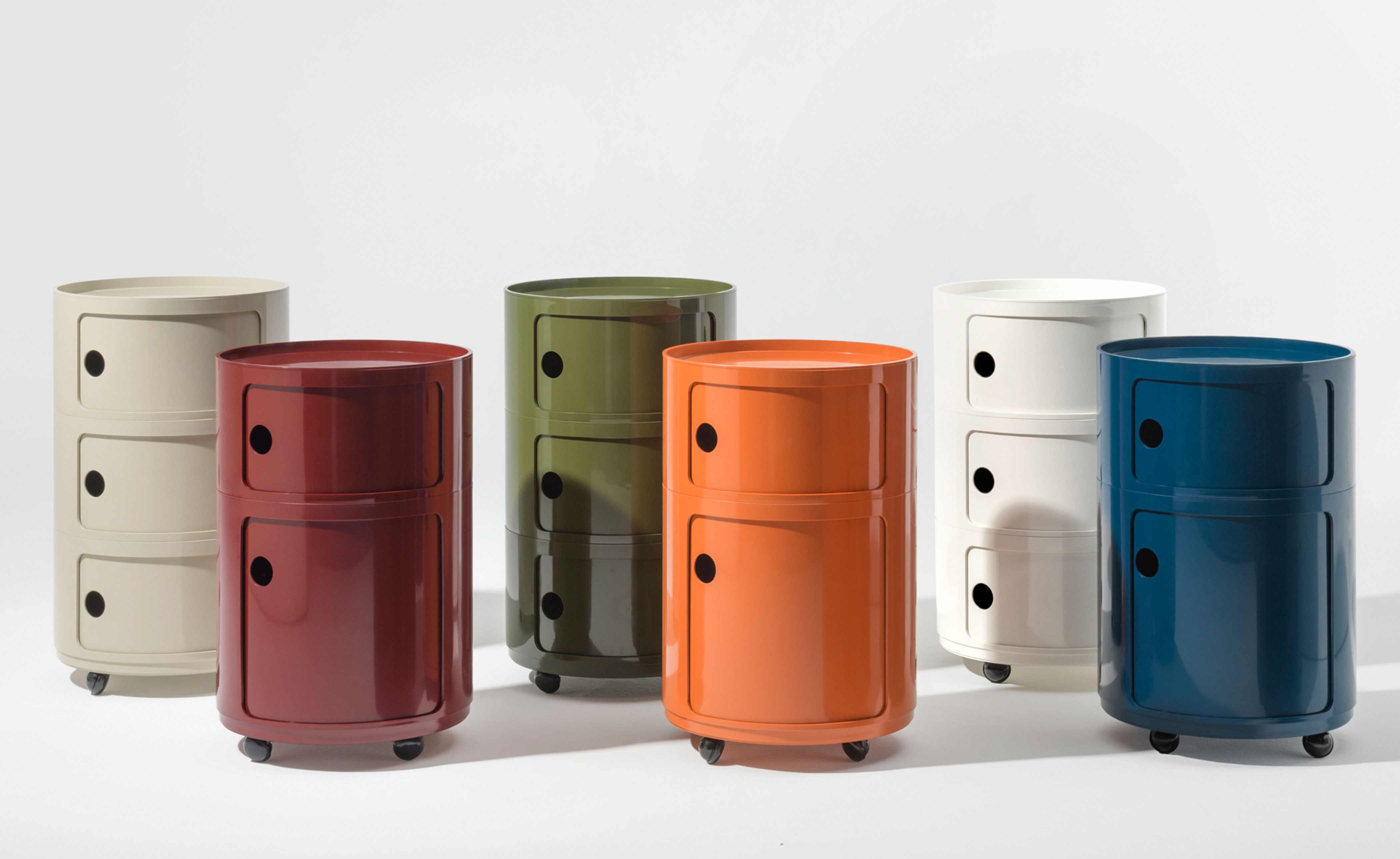 The 16.5" round version of Anna Castelli Ferrieri's Componibili now comes in an all-new look thanks to a new industrial print that enhances both quality and appearance. There are more colors to choose from too, with the addition of nuances already available for the 12.6" size complemented by original new shades that blend contemporary taste with elegant references to the past.