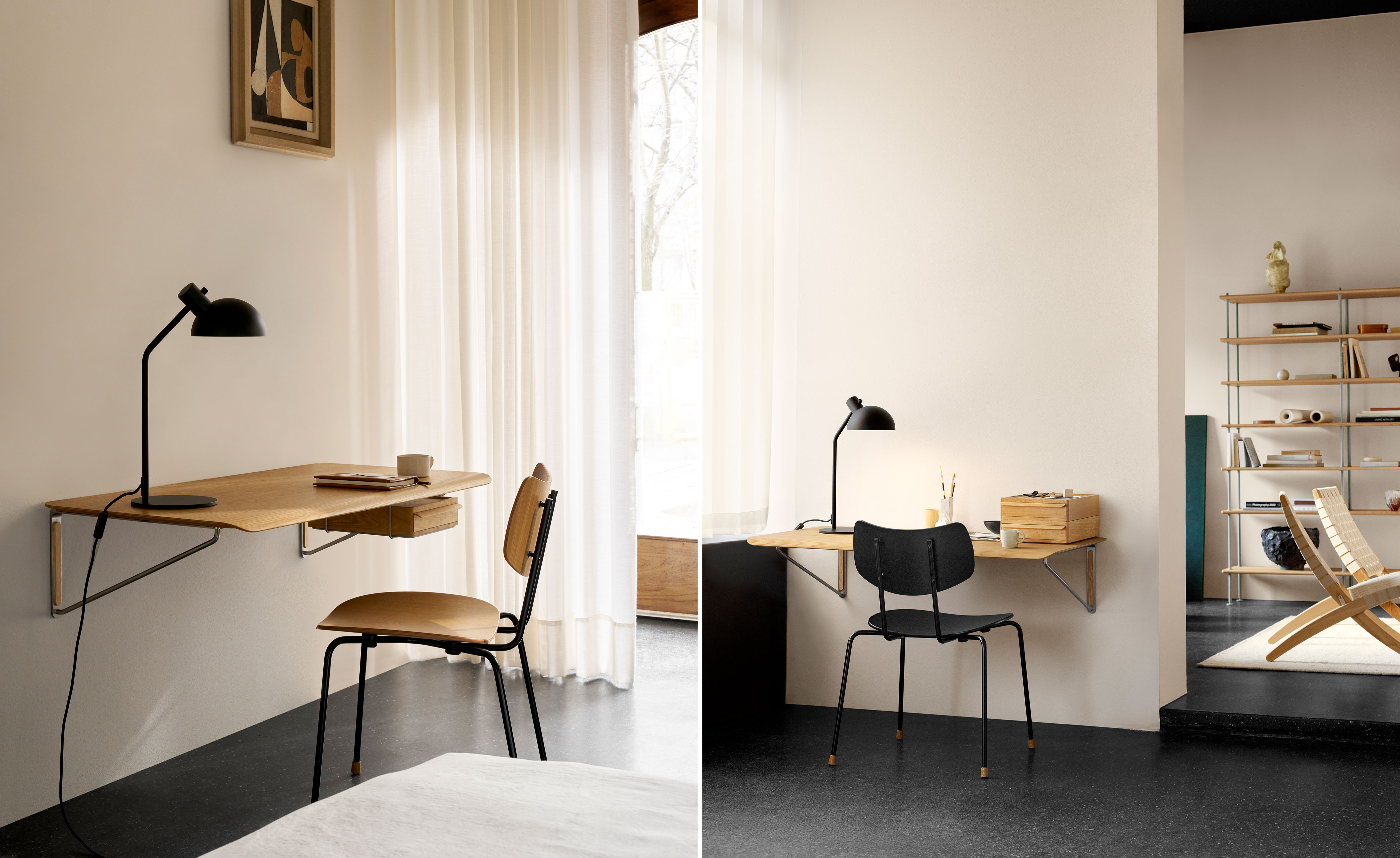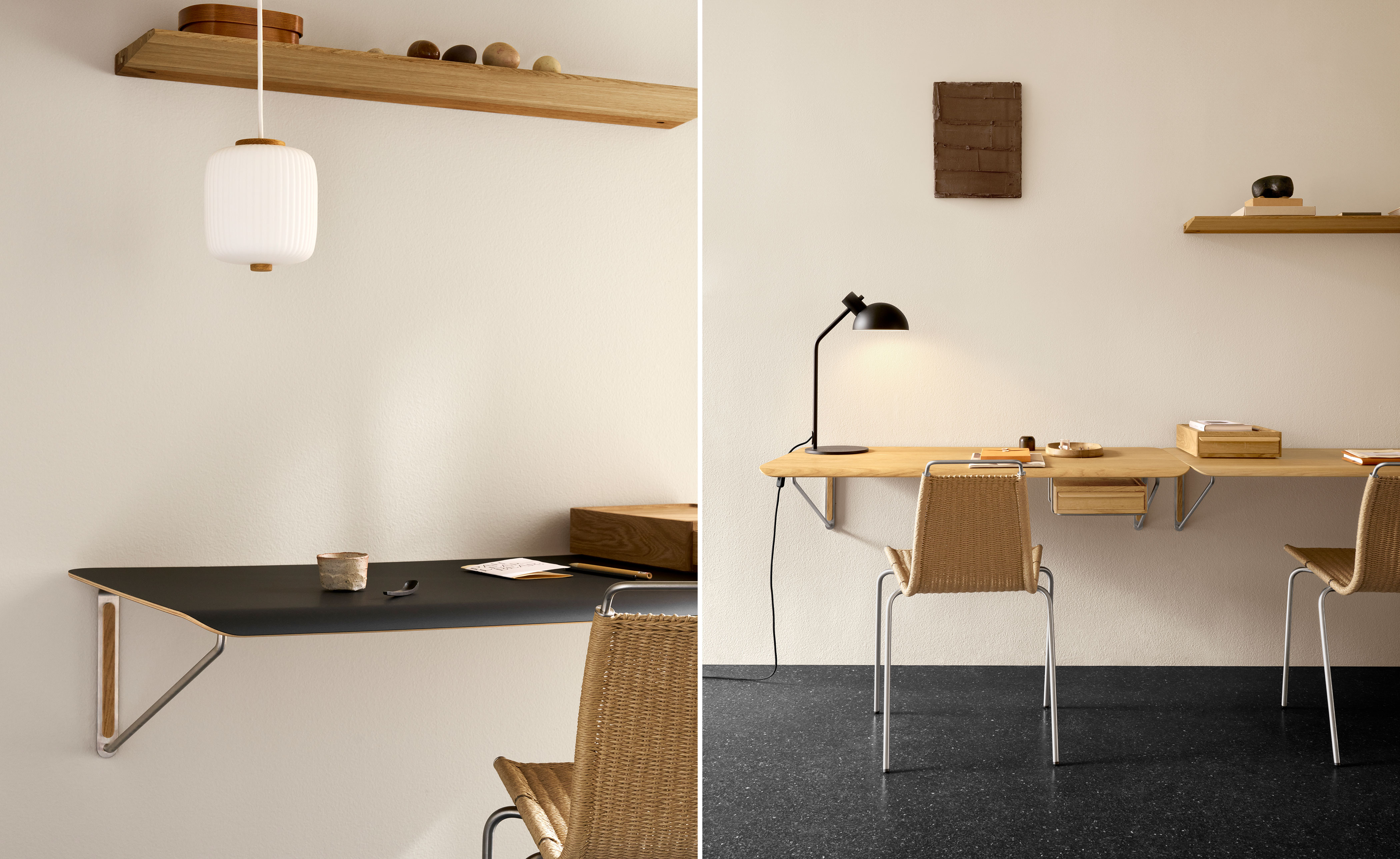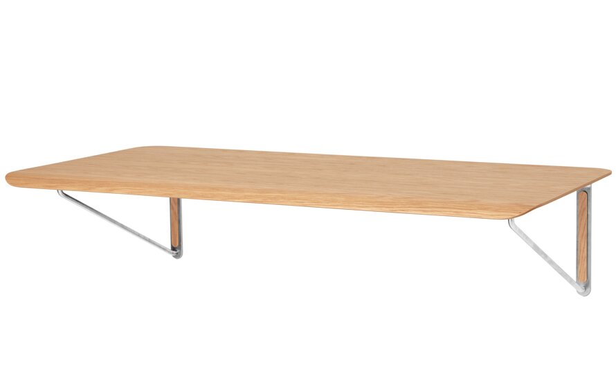 Inspired by his own experiences of Japanese tiny living, Anker Bak's elegant and functional desk presents versatile work and play solutions for smaller spaces. The AB019 Wall Desk displays a pared-back, minimalist expression with beautiful, functional details. This flat-packed design consists of a slim oak or laminate tabletop with a softly rounded edge that serves as a comfortable armrest. Contrasting stainless steel wall mounts give a sense of lightness and solid oak cover caps hide away the screws for a seamless look.