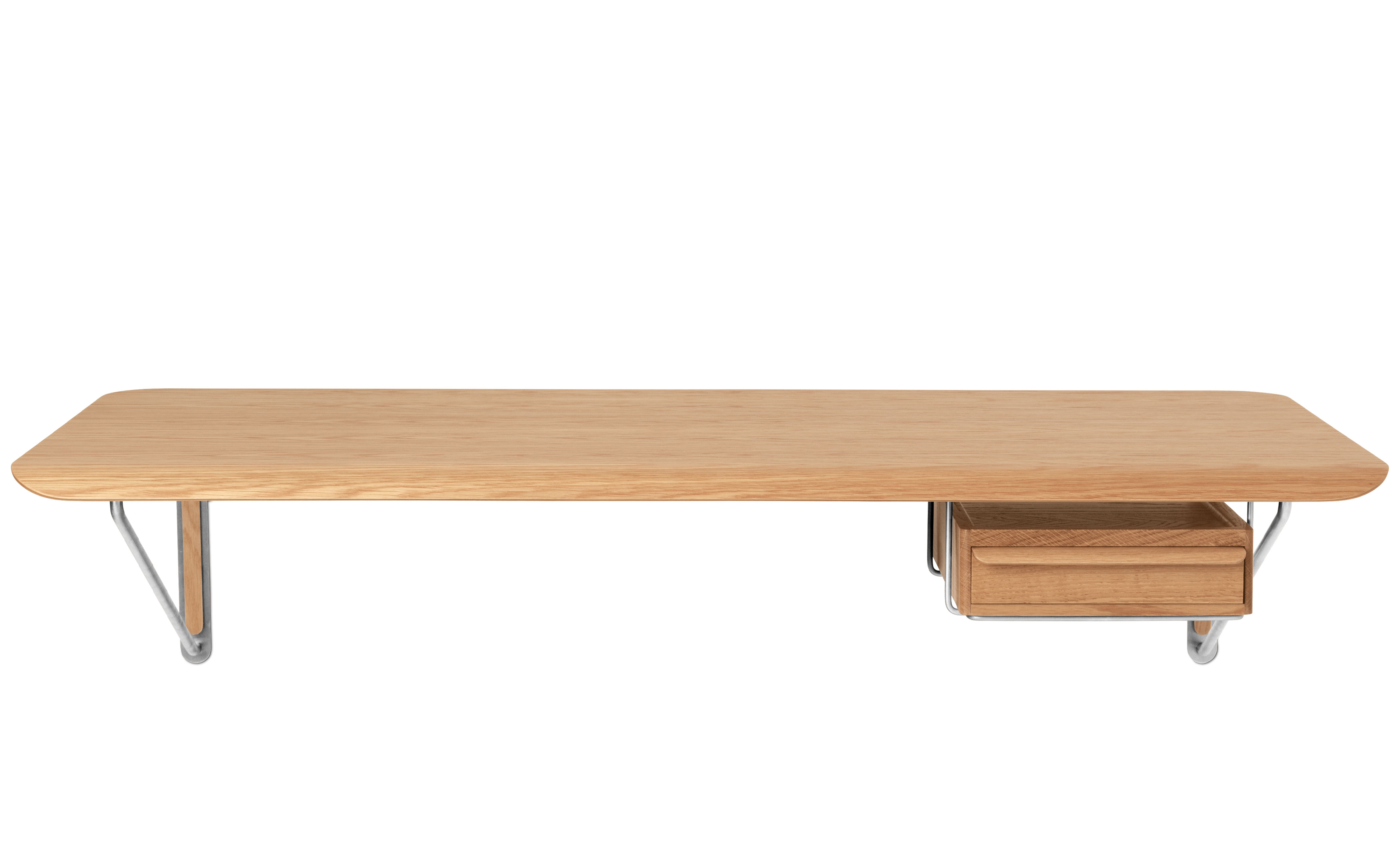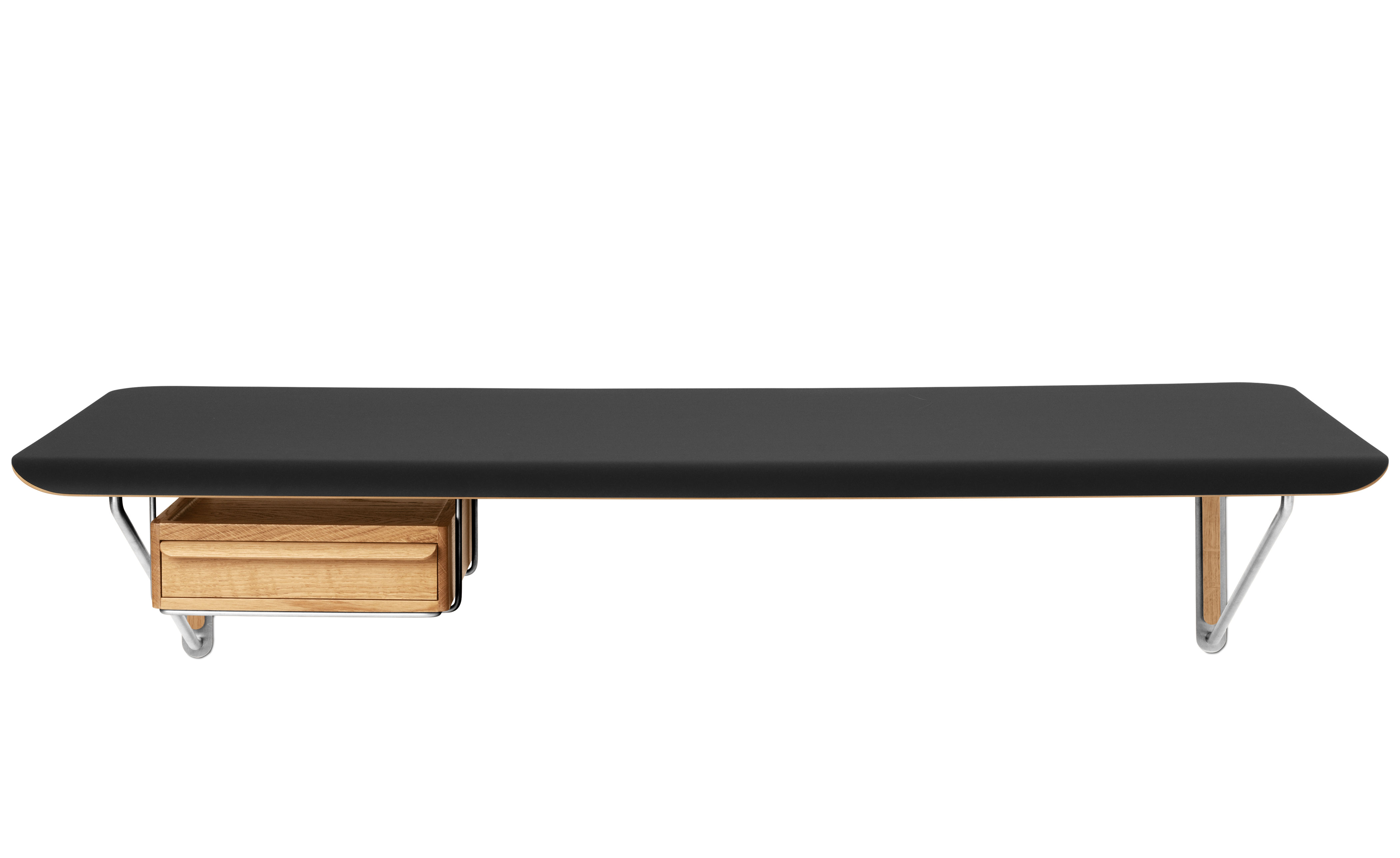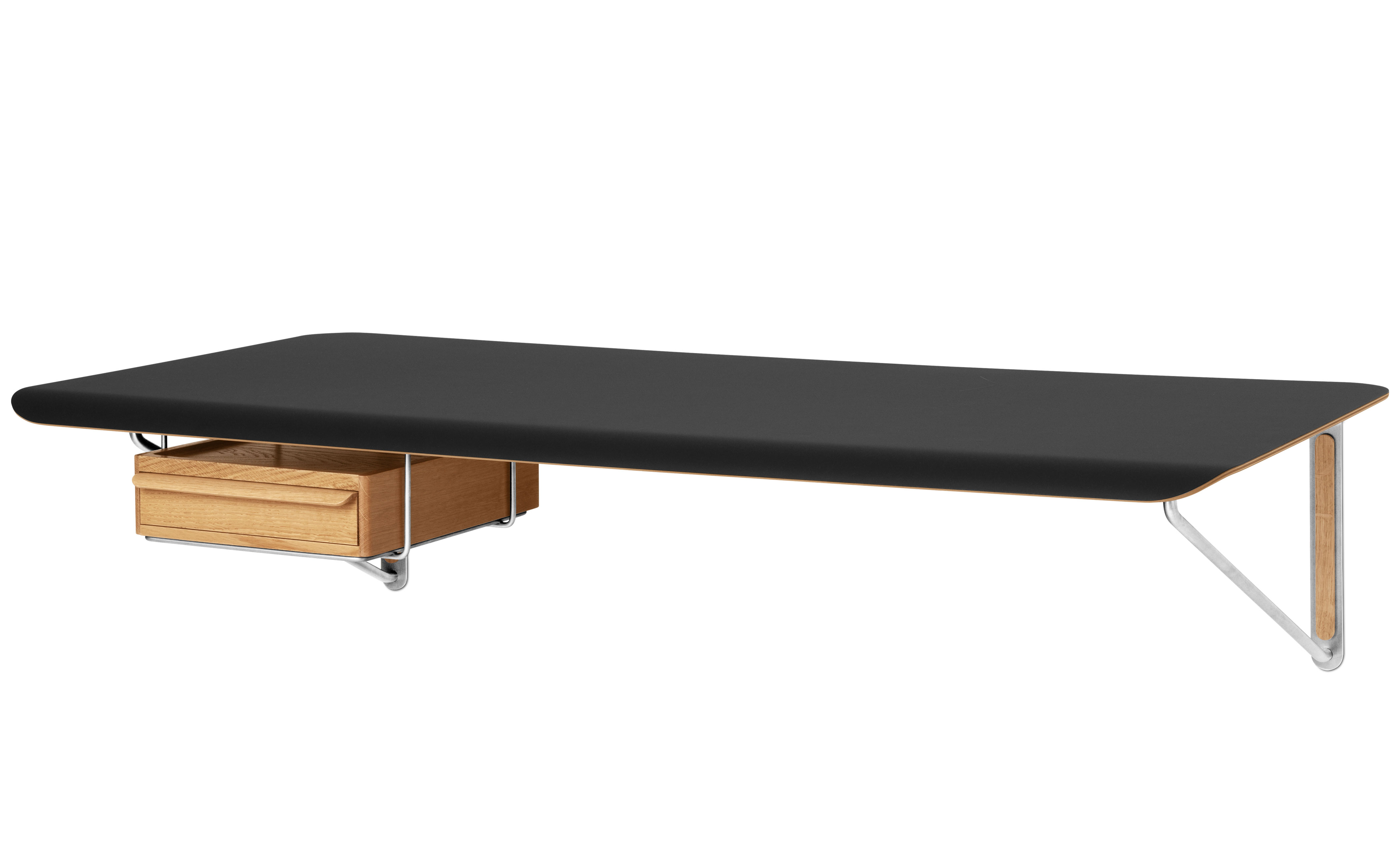 An optional AB020 Wall Desk Drawer crafted from solid oak can be mounted underneath in a separate stainless steel support or placed directly on the desk as a laptop stand.