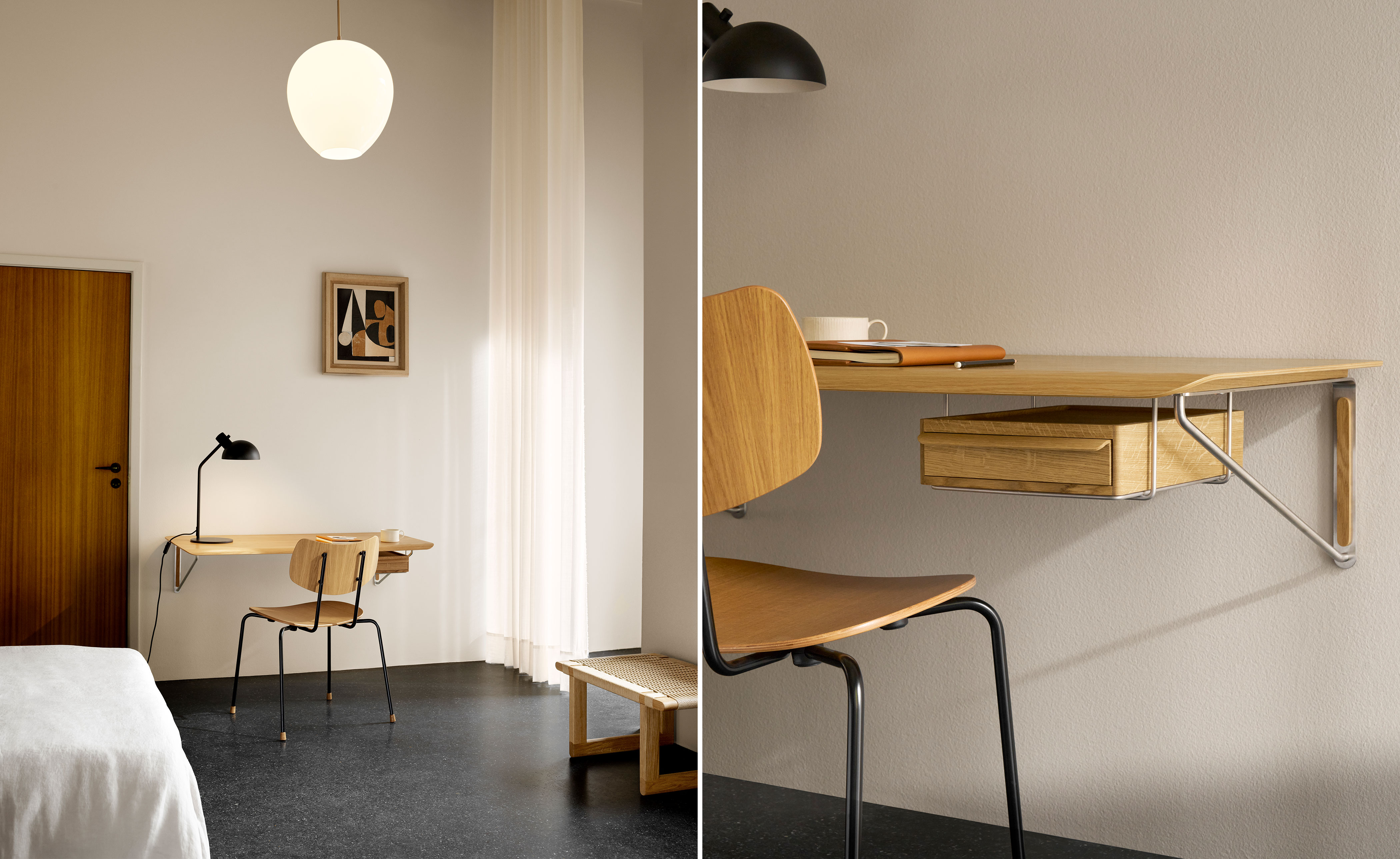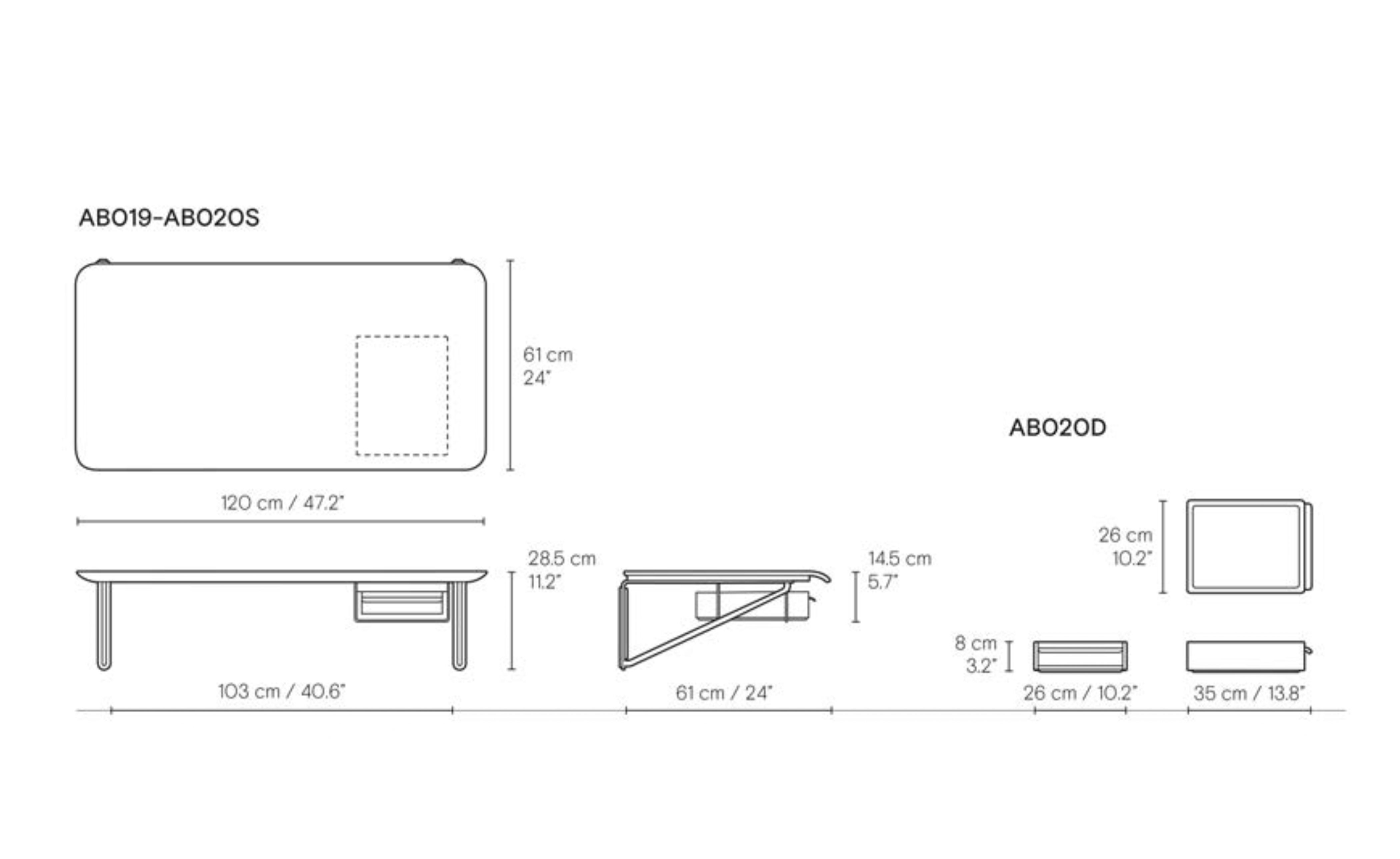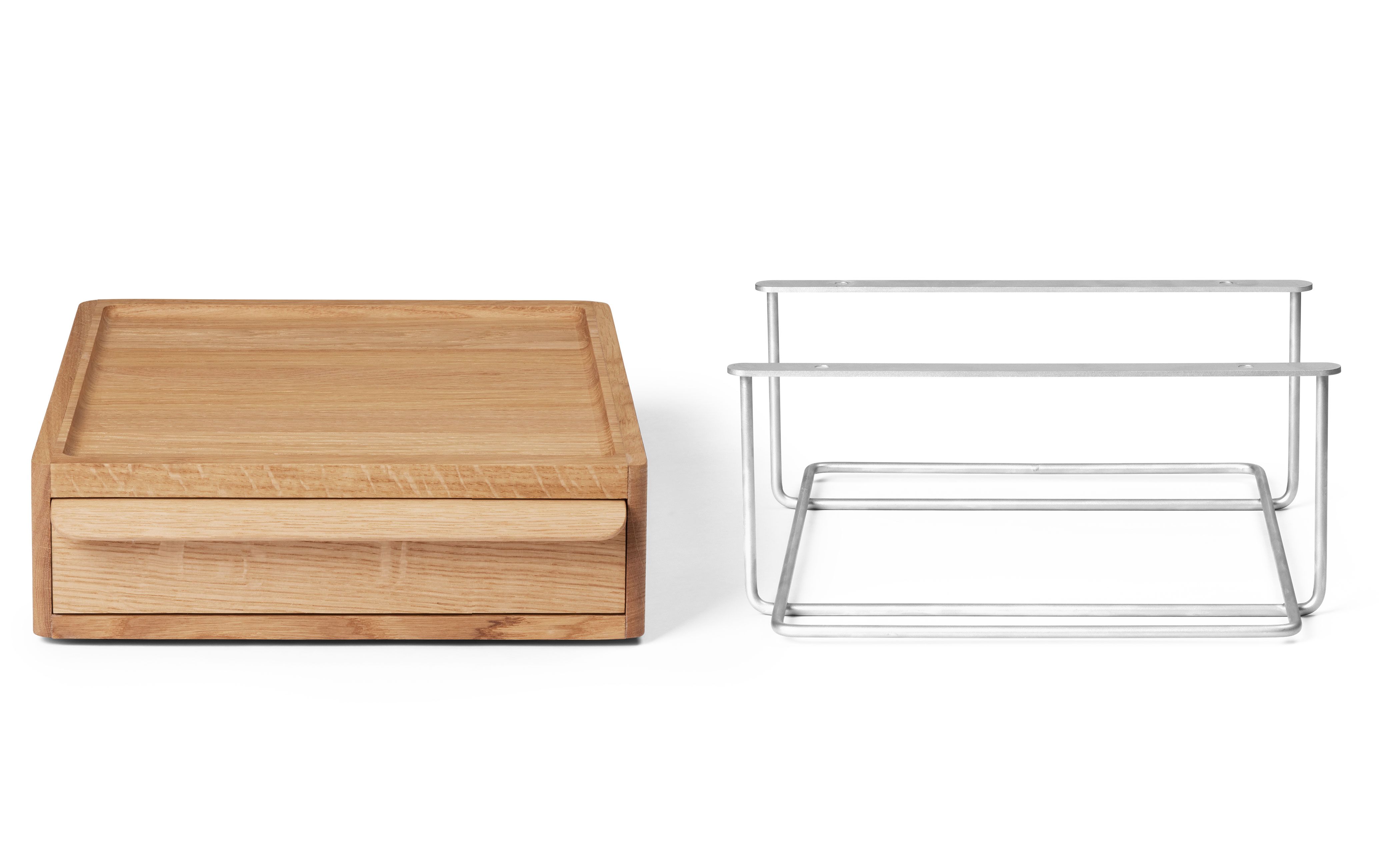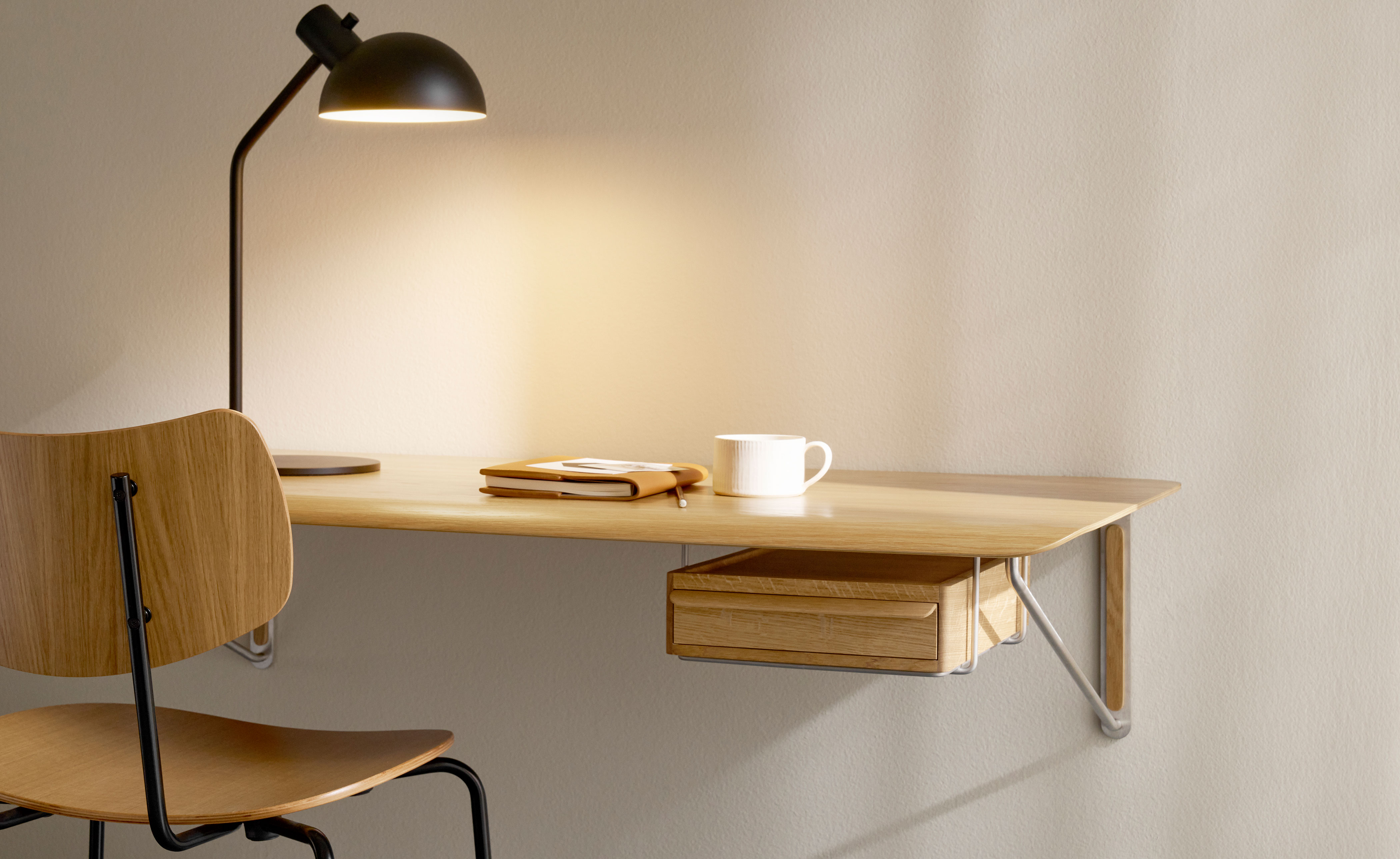 An optional AB020 Wall Desk Drawer crafted from solid oak can be mounted underneath in a separate stainless steel support or placed directly on the desk as a laptop stand.