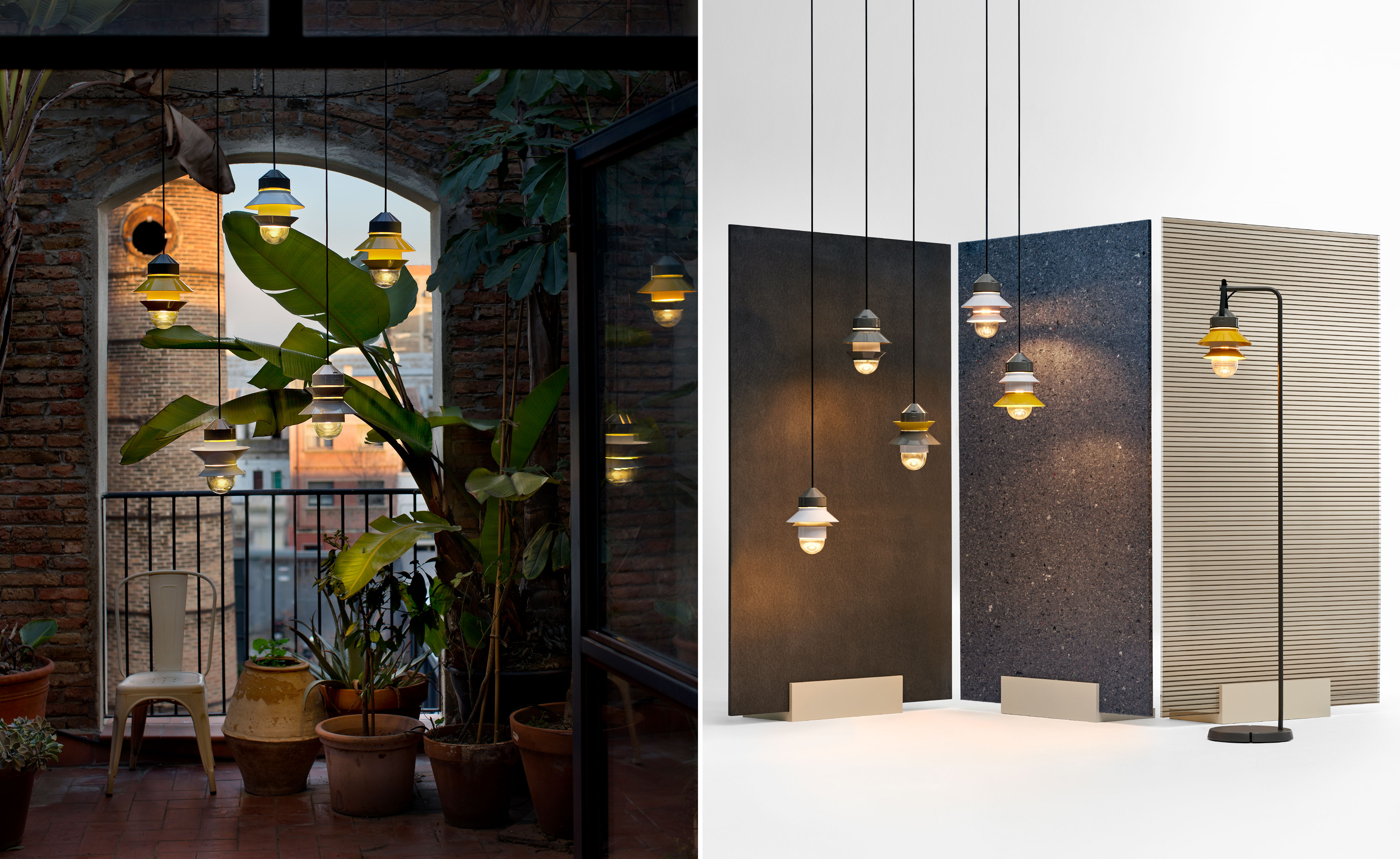 Inspired by the lanterns found on fishing boats, this collection of customizable lamps allows you to create multiple compositions. Users can choose how many shades to place on the diffuser, along with their order, position and direction. Available with different colored shades, this interplay of combinations yields a rich array of direct or reflected light.