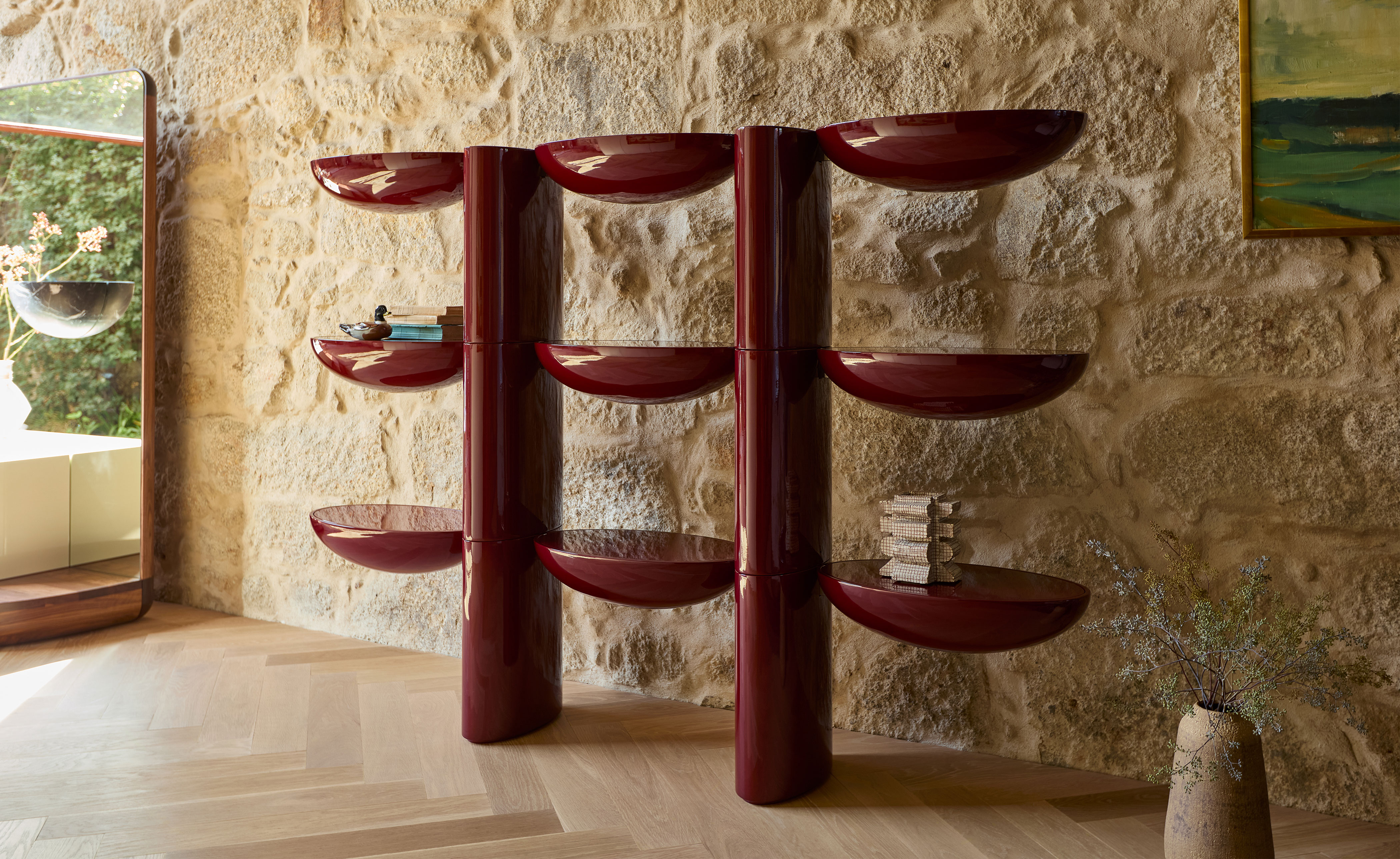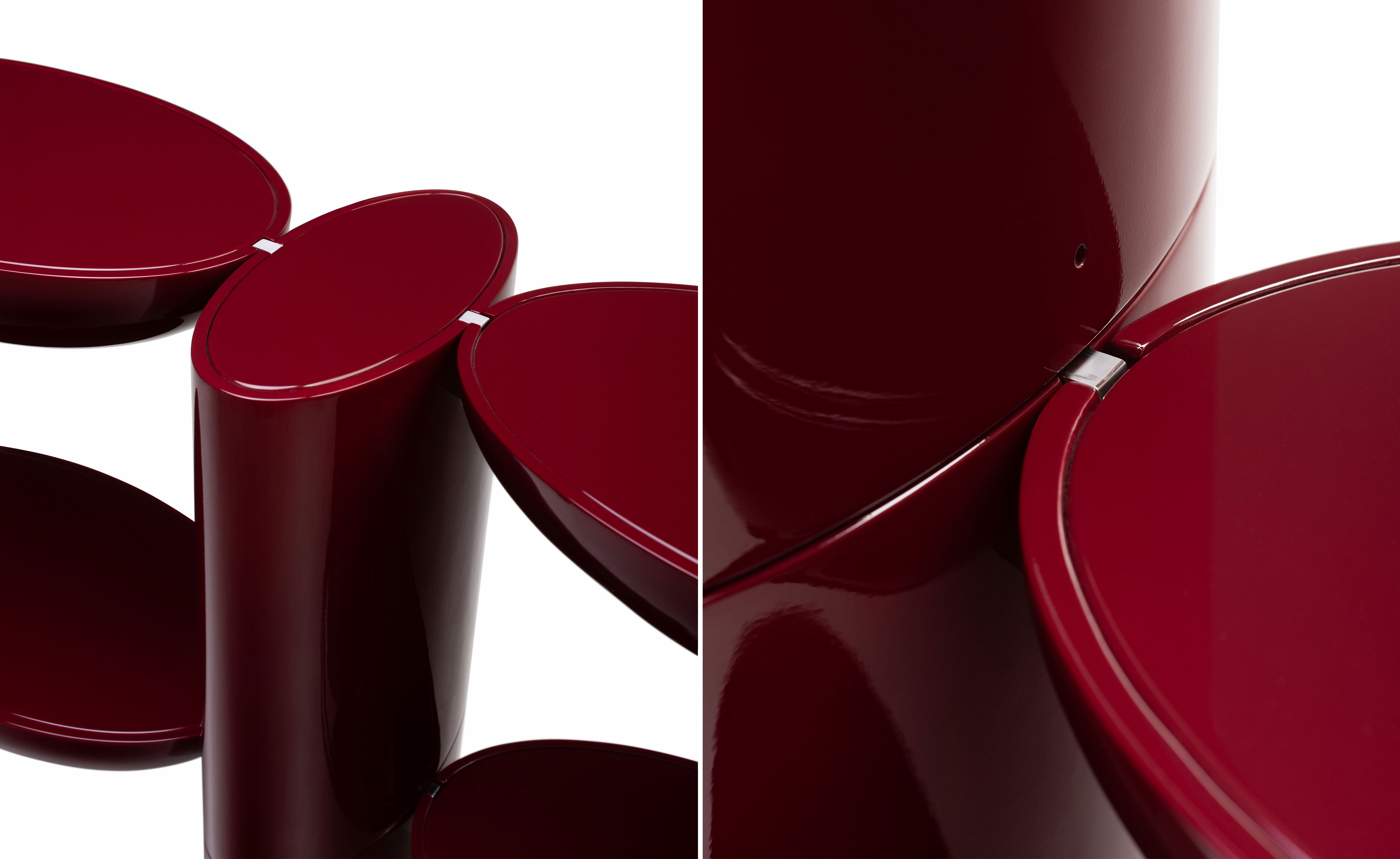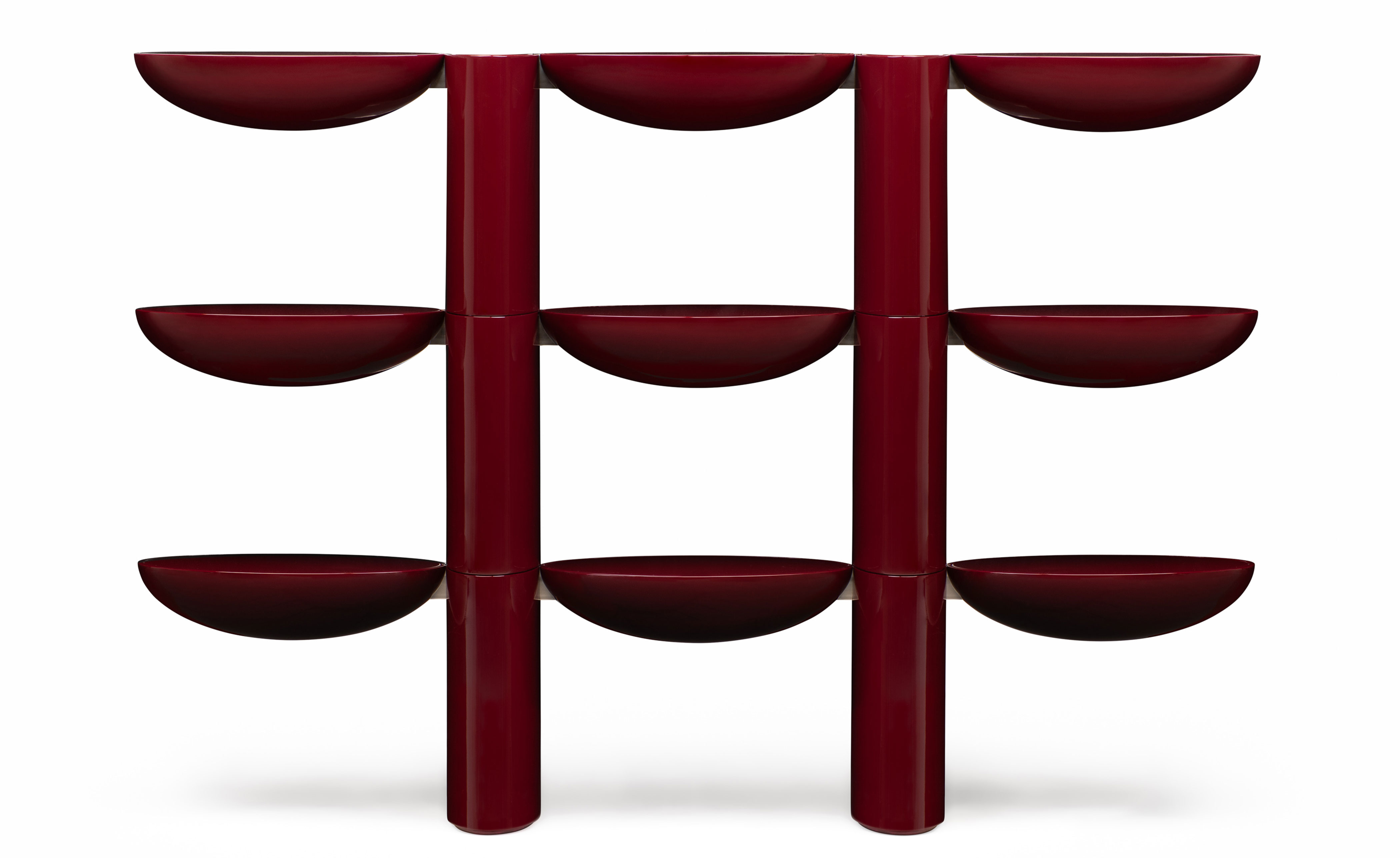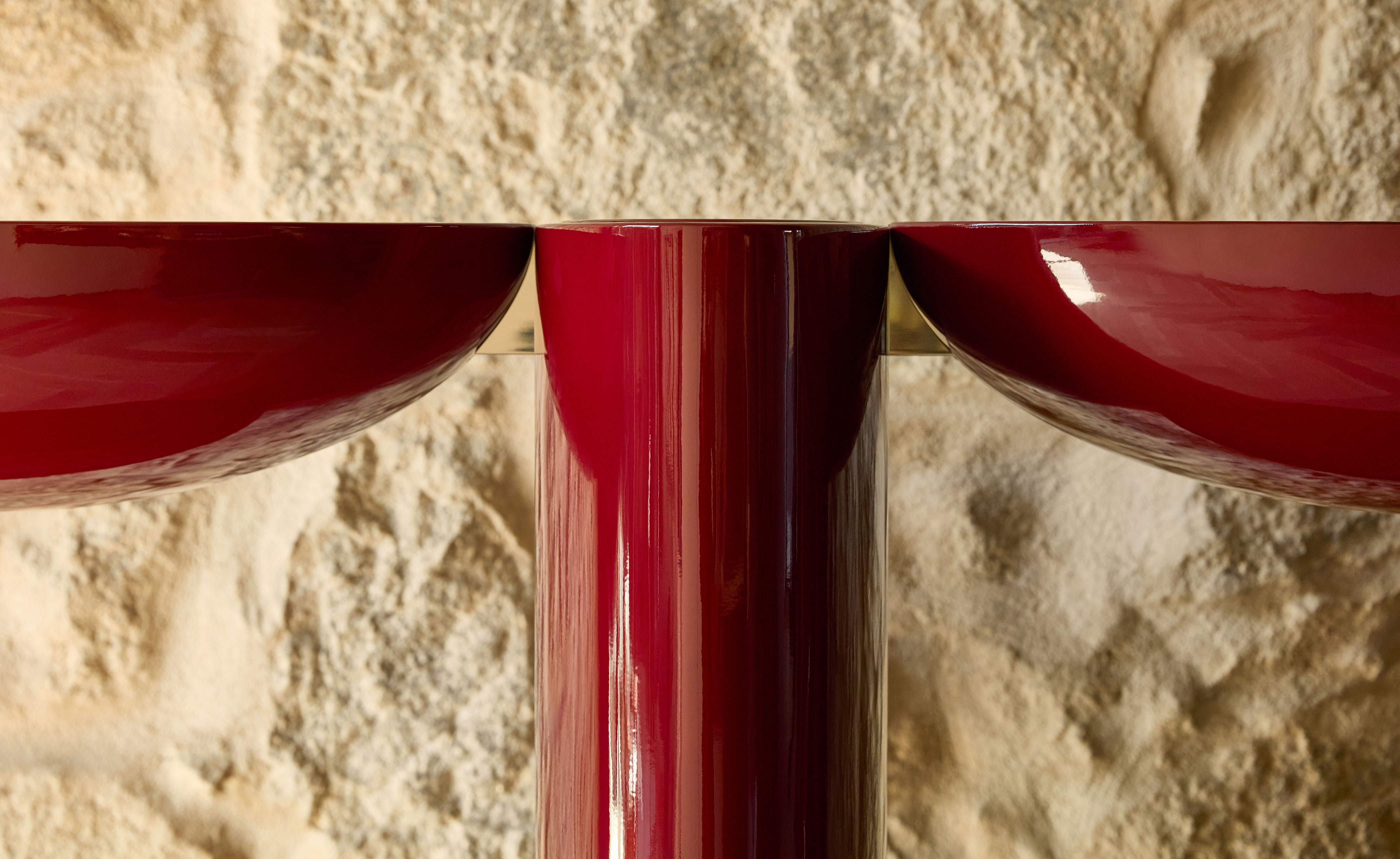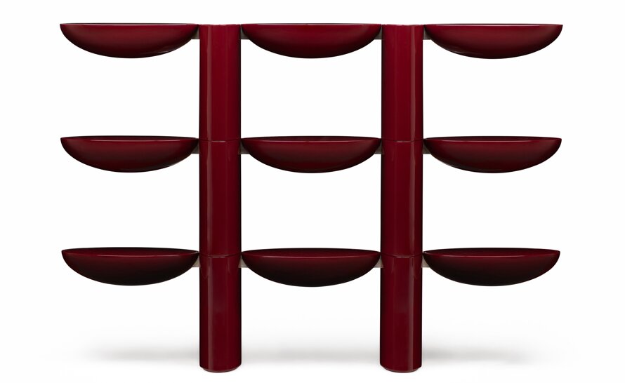 Tai Hen artfully frames spaces and objects with its bold lacquer form. A functional piece with vivid color and a reflective surface.