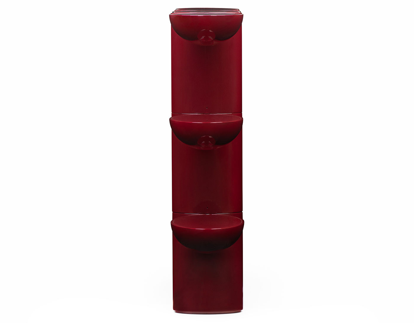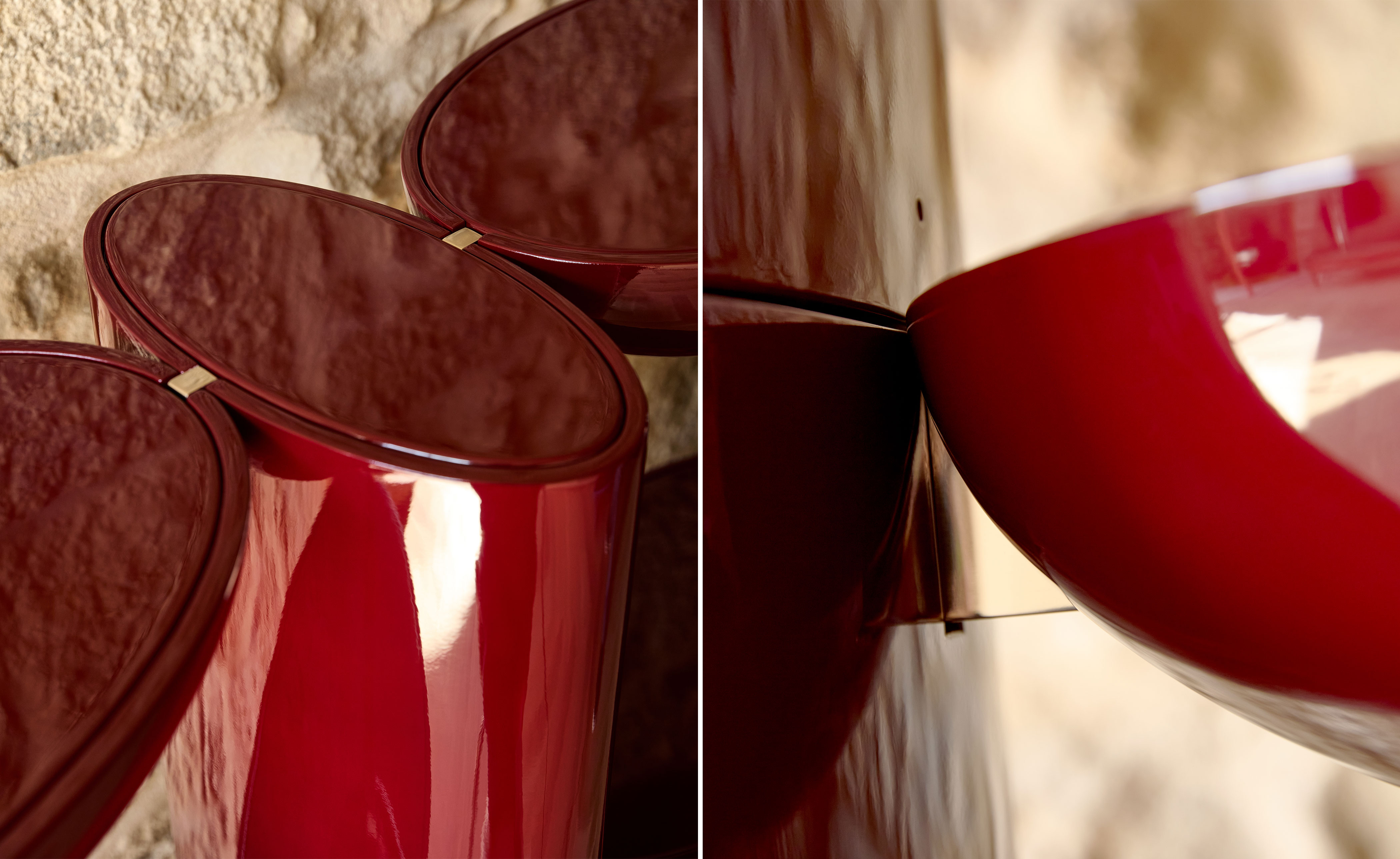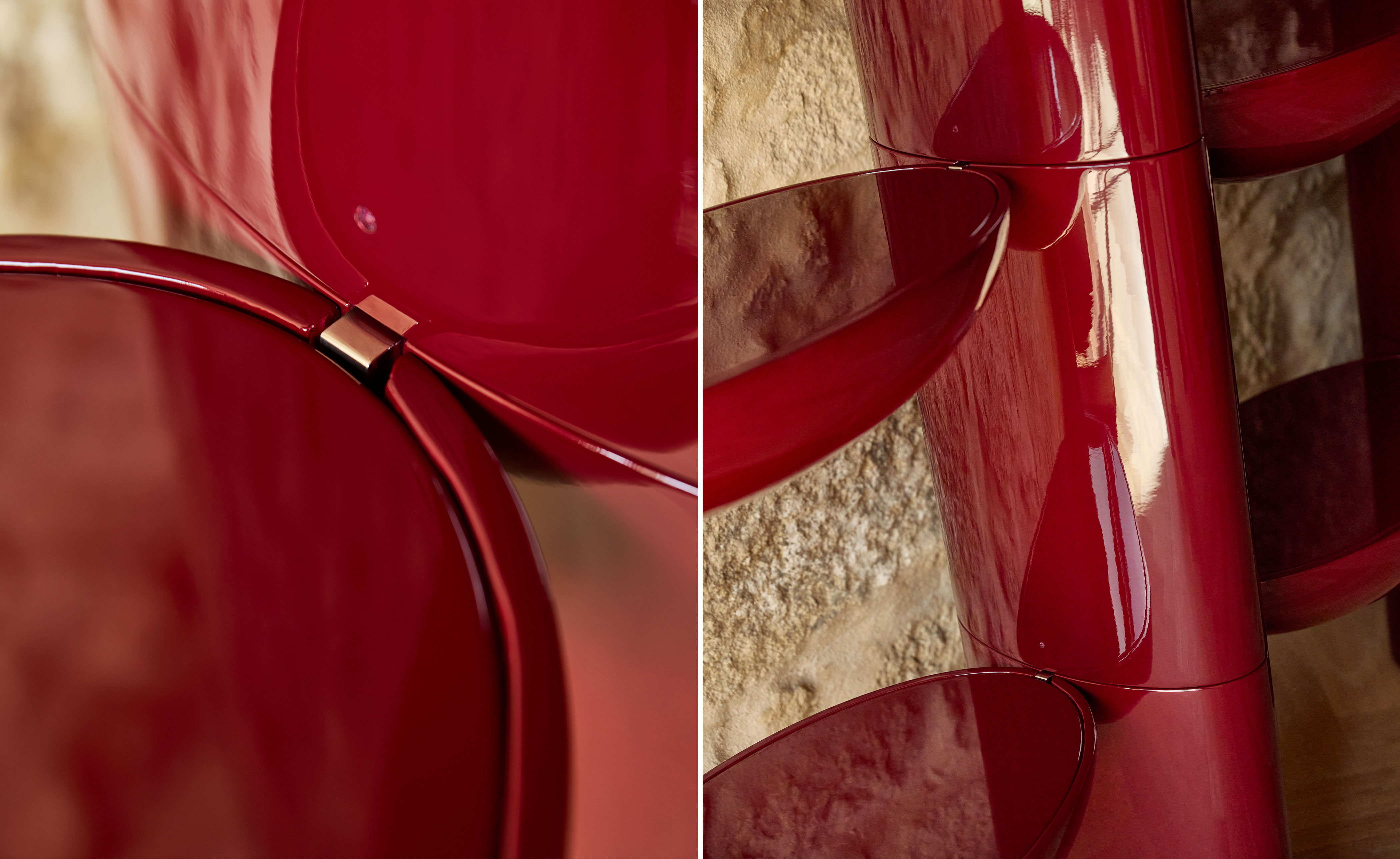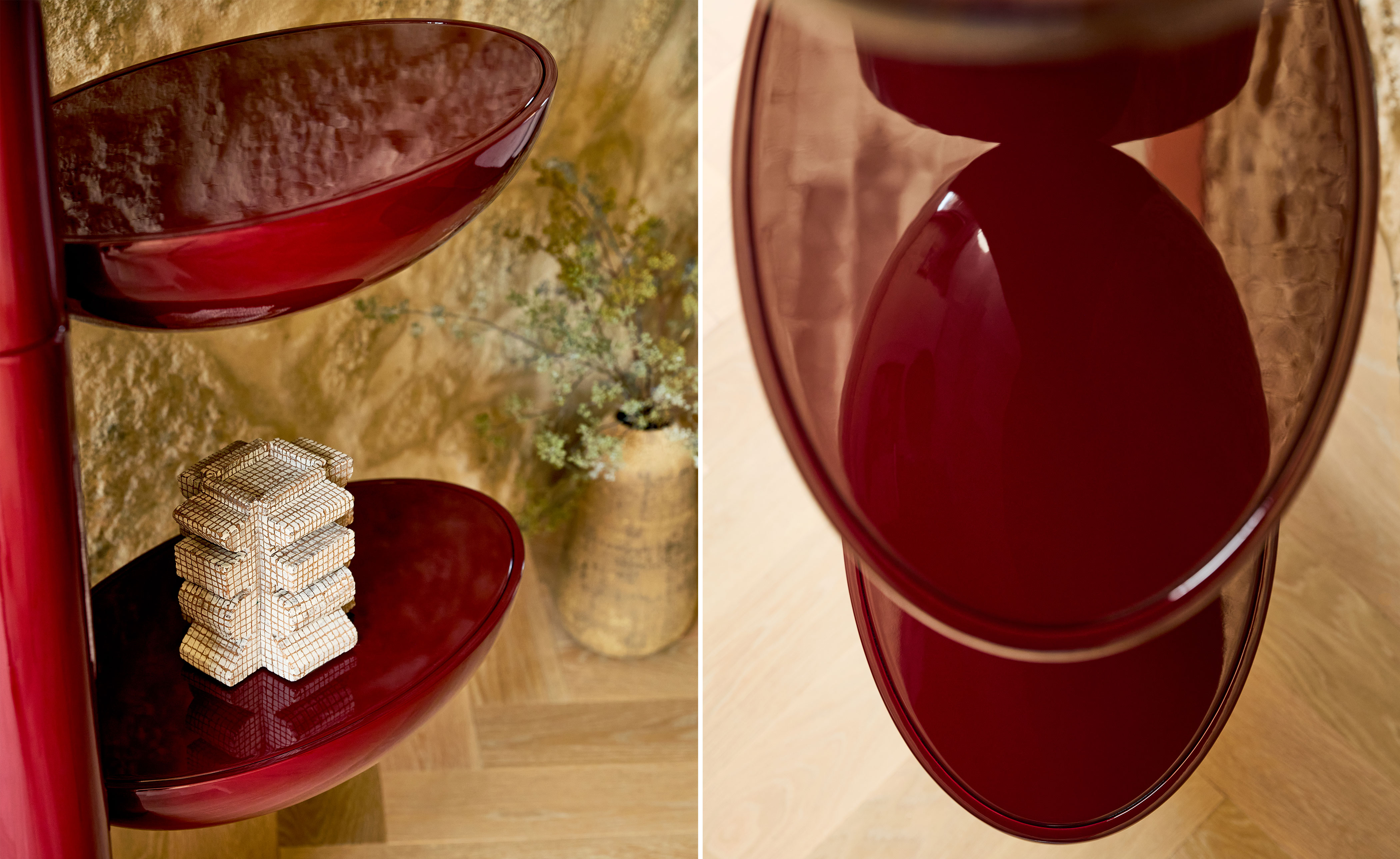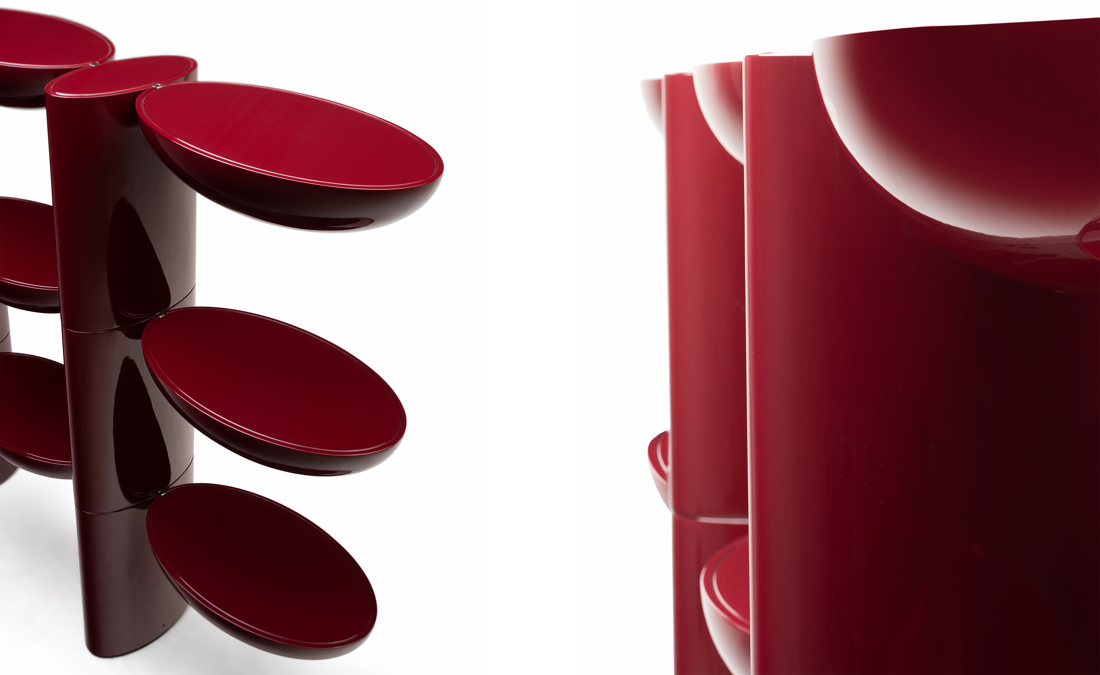 Tai Hen artfully frames spaces and objects with its bold lacquer form. A functional piece with vivid color and a reflective surface.