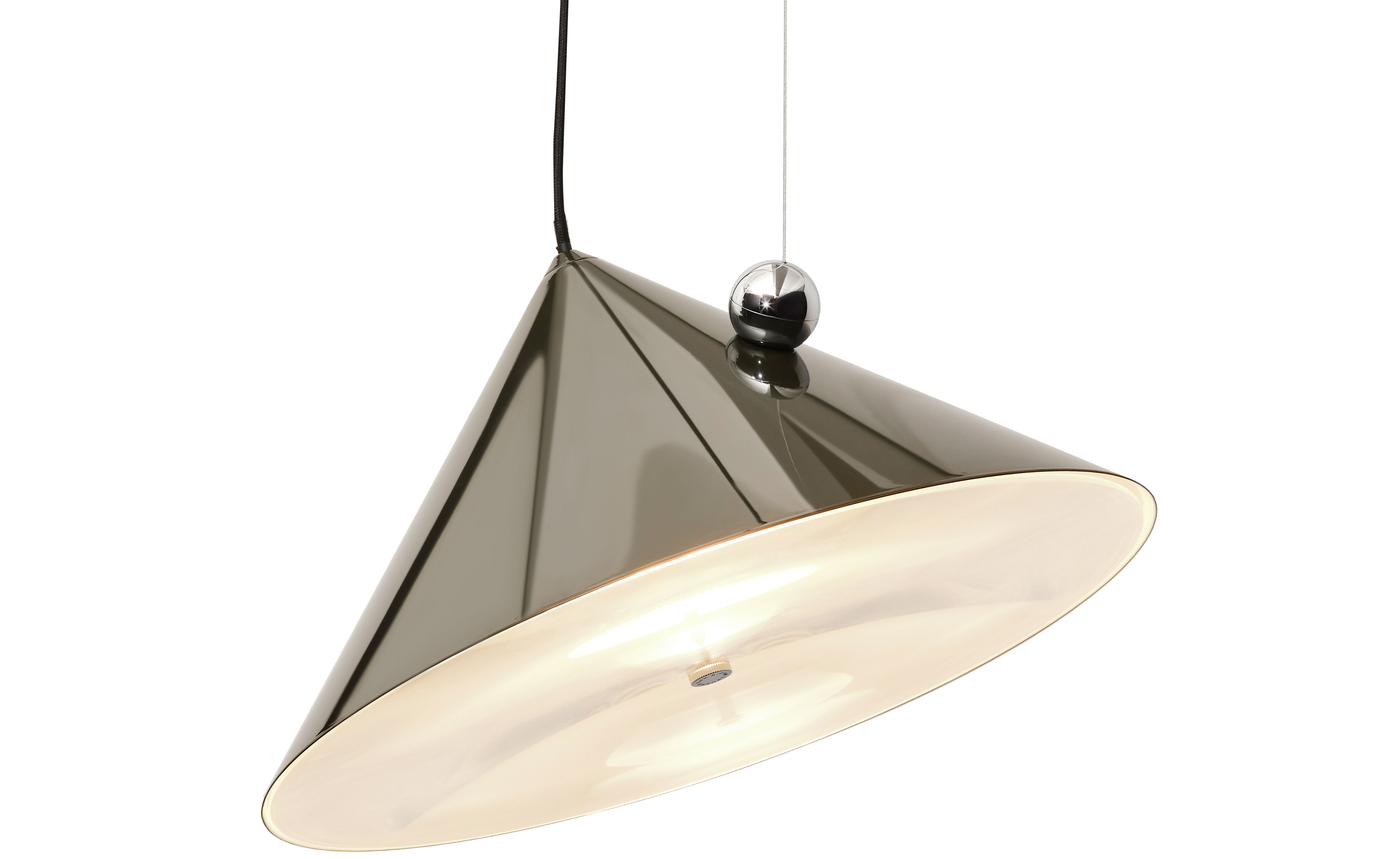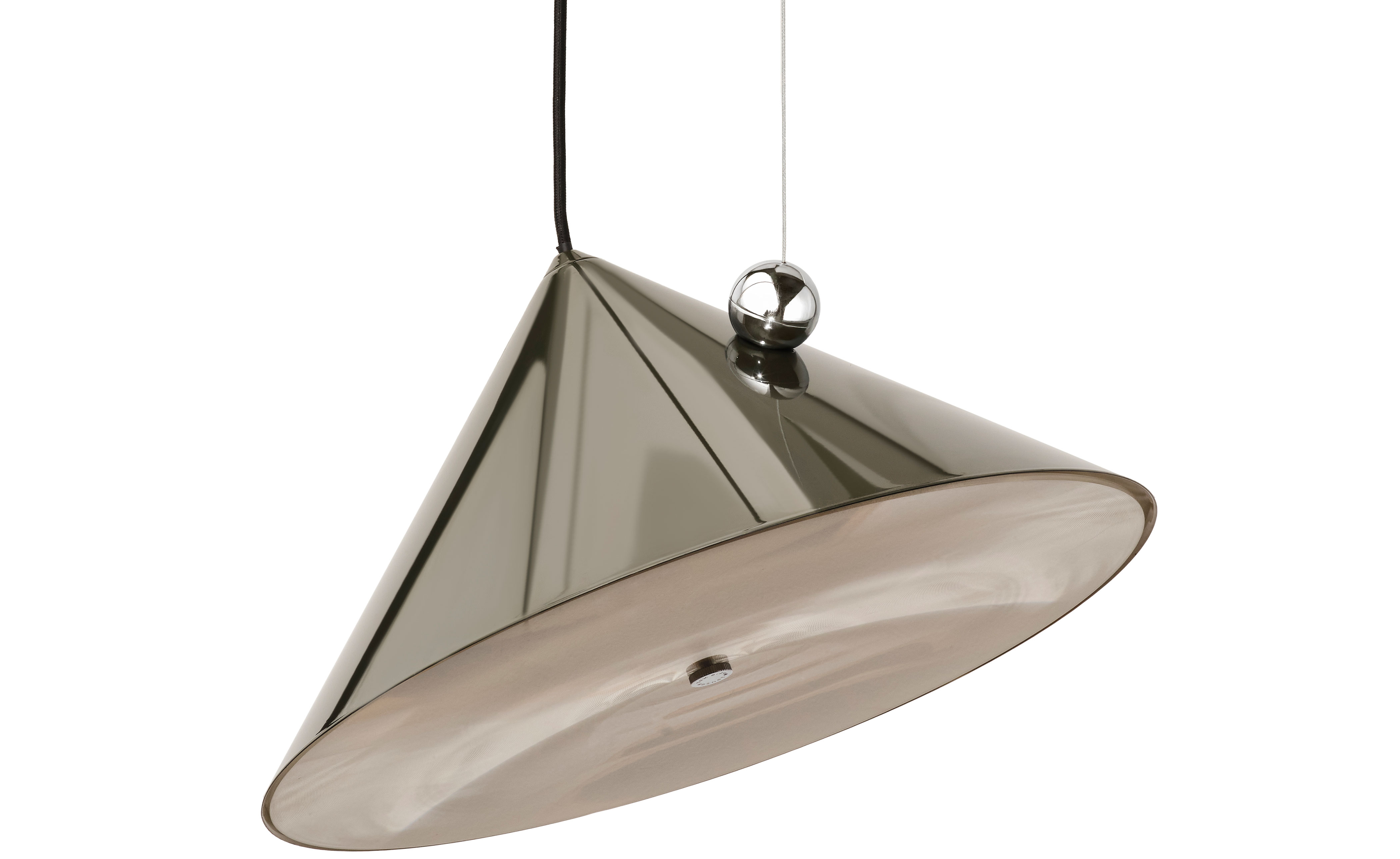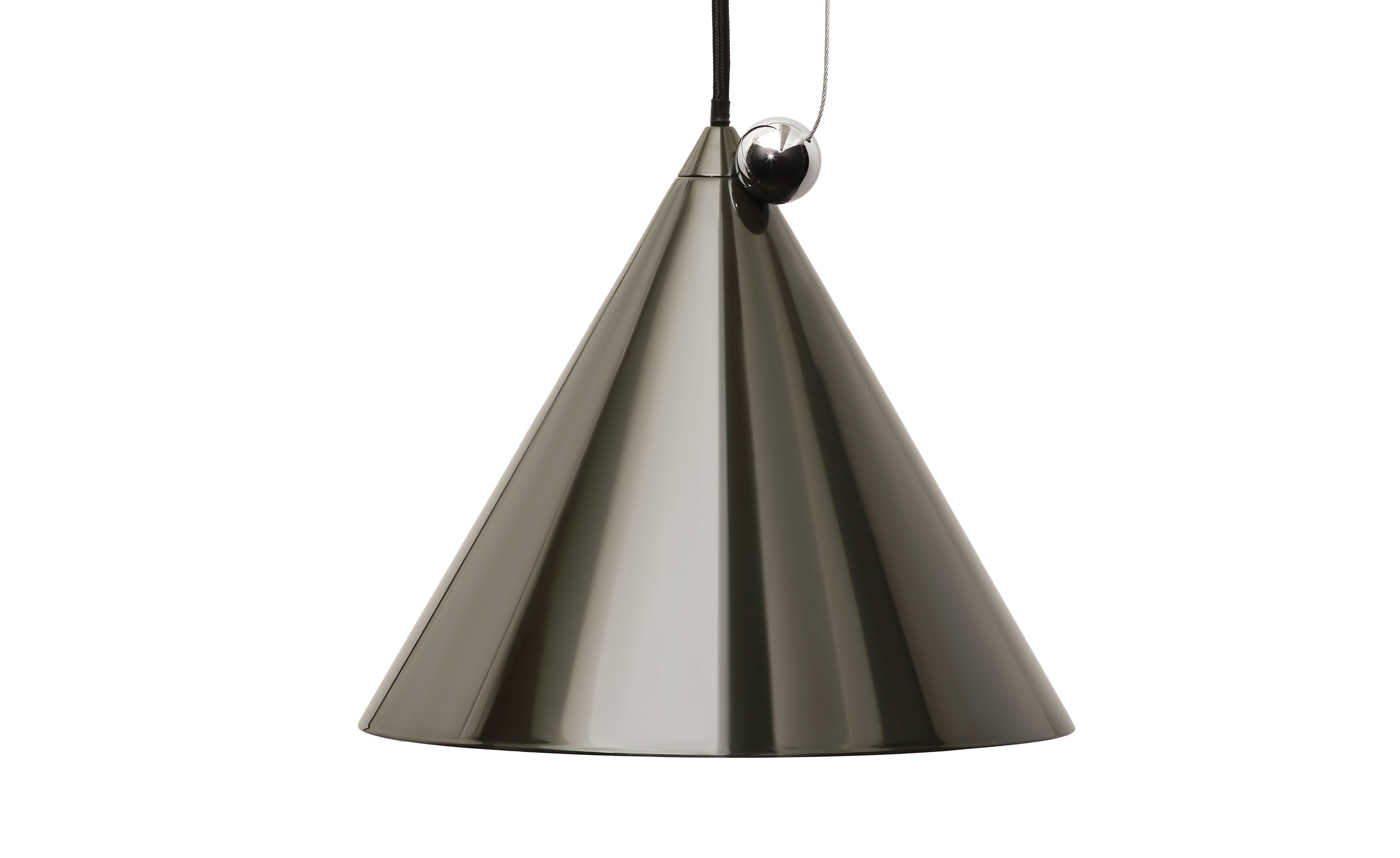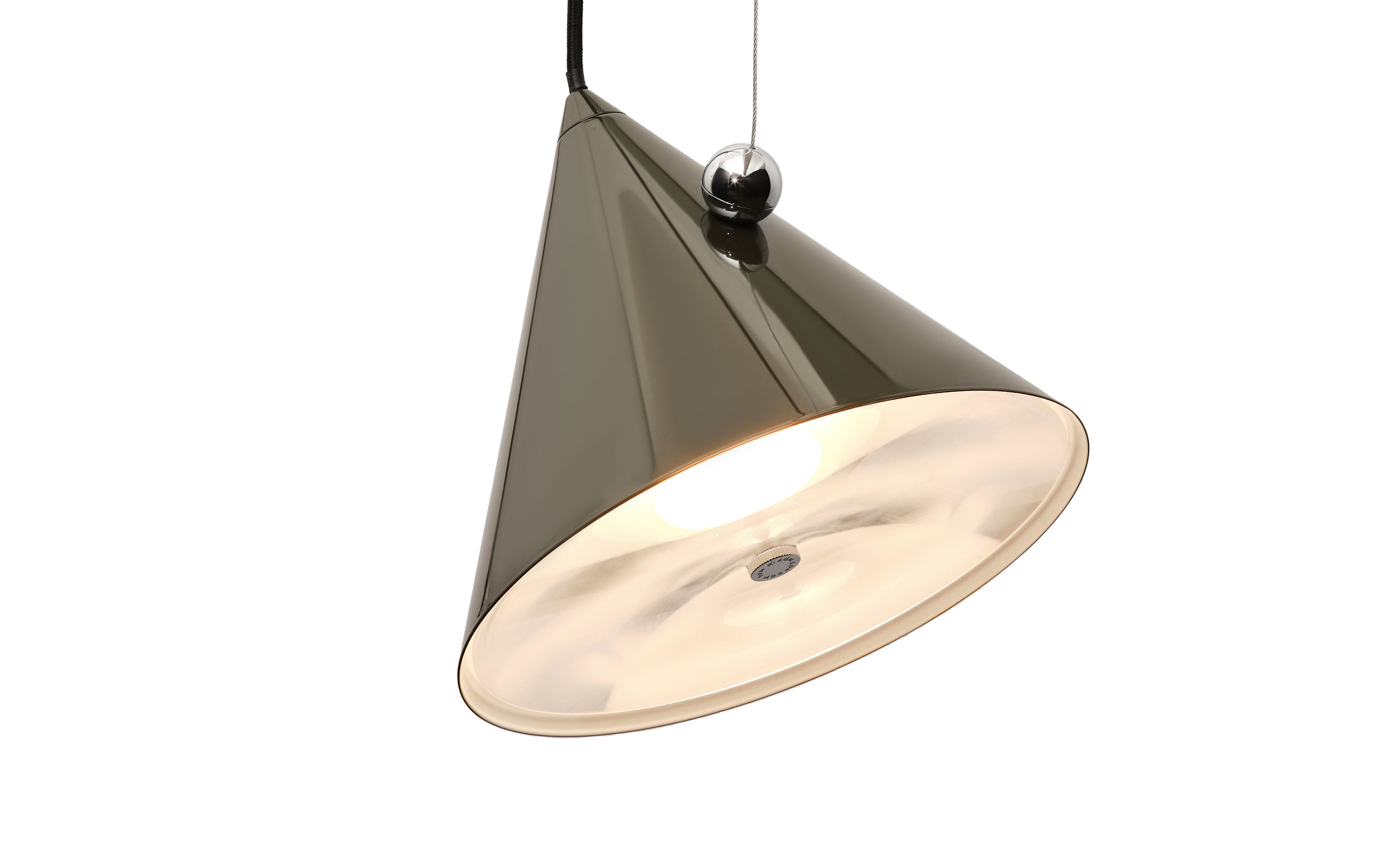 Inspired by the balance of conical forms and the principles of optical physics, it features a Fresnel lens to provide directional light. The POSE Pendant include a highly polished magnetic sphere and custom chrome ball joint, which enables precise directional adjustment for downlighting, backlighting or accent lighting. Available in two sizes, POSE is crafted from steel and comes with a 2700k LED replaceable light source.