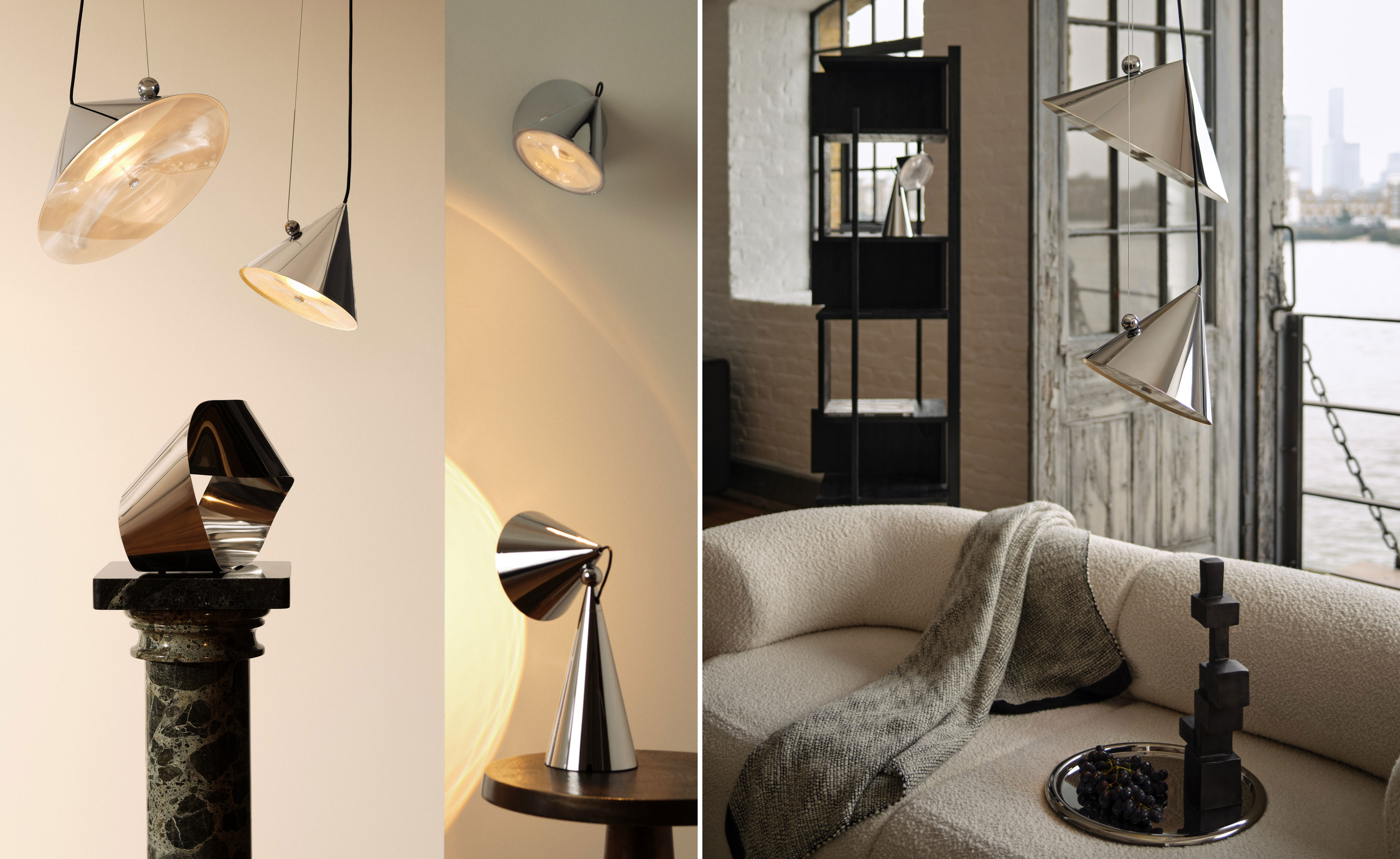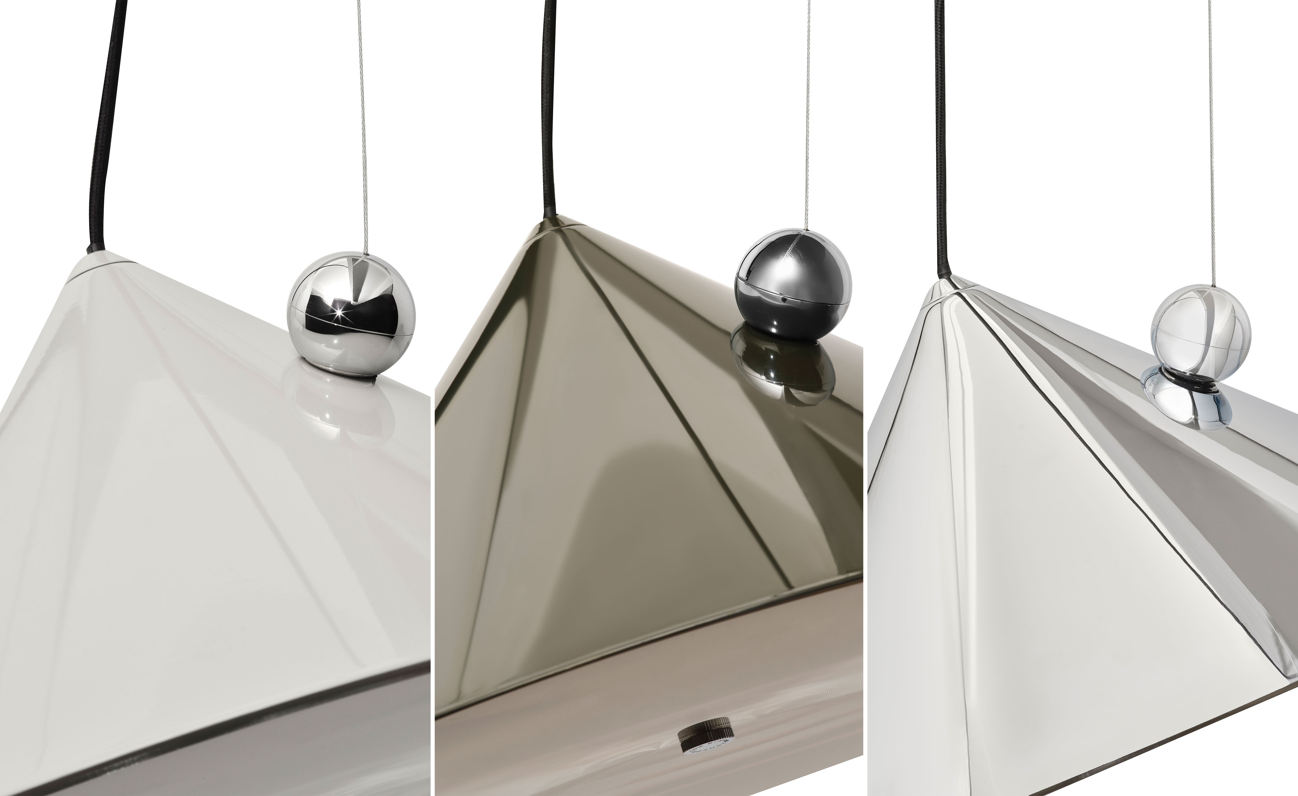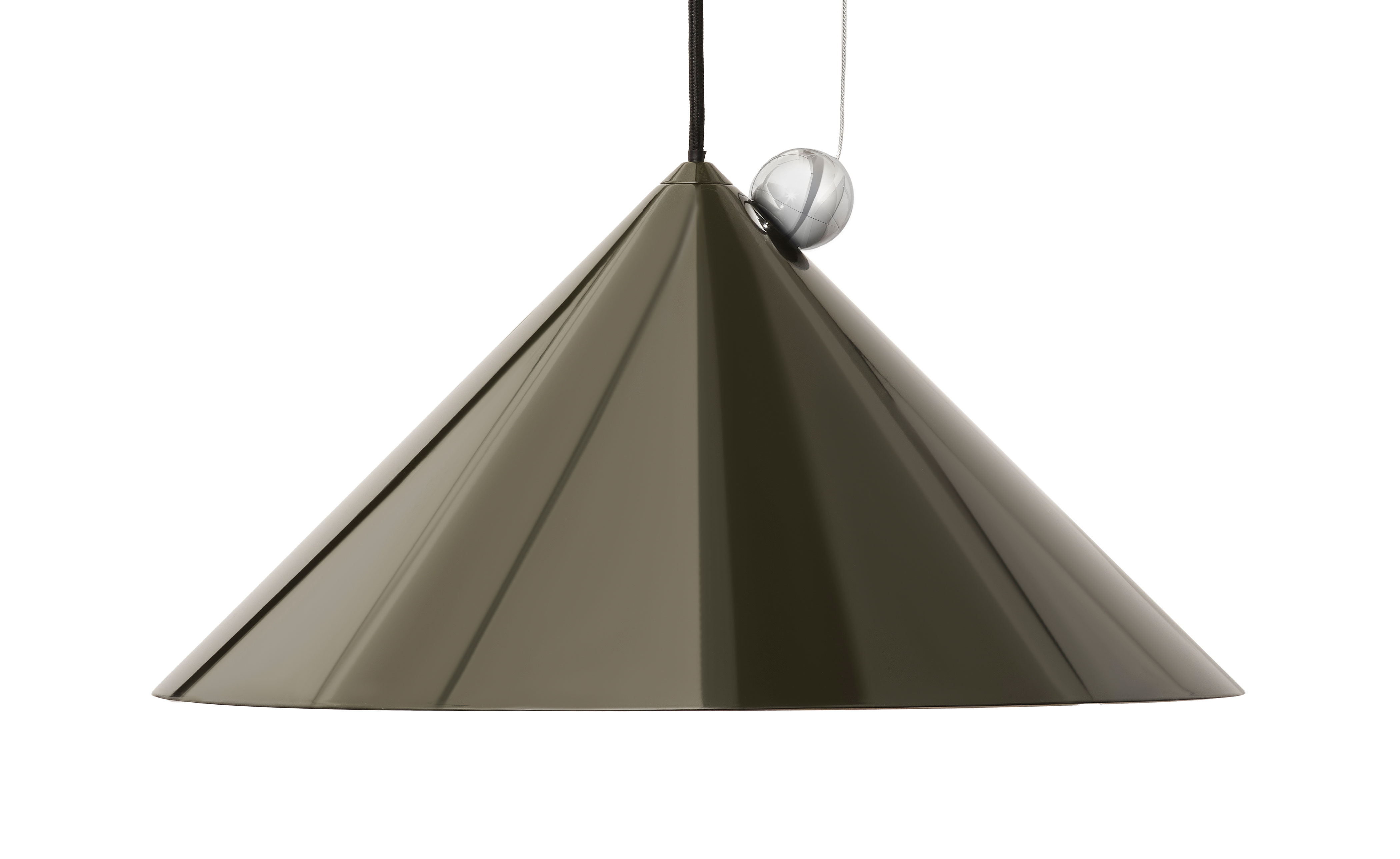 Inspired by the balance of conical forms and the principles of optical physics, it features a Fresnel lens to provide directional light. The POSE Pendant include a highly polished magnetic sphere and custom chrome ball joint, which enables precise directional adjustment for downlighting, backlighting or accent lighting. Available in two sizes, POSE is crafted from steel and comes with a 2700k LED replaceable light source.