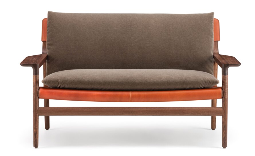 Sela Sofa is available with a choice of wide arms or narrow arms. Part of a family of seating including benches, dining chairs, lounge chairs and sofas.