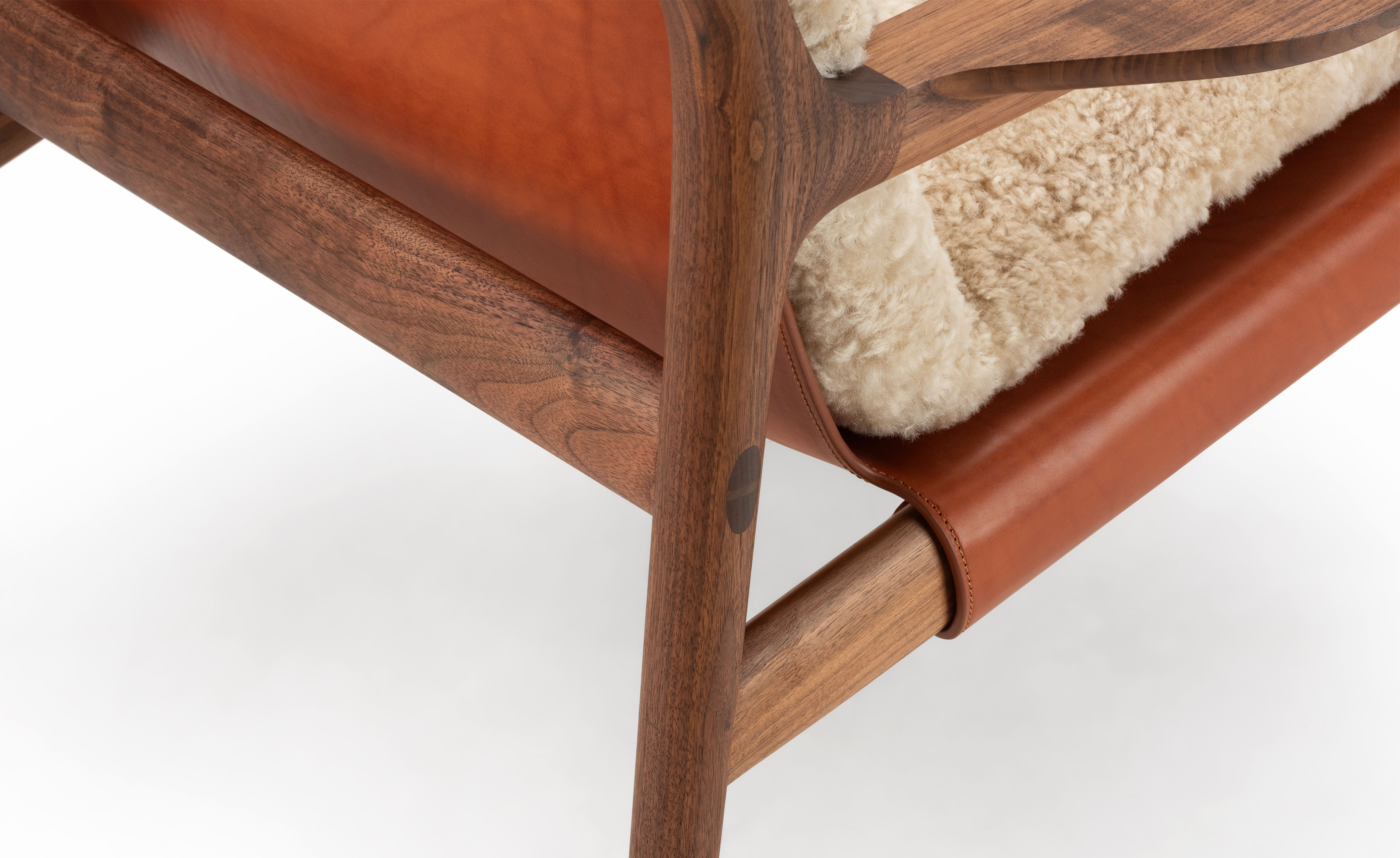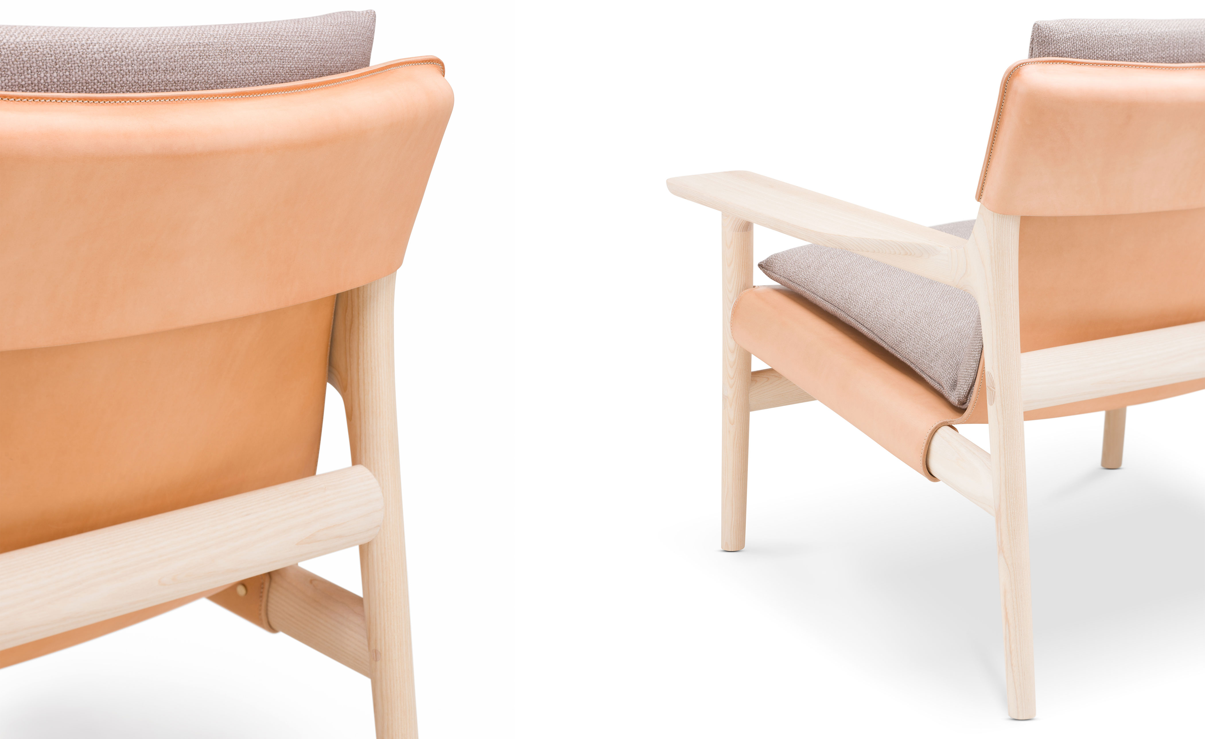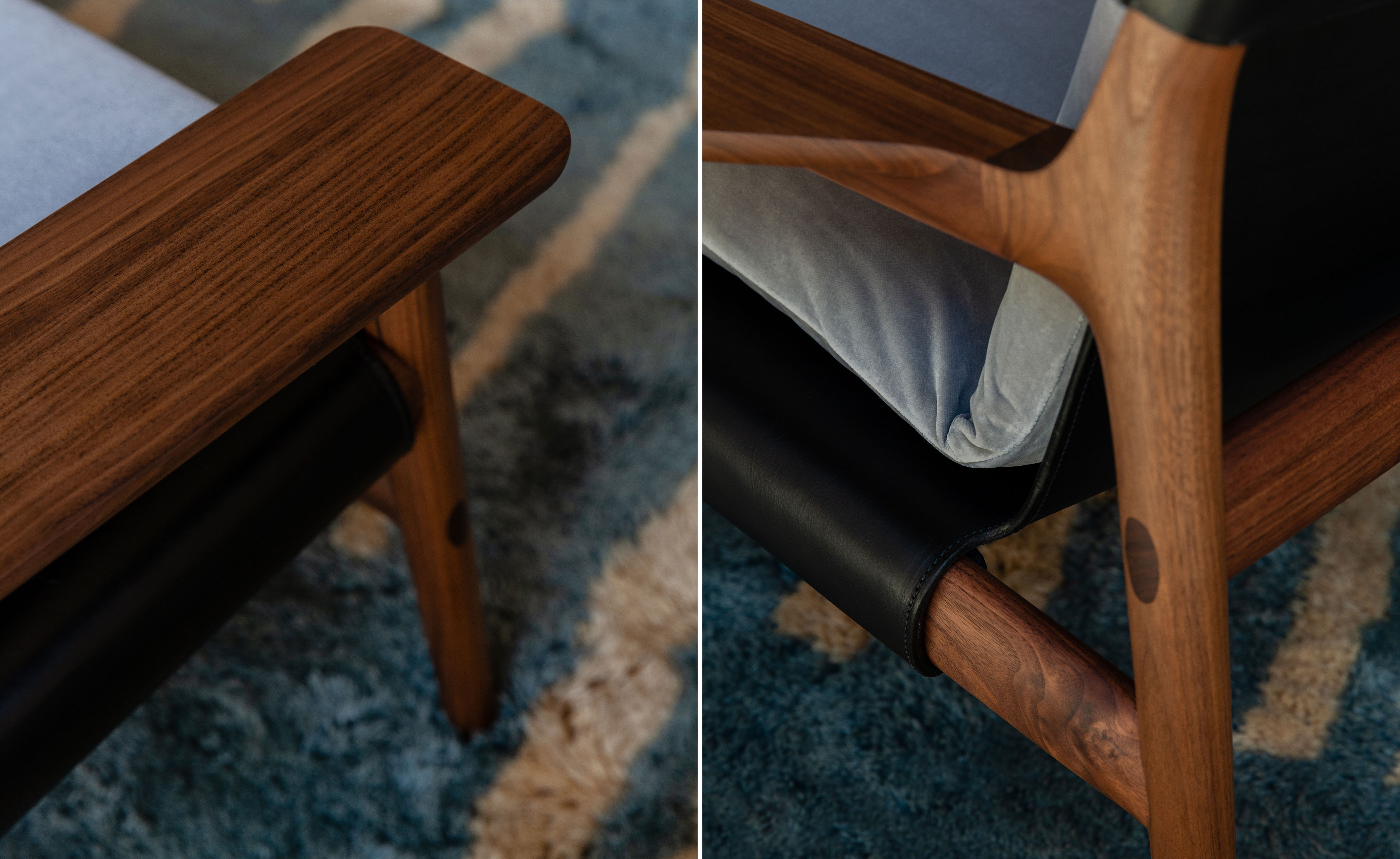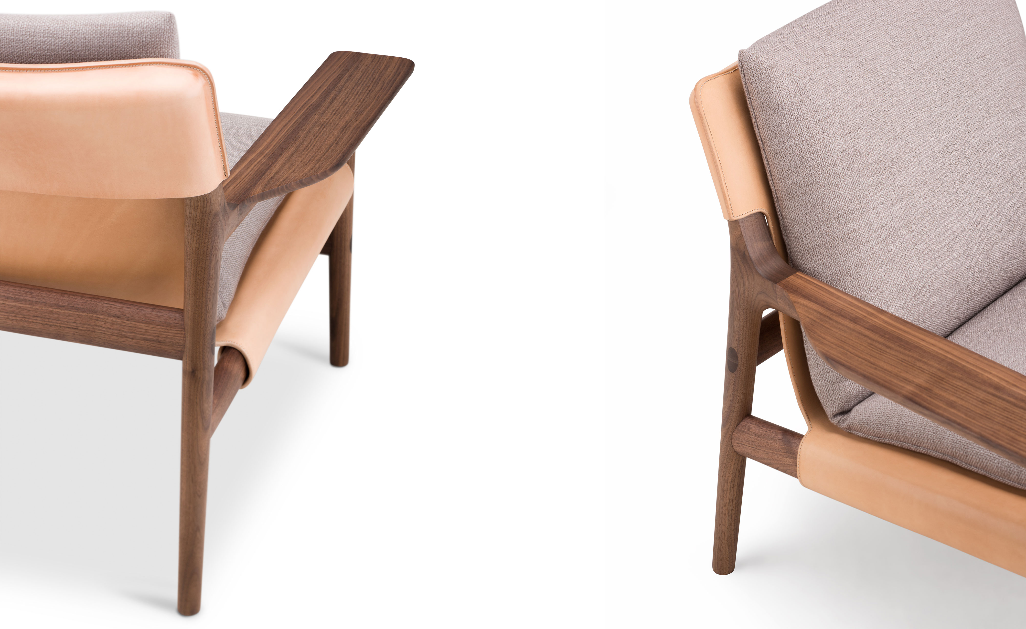 Sela lounge chair, designed by Luca Nichetto, reflects a passion for woodworking, with a tactile timber form with beautiful joinery. An exquisite leather seat, custom made by a Portuguese saddler, is suspended from the chair frame, then softened with upholstered cushions. Sela boasts an ageless appearance with a contemporary edge; the perfect blend of natural elements, craftsmanship, and timeless appeal.