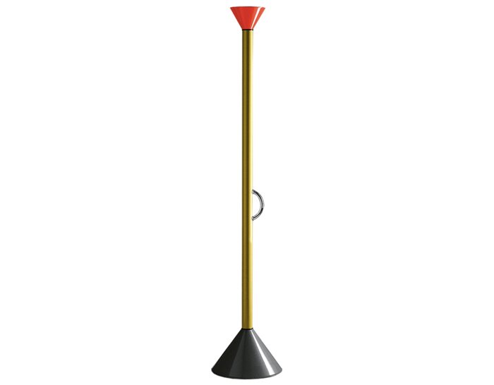 This iconic floor lamp from Ettore Sottsass, originally designed in 1982, is being reintroduced to the US market in 2010. This floor lamp offers indirect halogen lighting and features an aluminum body with painted, polished yellow finish and painted, polished grey steel base. the handle is polished chrome with a dimmer switch incorporated into body.