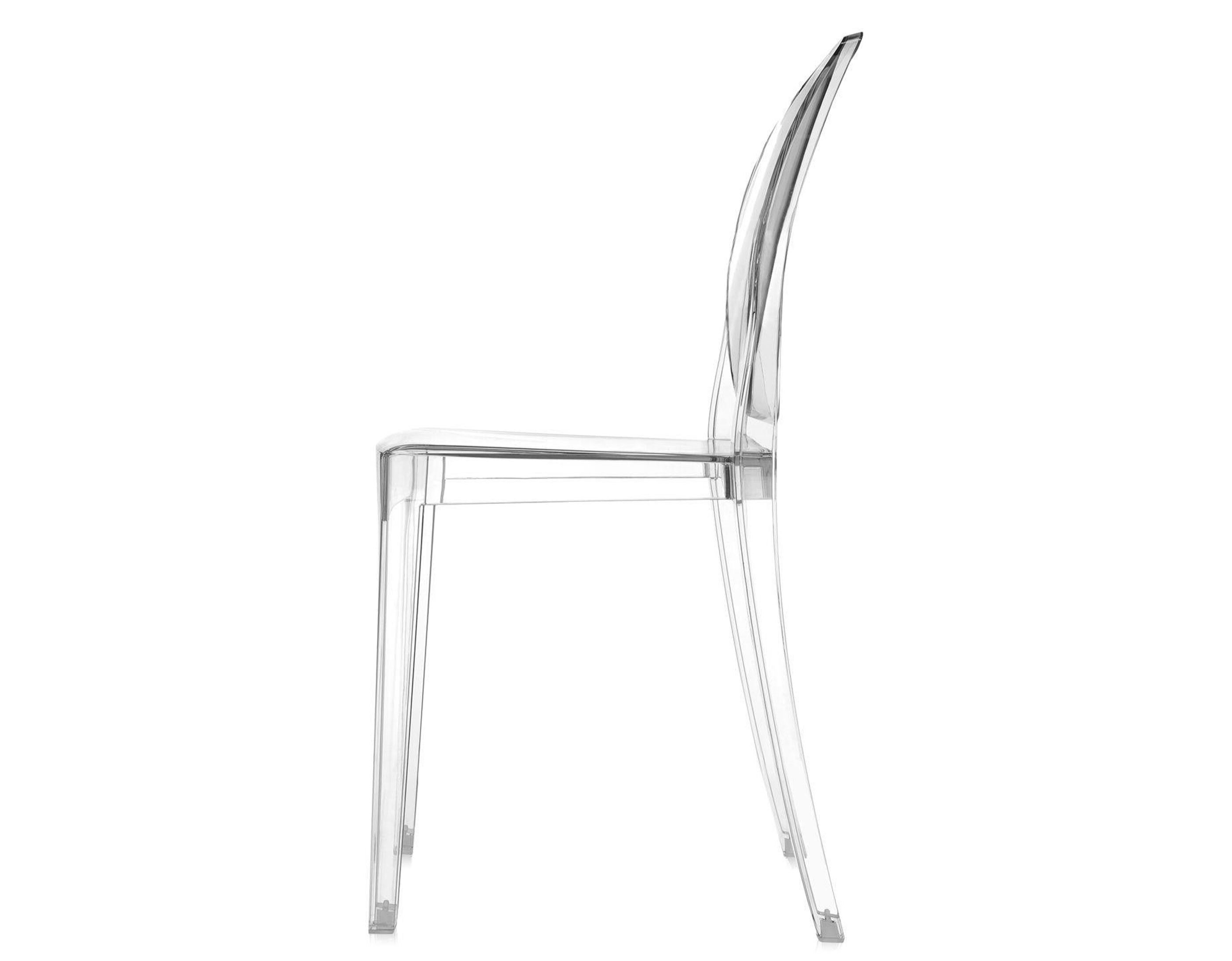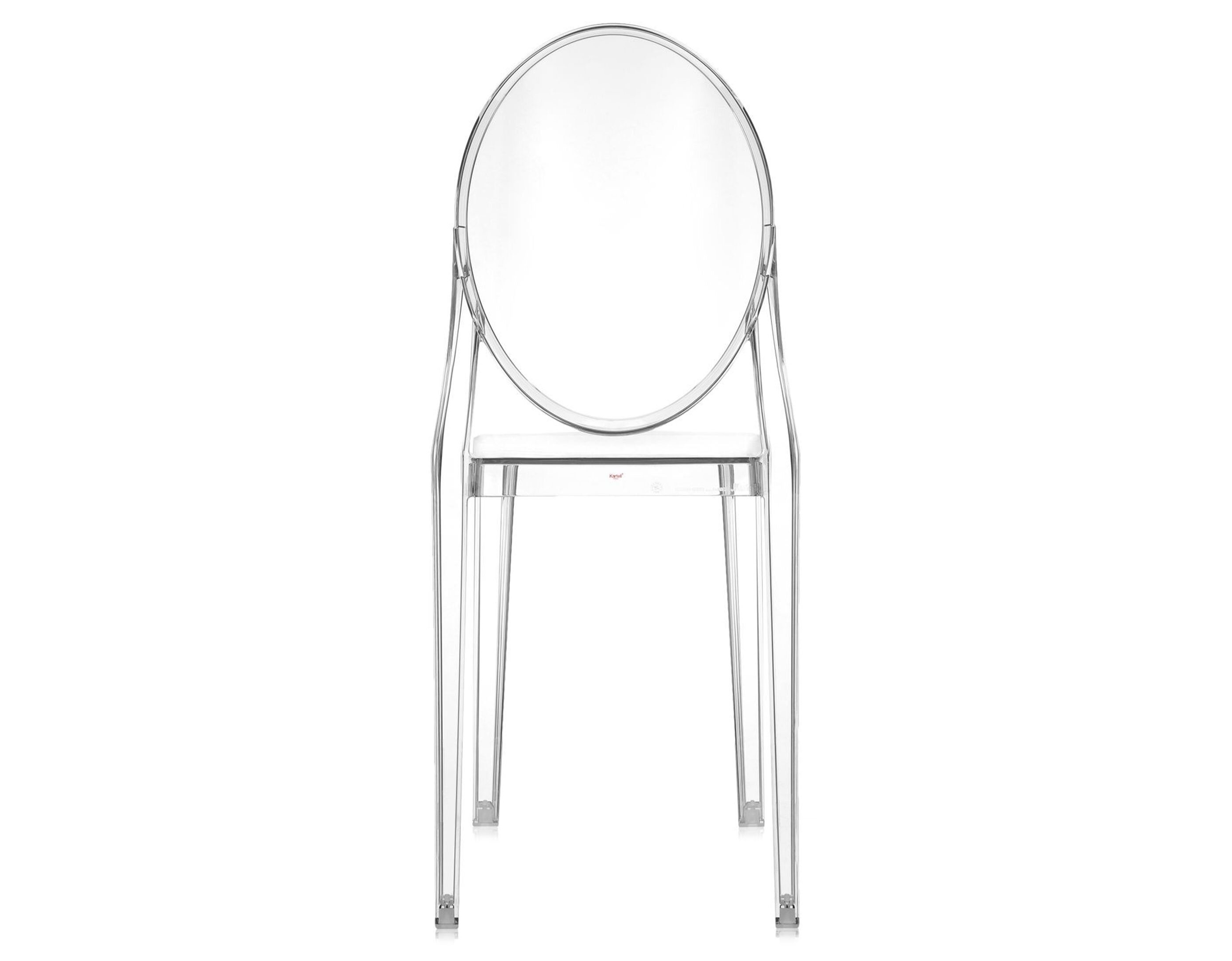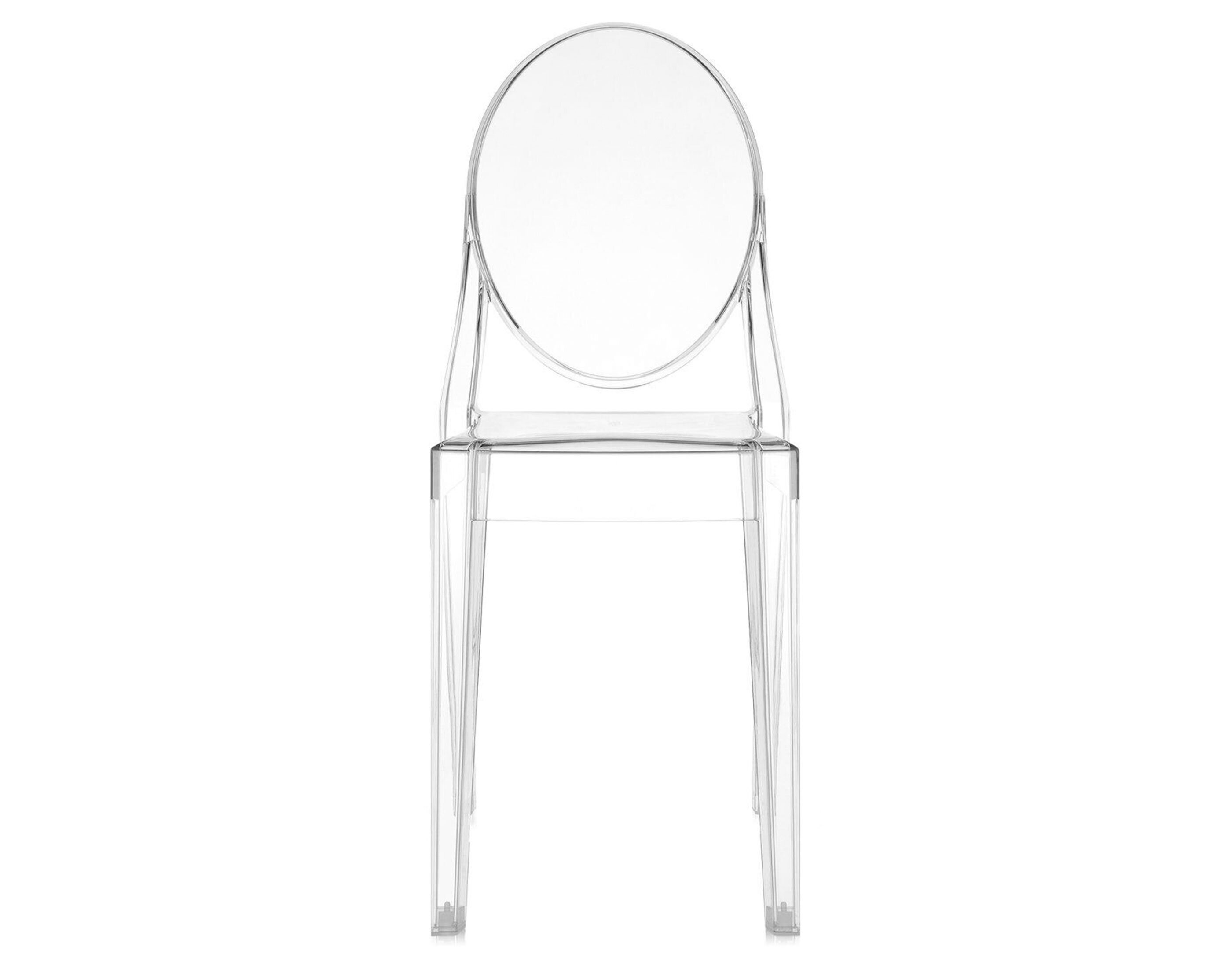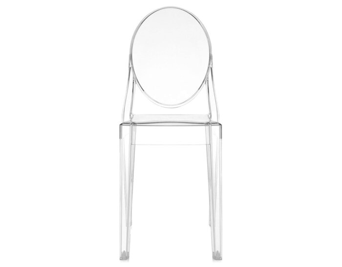 A chair designed following the classic lines of the Louis Ghost chair. The backrest is rounded, the shape evoking that of antique medallions; the simplicity and essentiality is that of the La Marie chair: the shape of the seat is more linear and geometric. Victoria Ghost is produced in clear or colored polycarbonate and is manufactured through single injection molding. It is stable, comfortable, resistant to impact, scratches and atmospheric agents.
