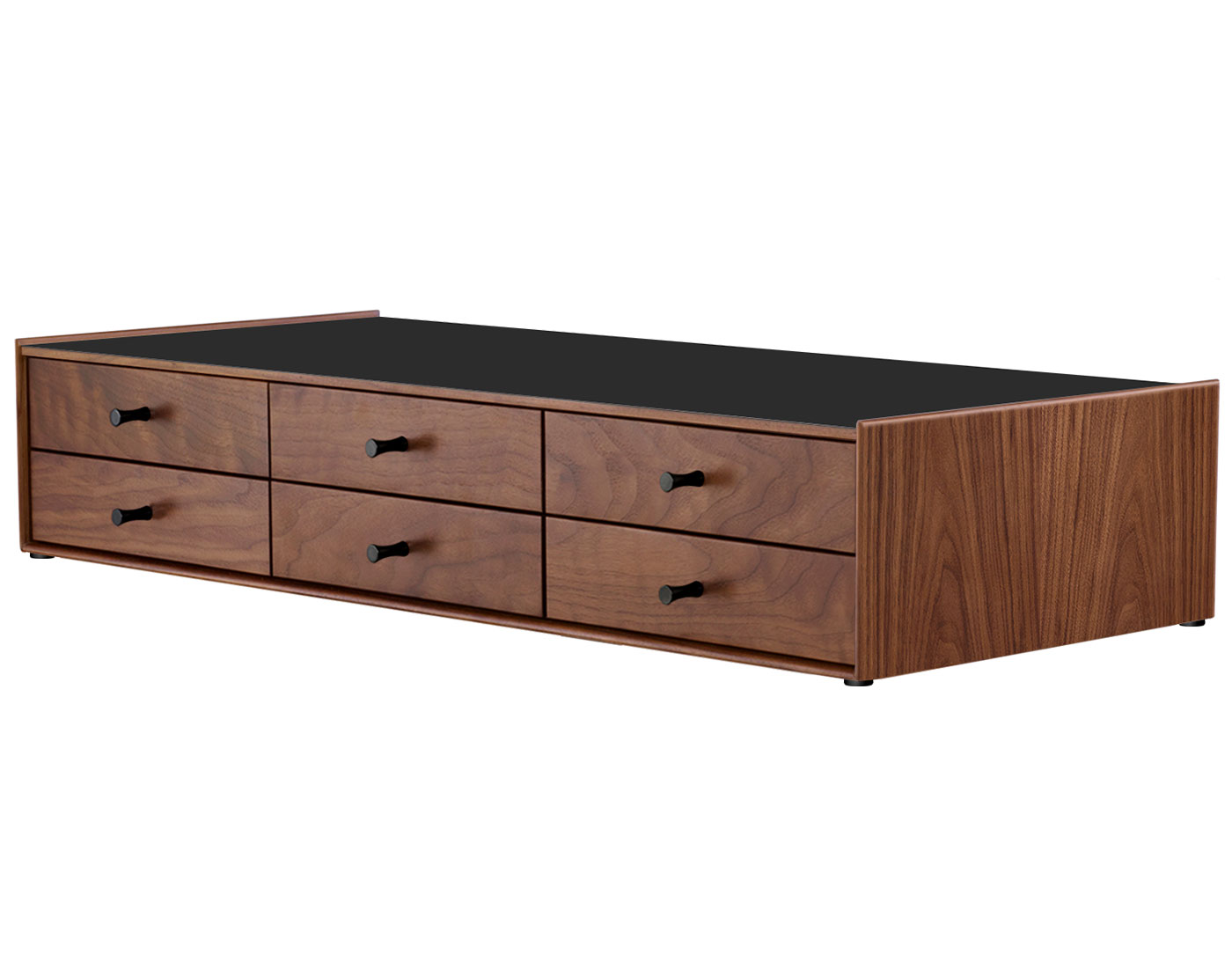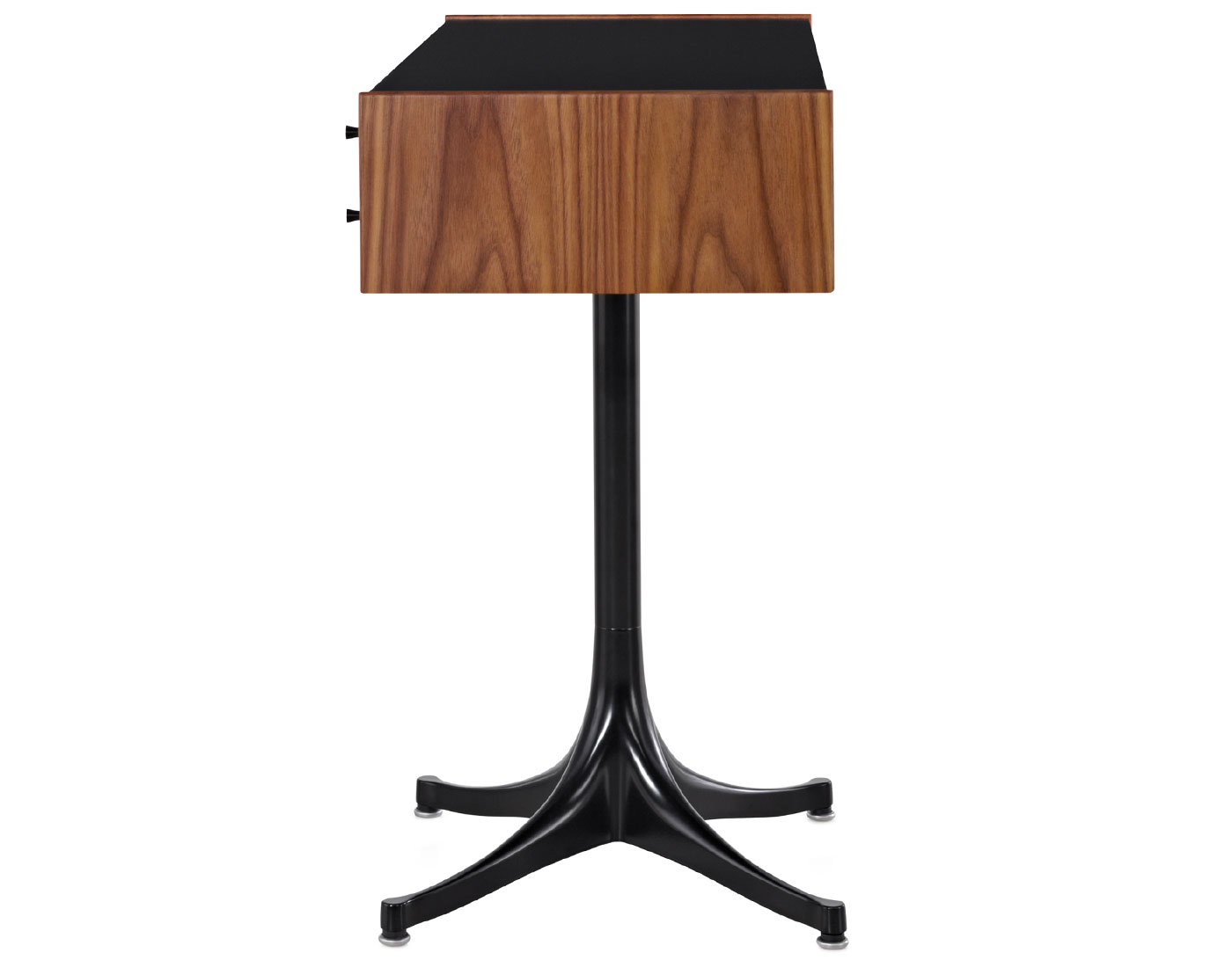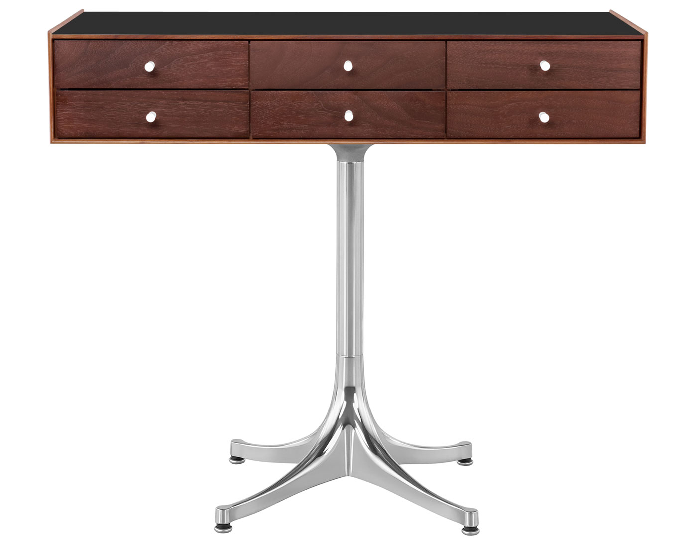 Each drawer is hand-fitted by cabinetmakers to ensure proper alignment so the wood-on-wood glides work smoothly. Each model has a drawer with dividers to organize and store small items. True to the original design, the chest body and drawers come in walnut, white ash or teak wood with laminate on the top surface and 4-star aluminum base. Drawers have metal knobs. Chest with pedestal has adjustable glides. Chest without pedestal has solid brass glides.