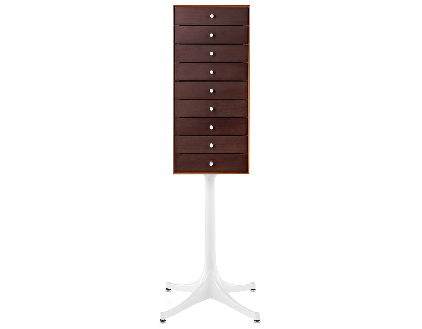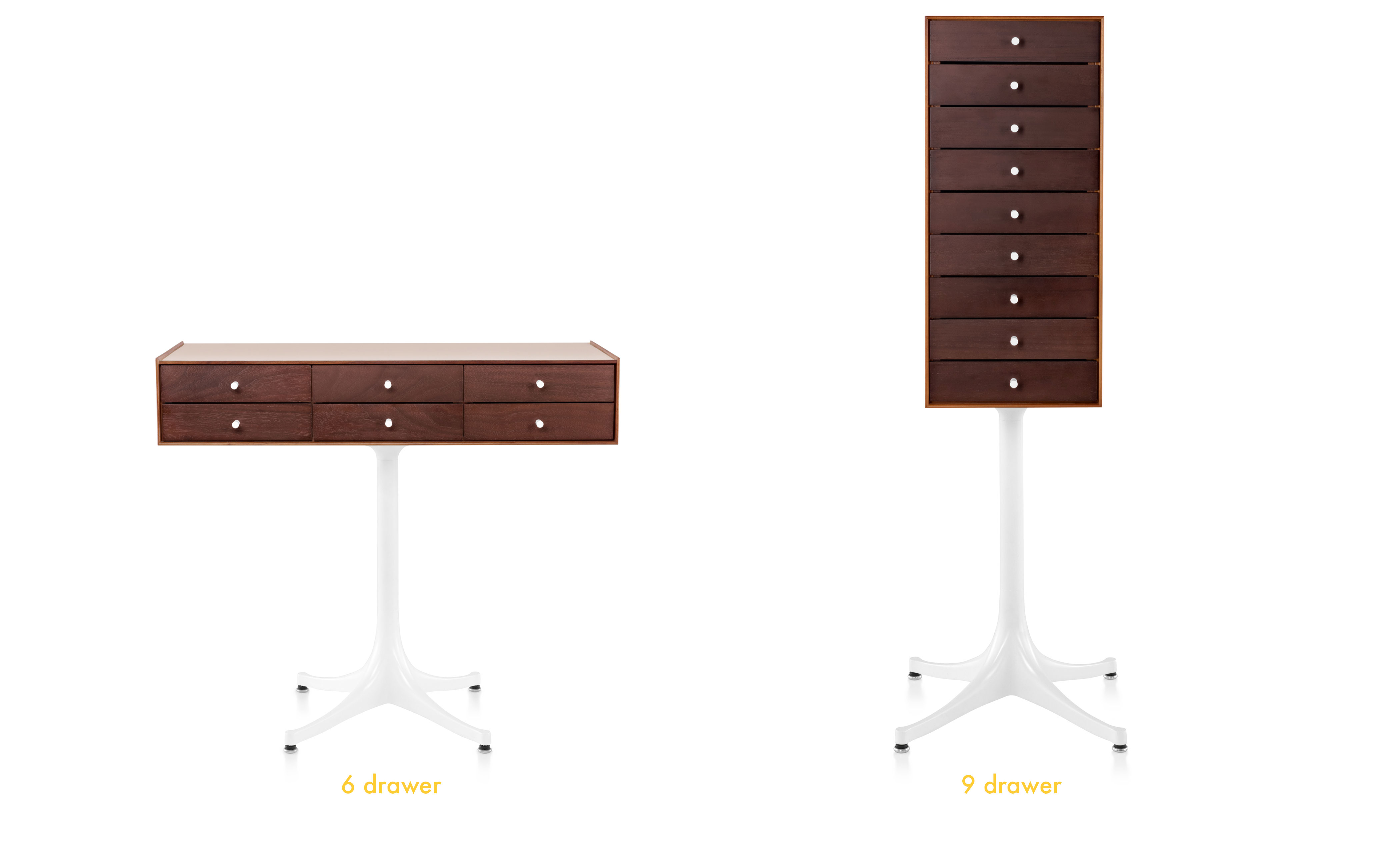 Each drawer is hand-fitted by cabinetmakers to ensure proper alignment so the wood-on-wood glides work smoothly. Each model has a drawer with dividers to organize and store small items. True to the original design, the chest body and drawers come in walnut, white ash or teak wood and 4-star aluminum base. Drawers have metal knobs. Chest with pedestal has adjustable glides. Chest without pedestal has solid brass glides.