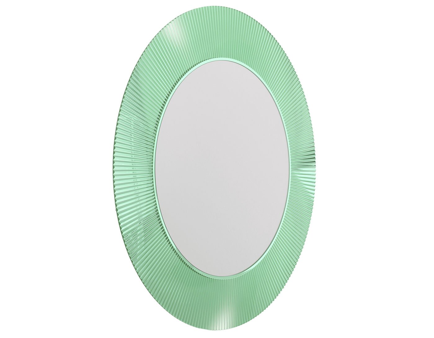A round mirror in a frame with a pleated effect which creates a suffused play of refractions. The All Saints mirror is a well-defined graphic touch that evokes a heritage connotation and takes its inspiration from one of the most ironic pieces in the Kartell collection: the Bourgie lamp and its unmistakable Baroque style. The chance to switch from transparencies to the chrome-plated, metallic or gold leaf models makes this mirror an extremely versatile and adaptable design piece able to create contemporary and essential settings or eccentric and outside the box environments.