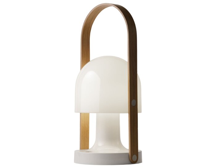 The FollowMe's oak handle invites you to carry it with you. It utilizes LED technology and has a tilting polycarbonate screen that offers both cozy atmospheric light and direct reading light. A three-position dimmer regulates the light intensity, allowing for a continuous output of between 5 to 20 hours, and the USB charging cable makes charging your FollowMe quick and easy.
